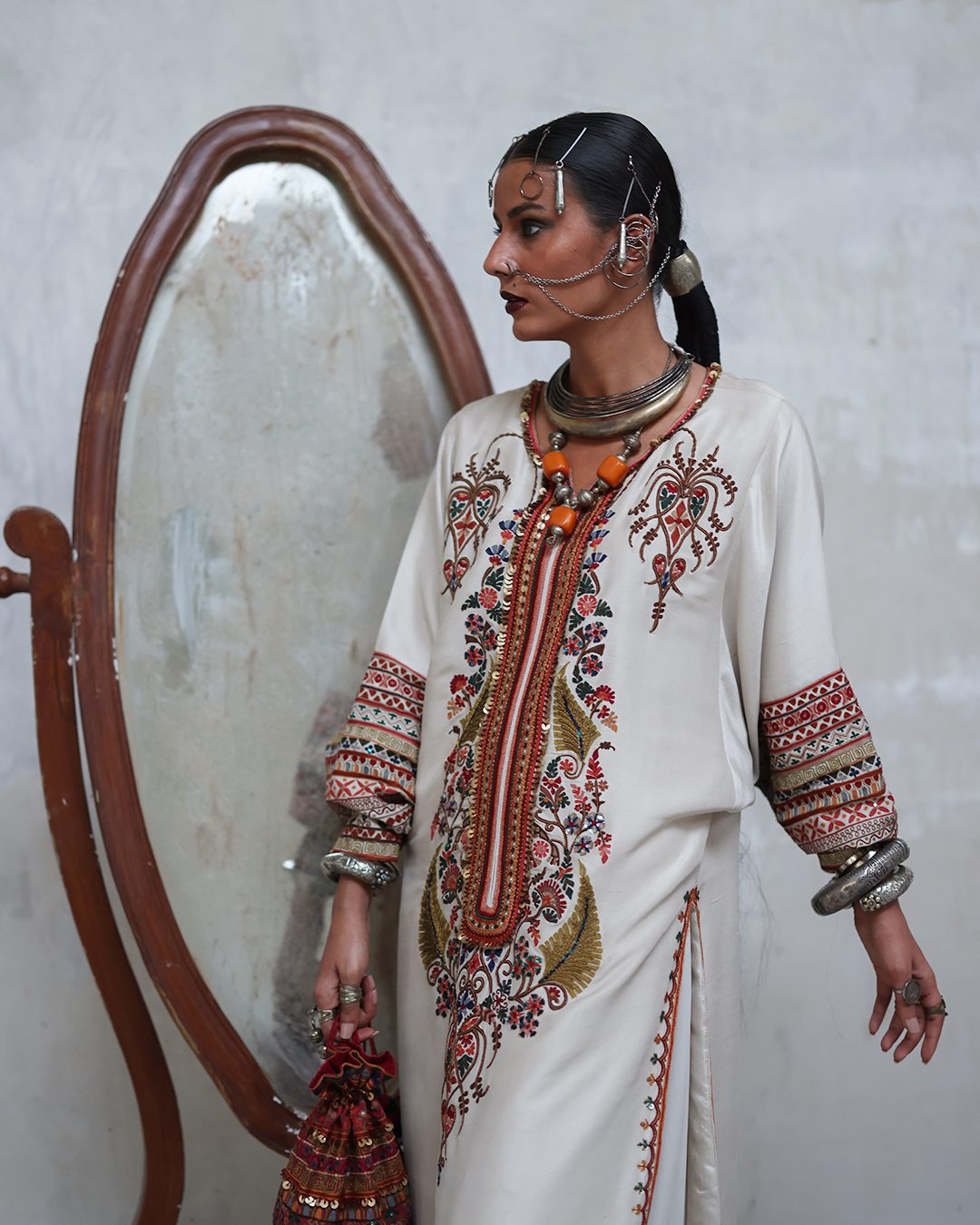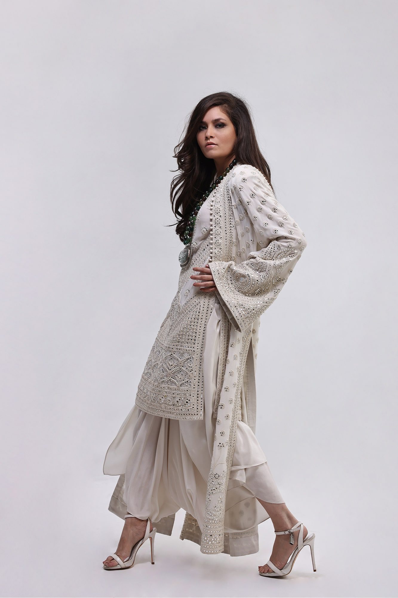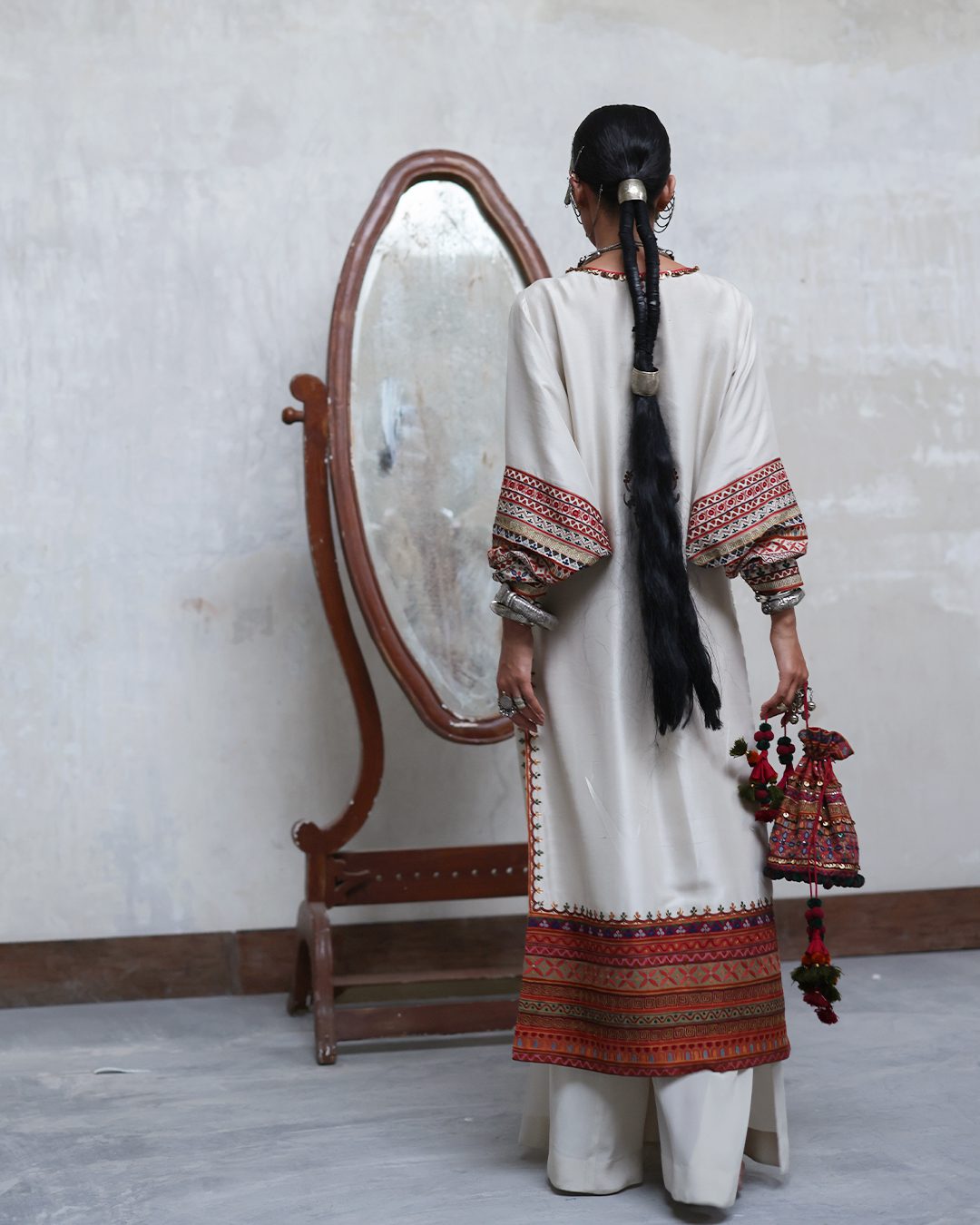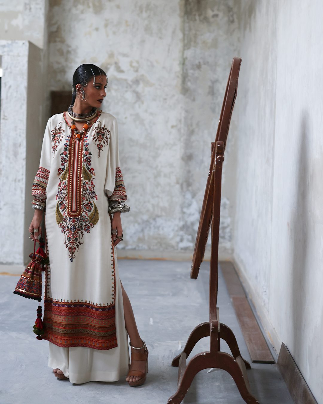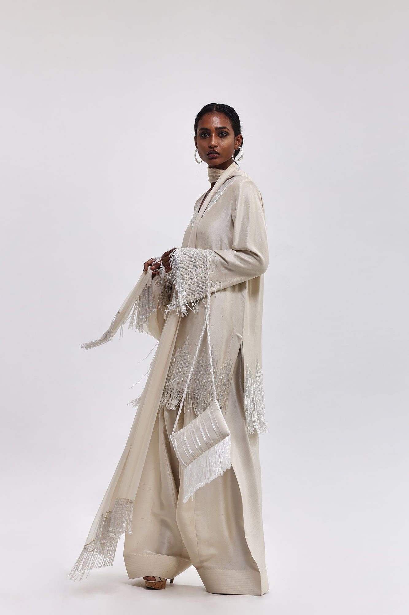 kaftan: pure raw silk, flared flowy pants: pure crepe