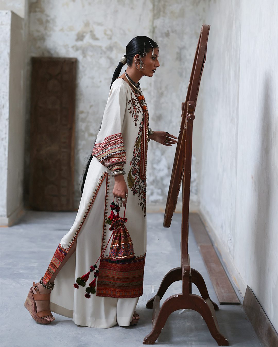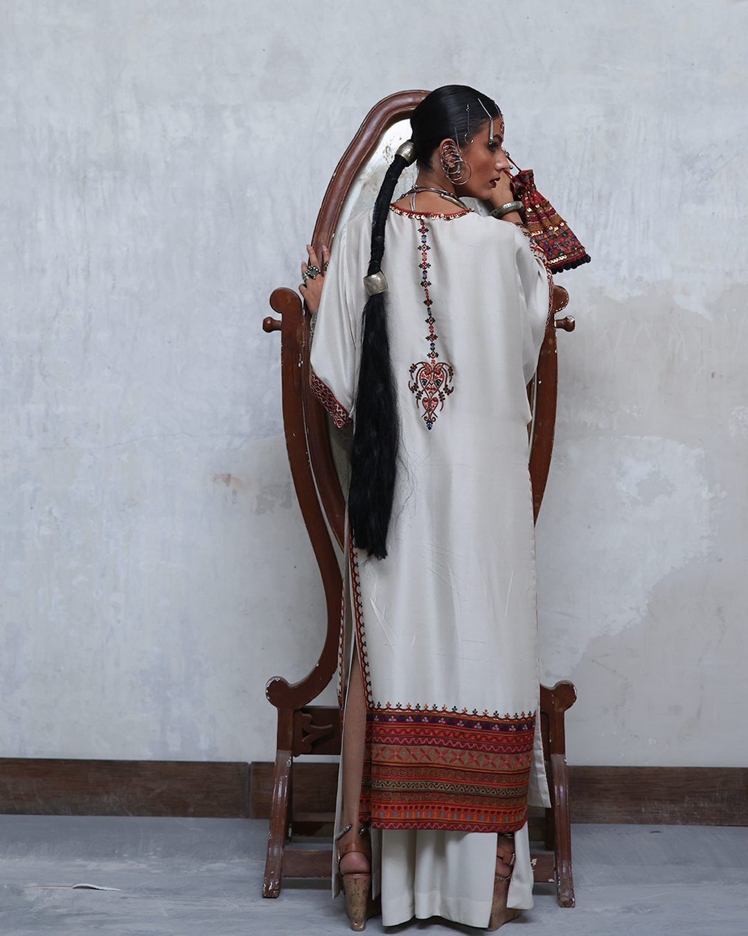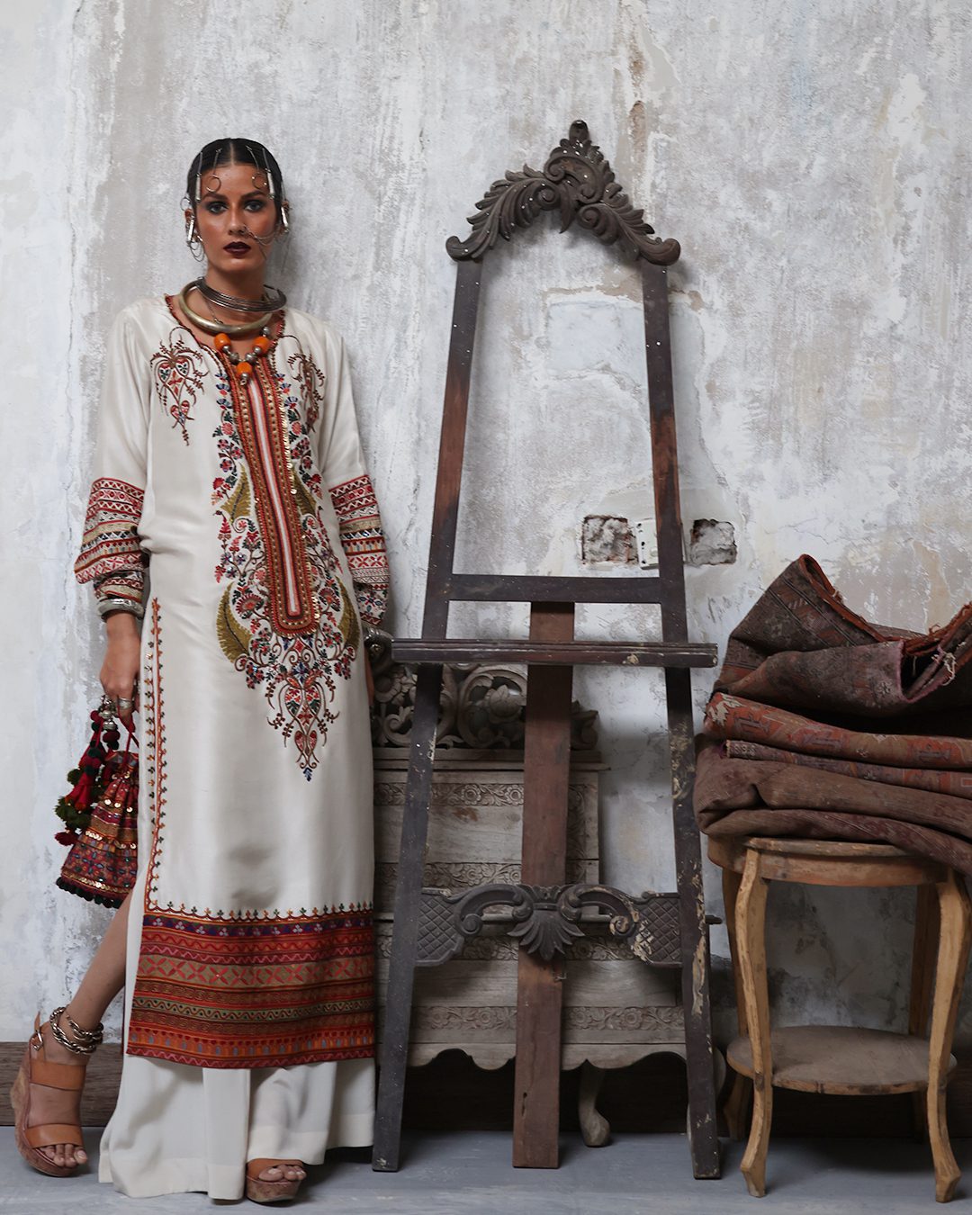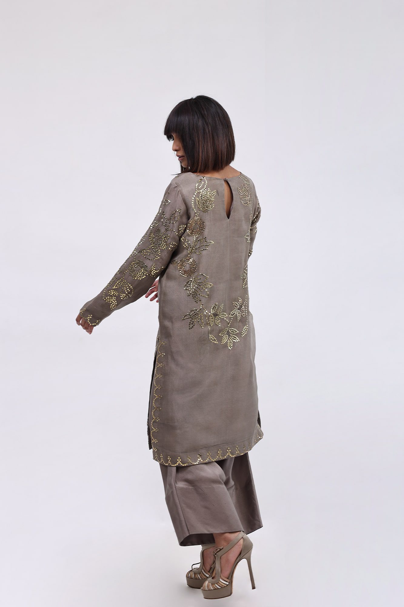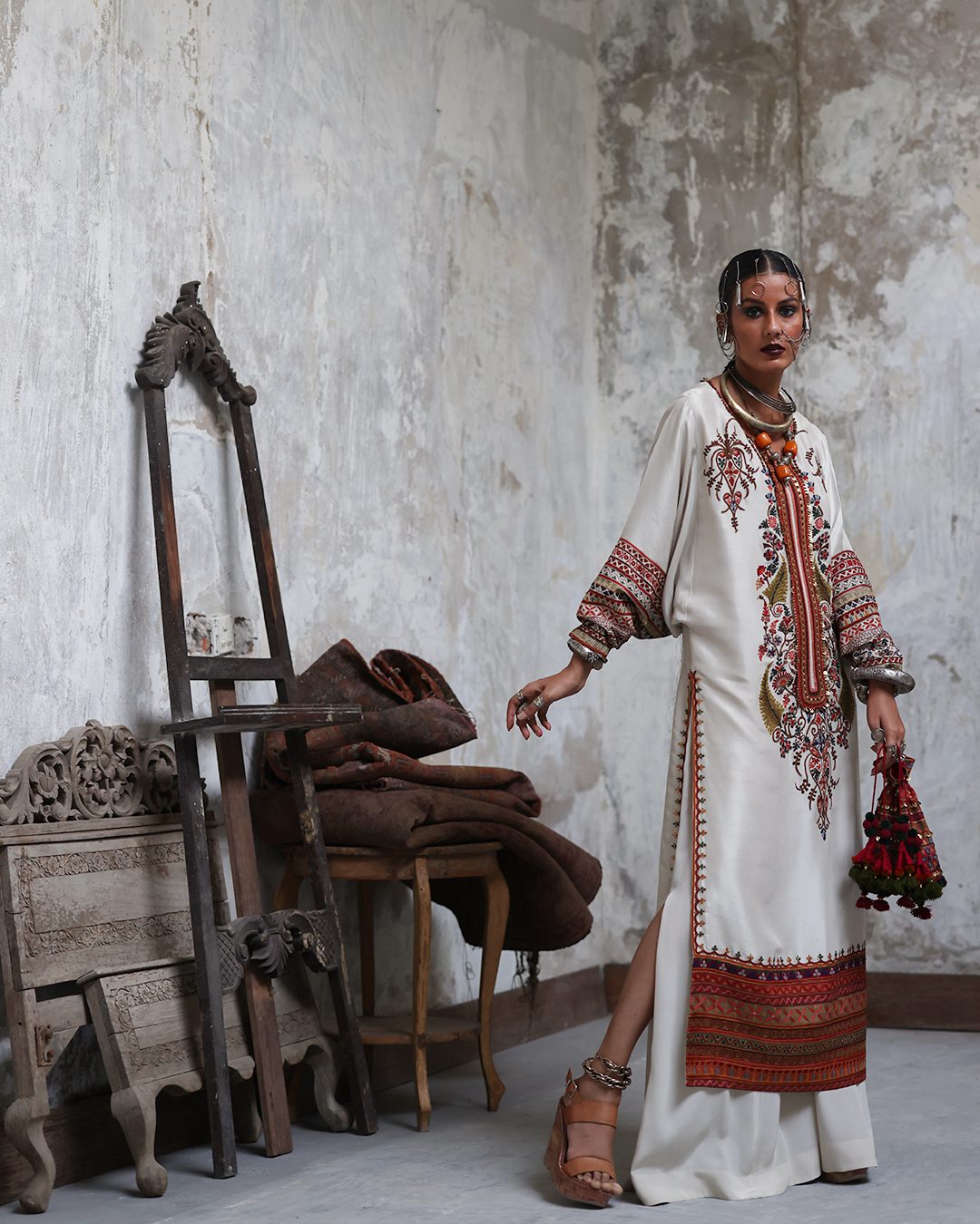 kaftan: pure raw silk, flared flowy pants: pure crepe