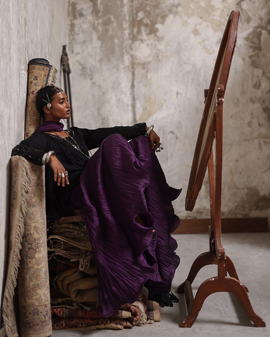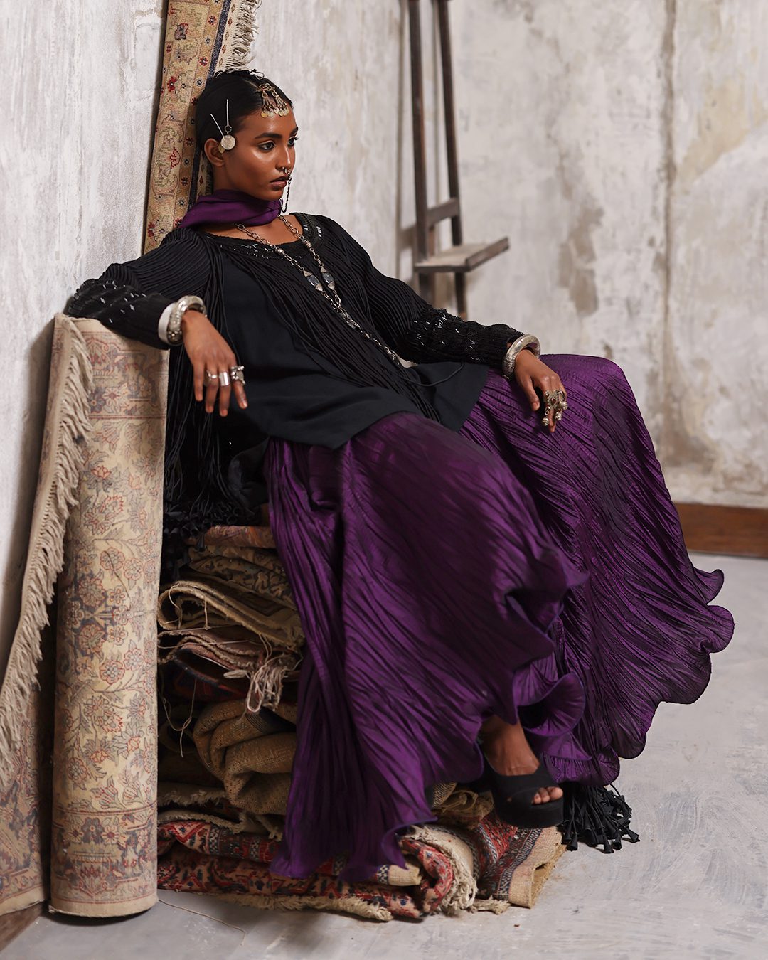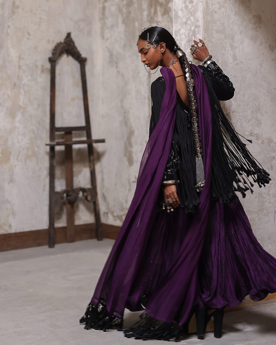 Purple and black tassels work embellished shirt paired with crushed lehenga and dupatta