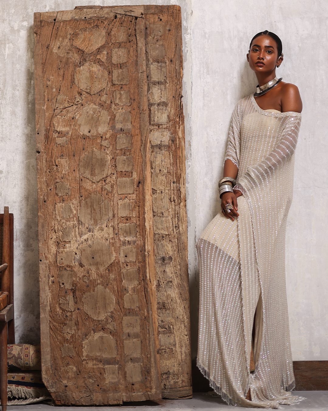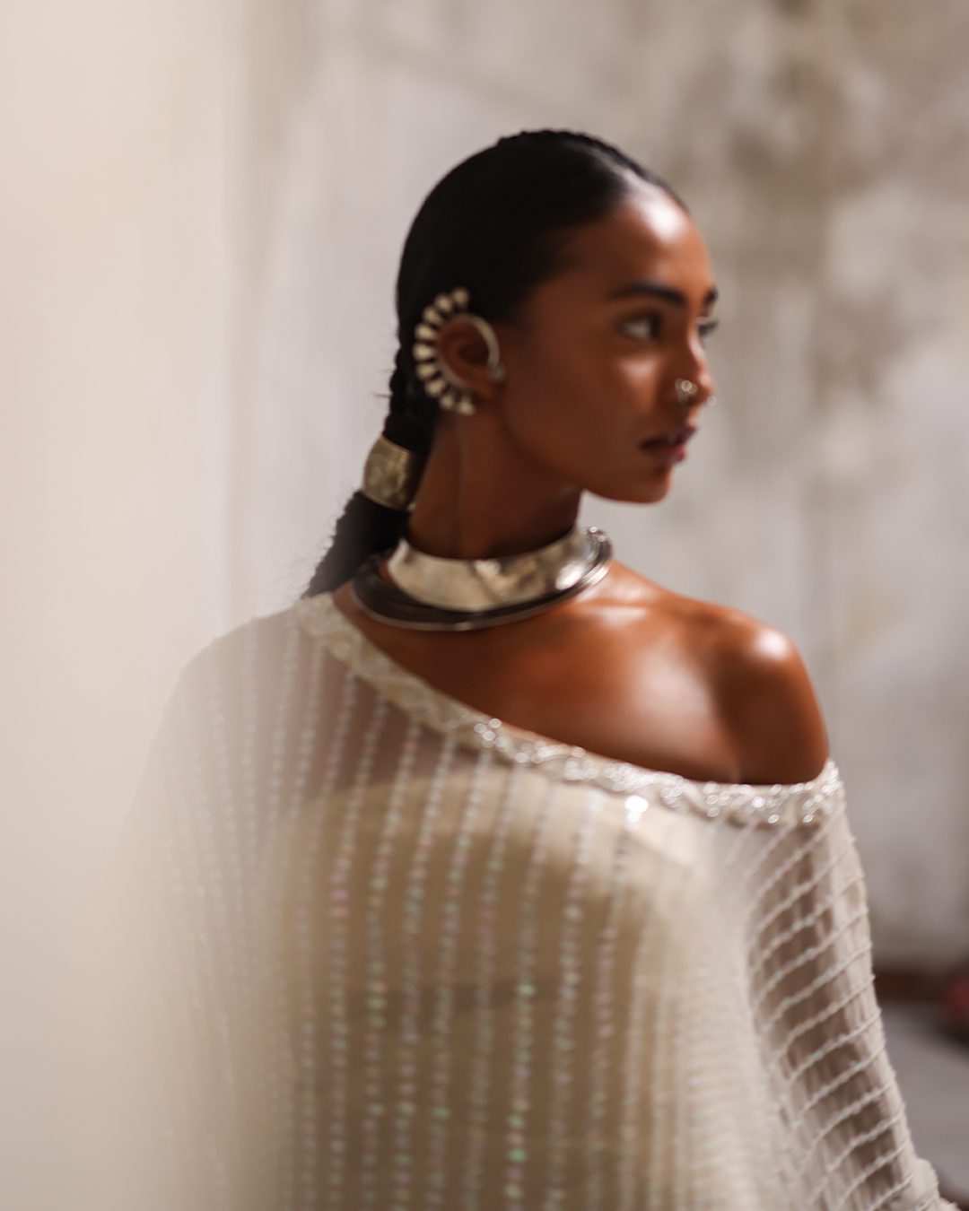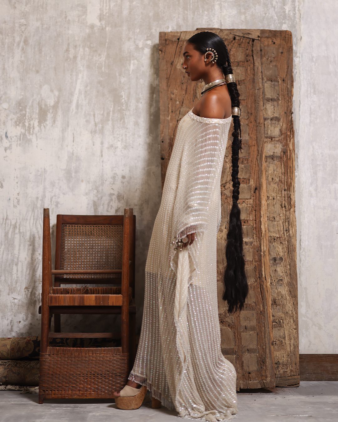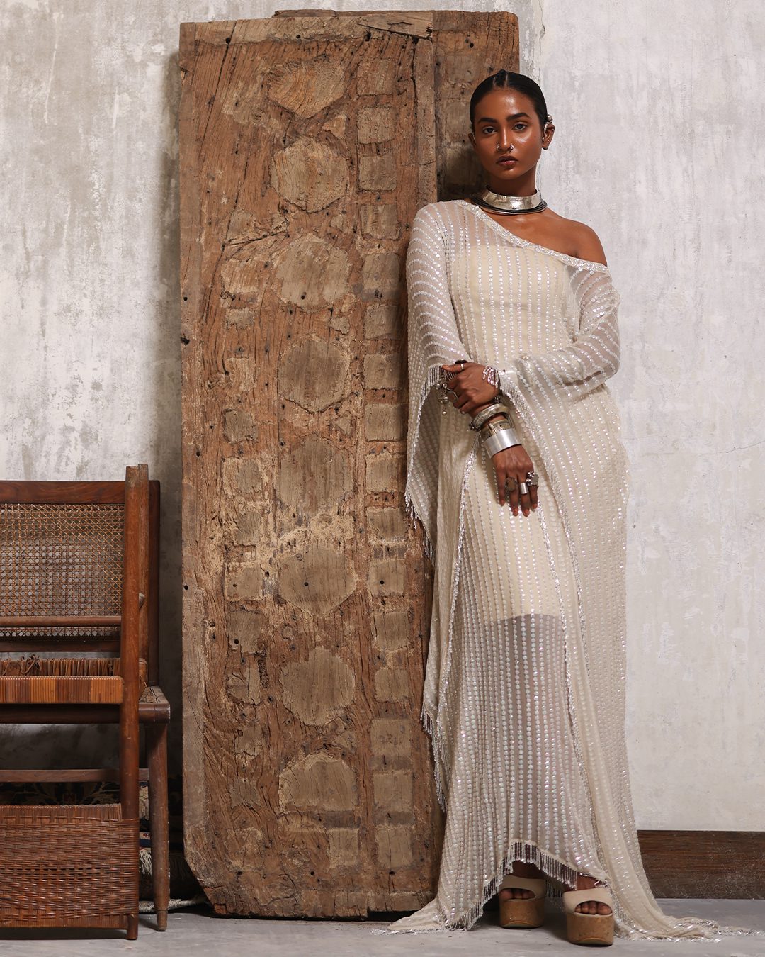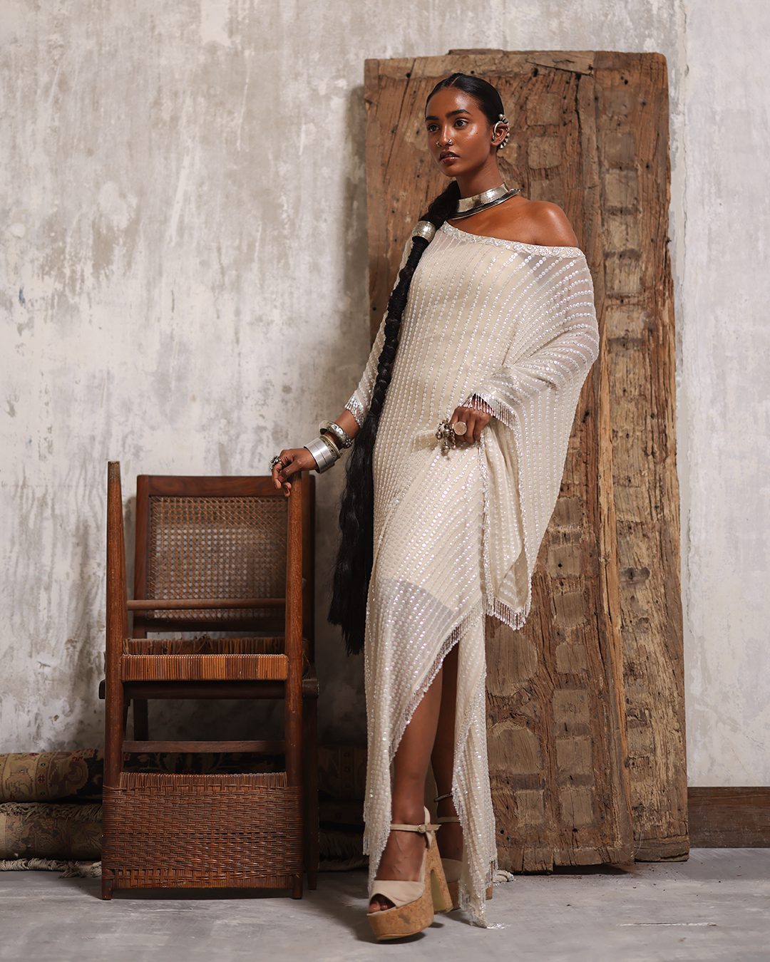 Ivory sequins embellished poncho paired with short dress Disclaimer No customization in color, size or design is allowed