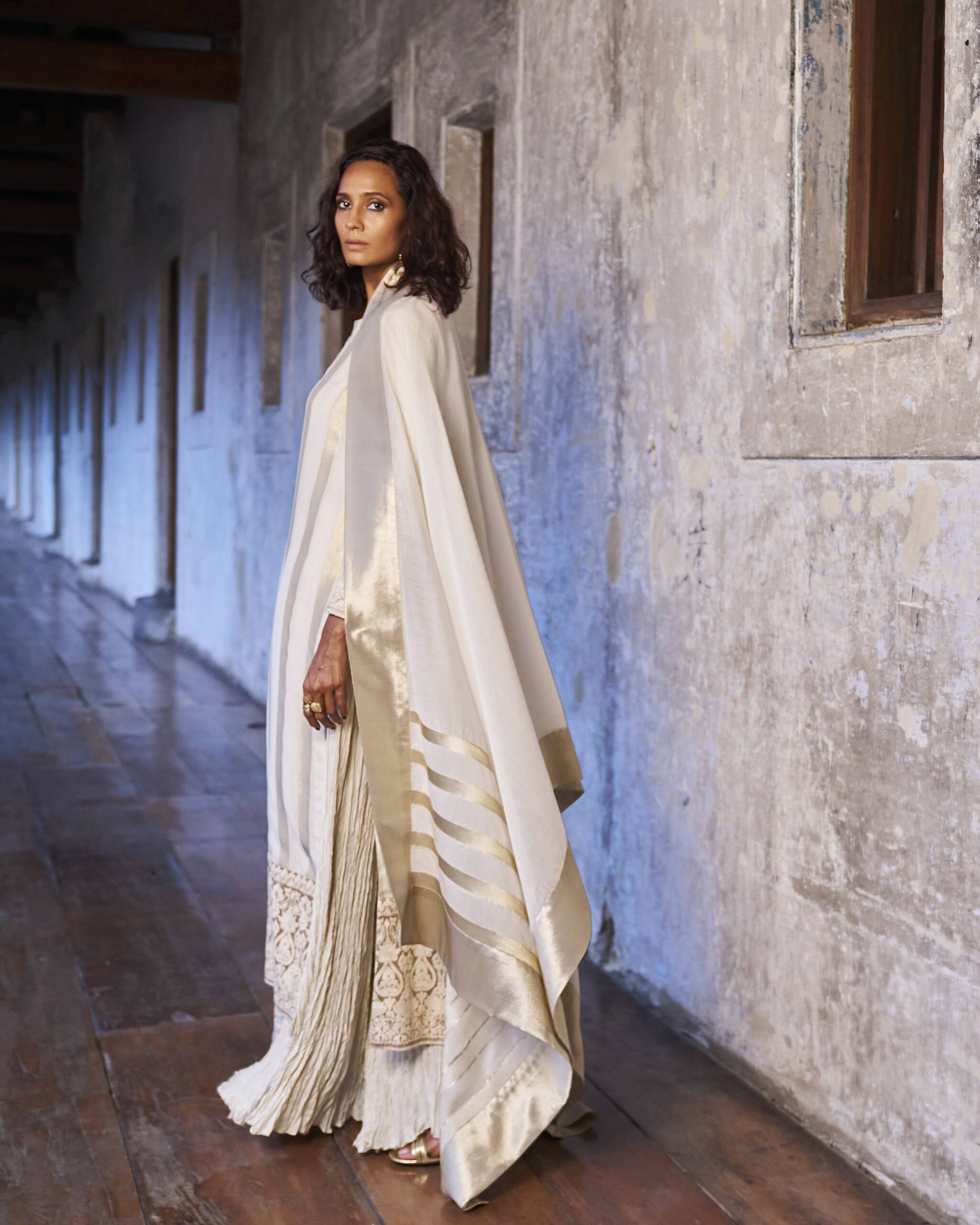 Dupatta: It is crafted in-house made ivory pure cotton fabric elevated with integrated zari stripes. The edges are finished with gold lama tissue.
