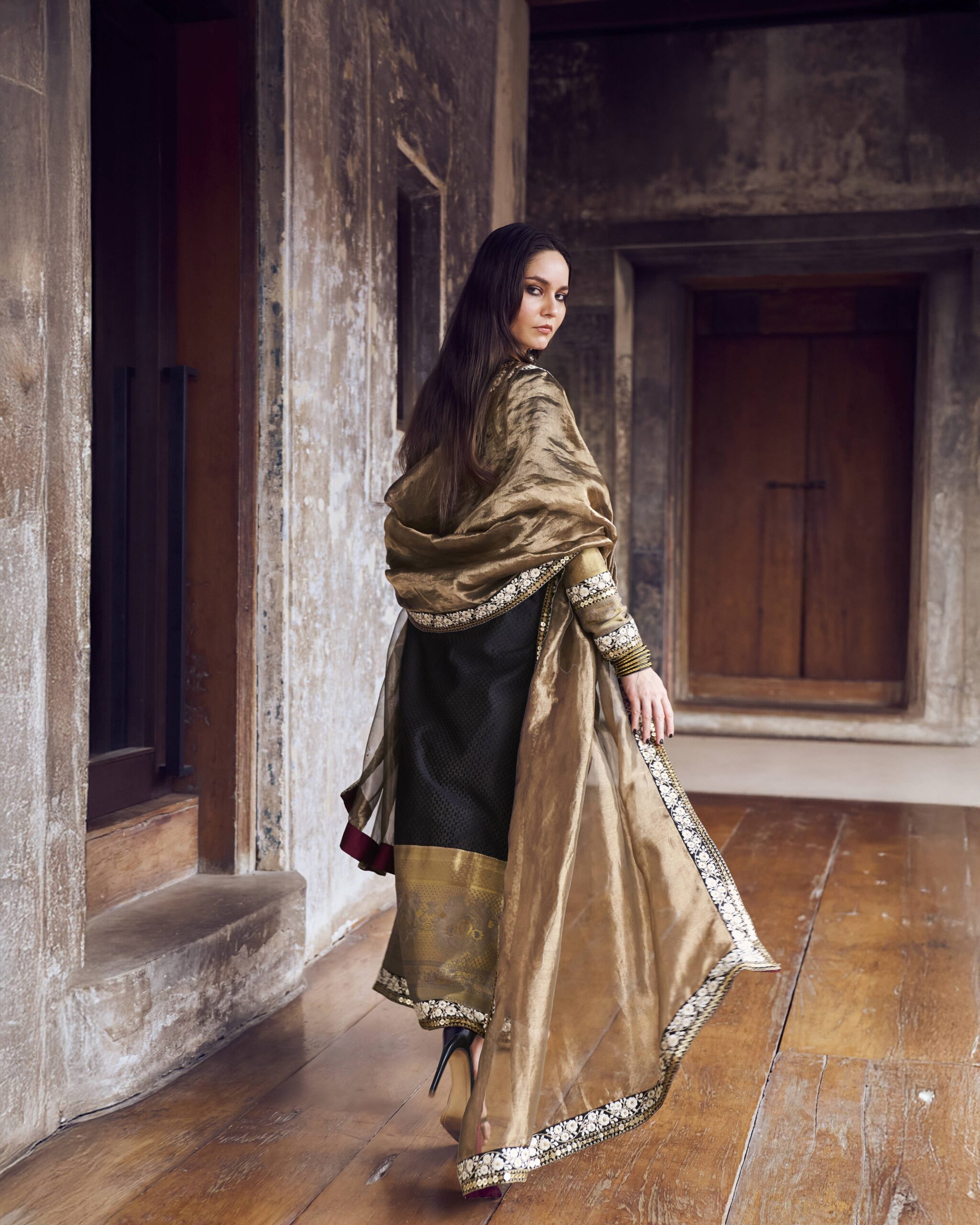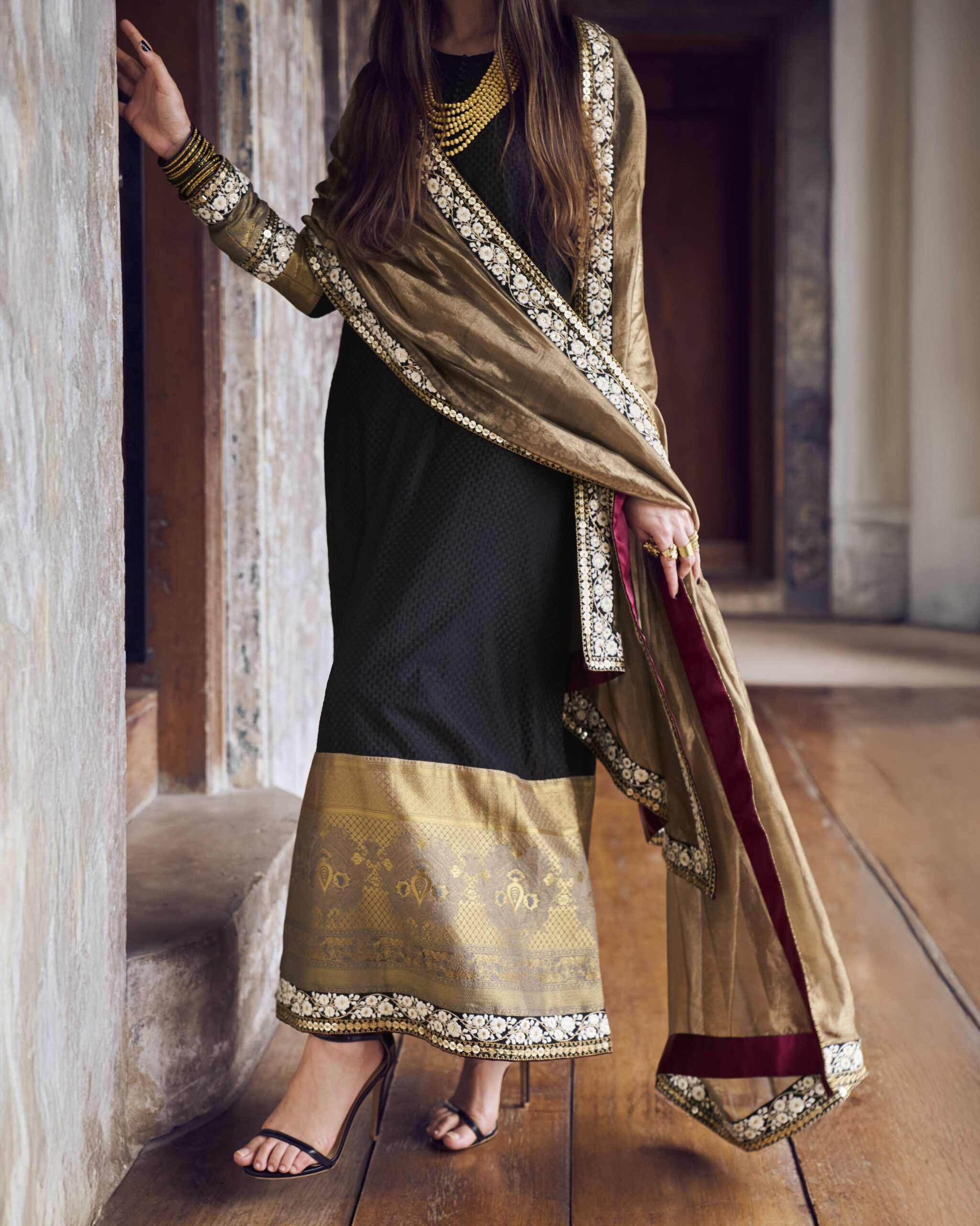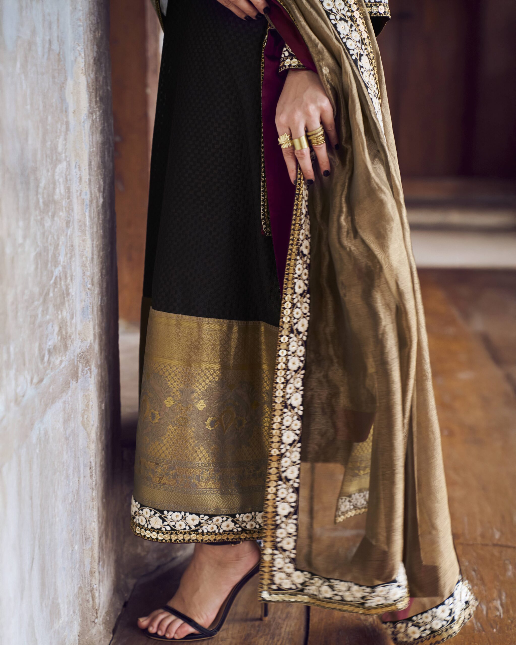 Shirt: Black pure cotton in- house made self-textured long shirt featuring a broad, thick gold banarasi border finished with a layer of intricate embriodery along its edge using thread, zari and sequins work.