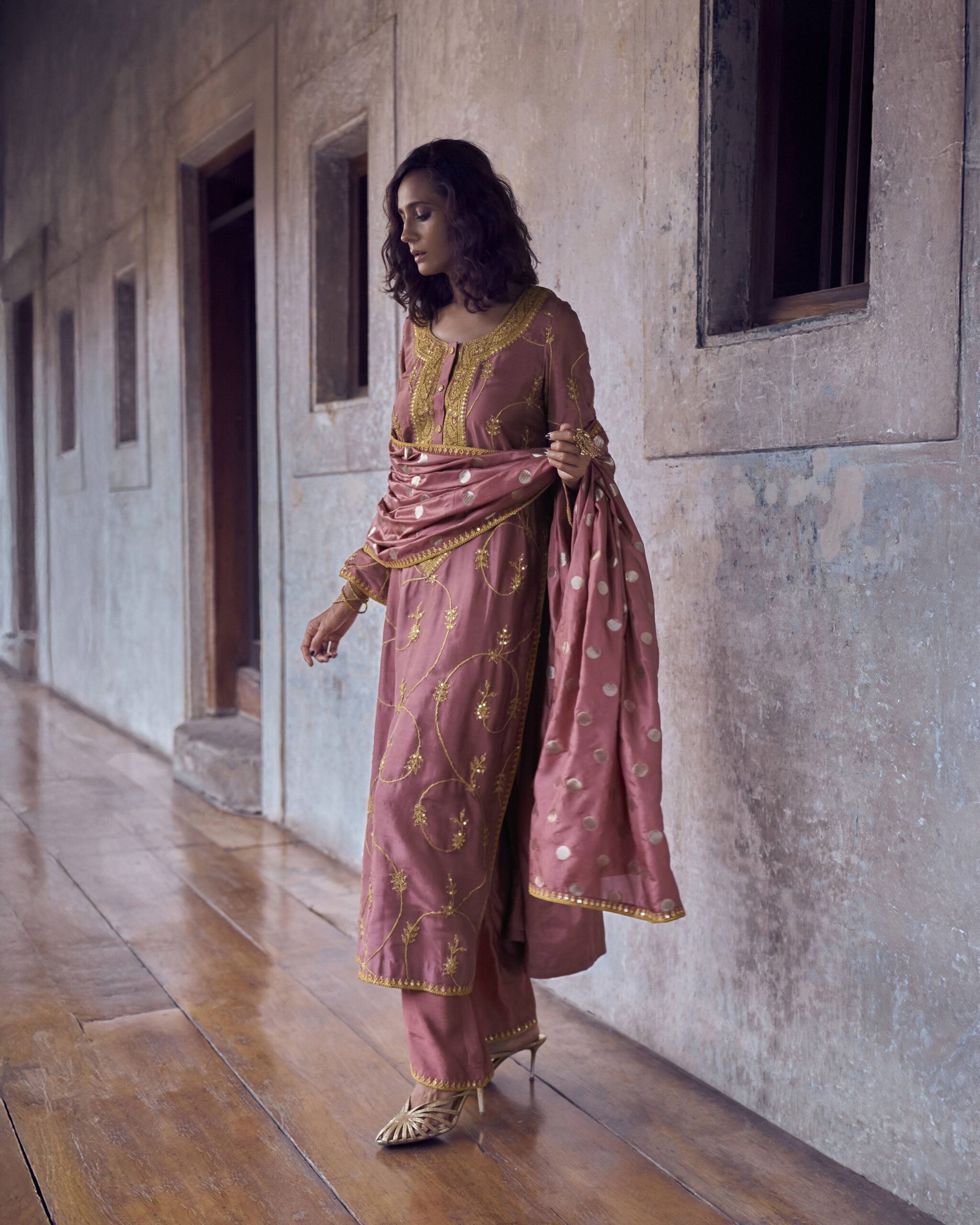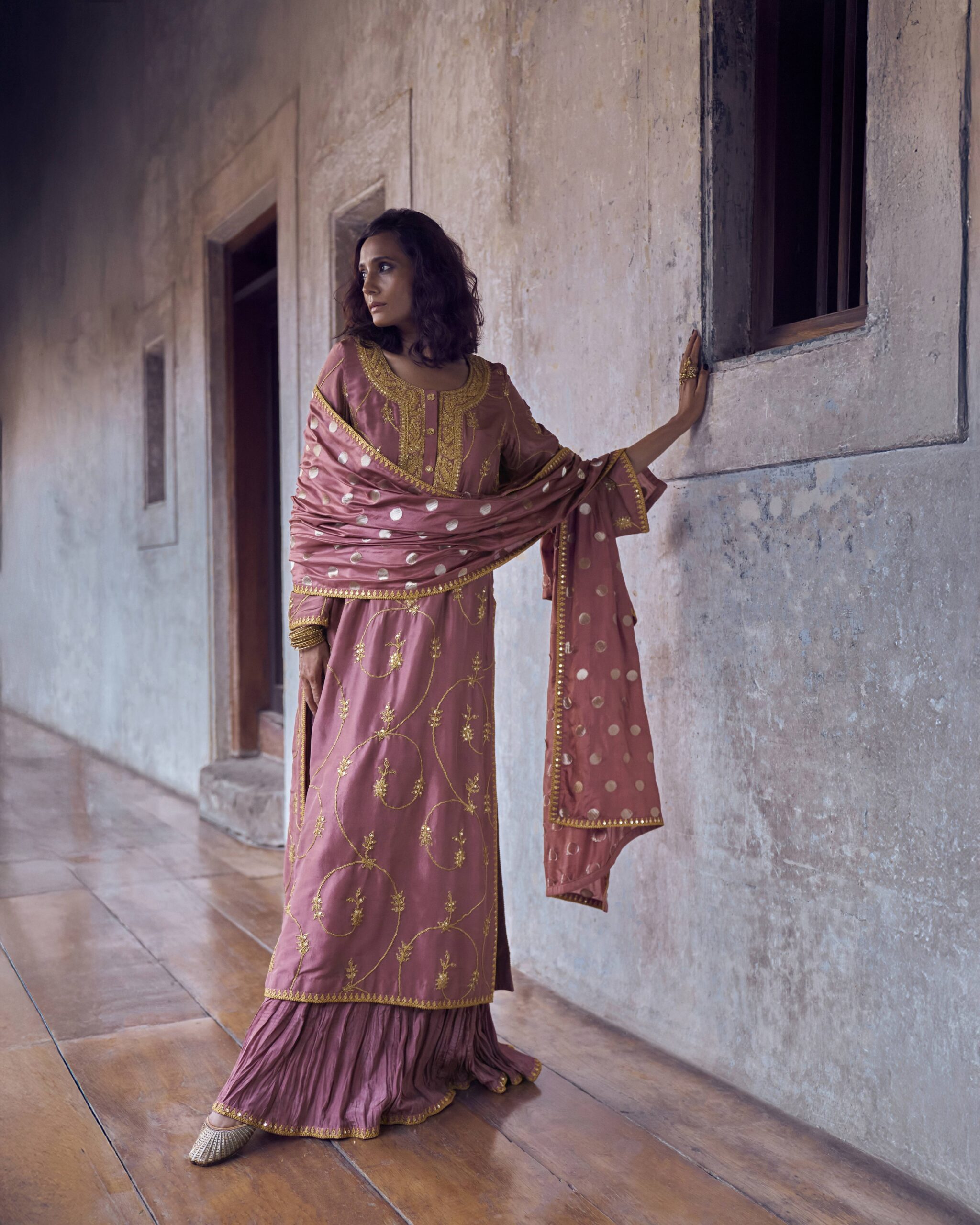 Bottom: Dhaka pajama is crafted from a cotton silk blend features a striking crushed finish with the edging of marorri and sequins embroidery.