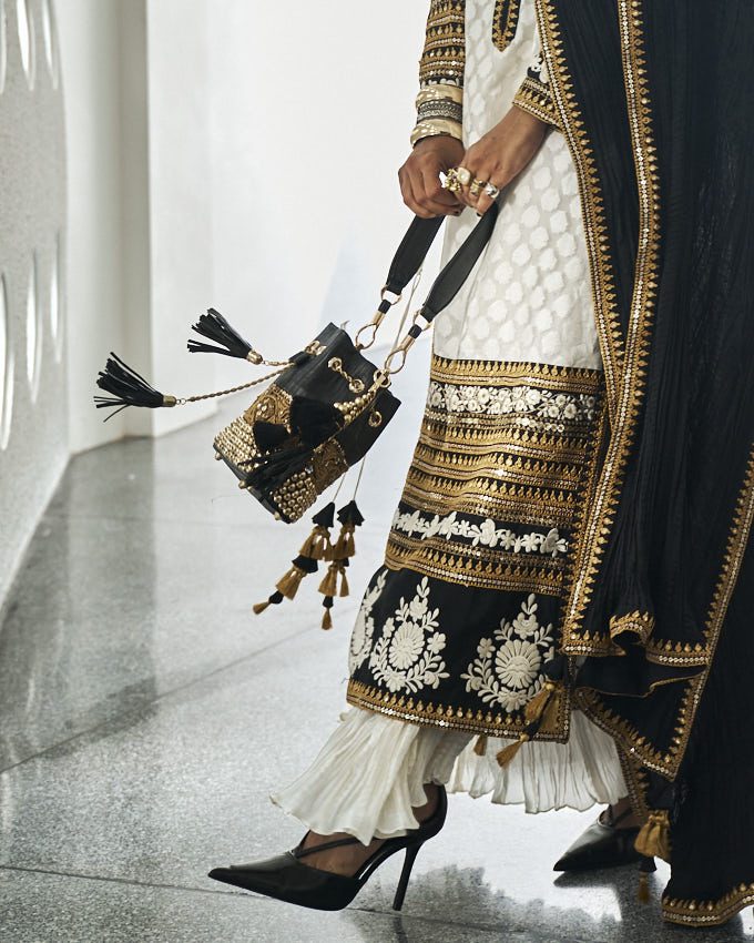Dupatta: Black crushed cotton silk dupatta with four side sequins and marori embroidery borders also having tassels on each corner