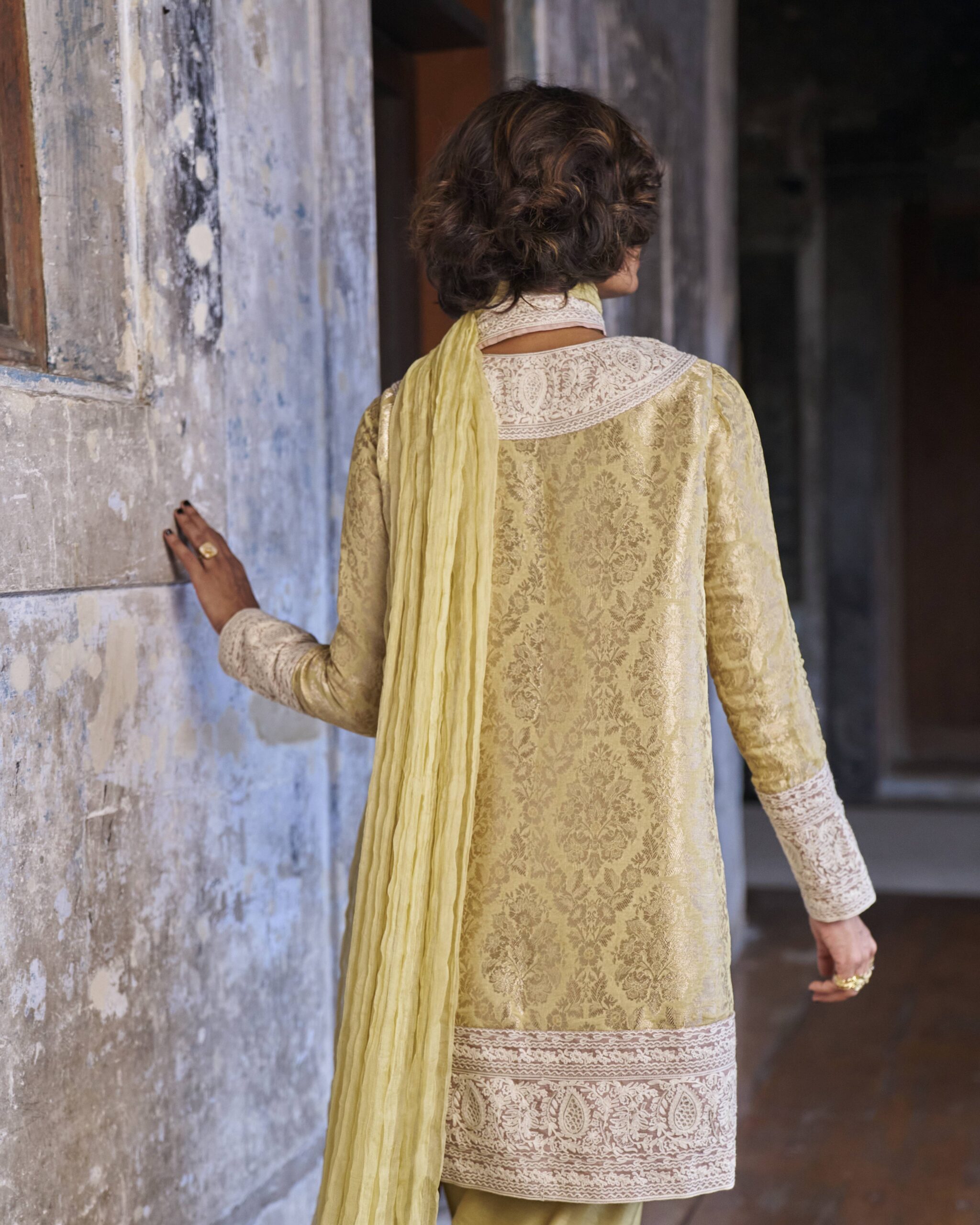 Shirt: The short length shirt is crafted from pure jamawar in honey yellow color with embroidery combines soft, tonal ivory thread work with zari strategically placed on the front and back necklines, sleeves and the front and back daman.