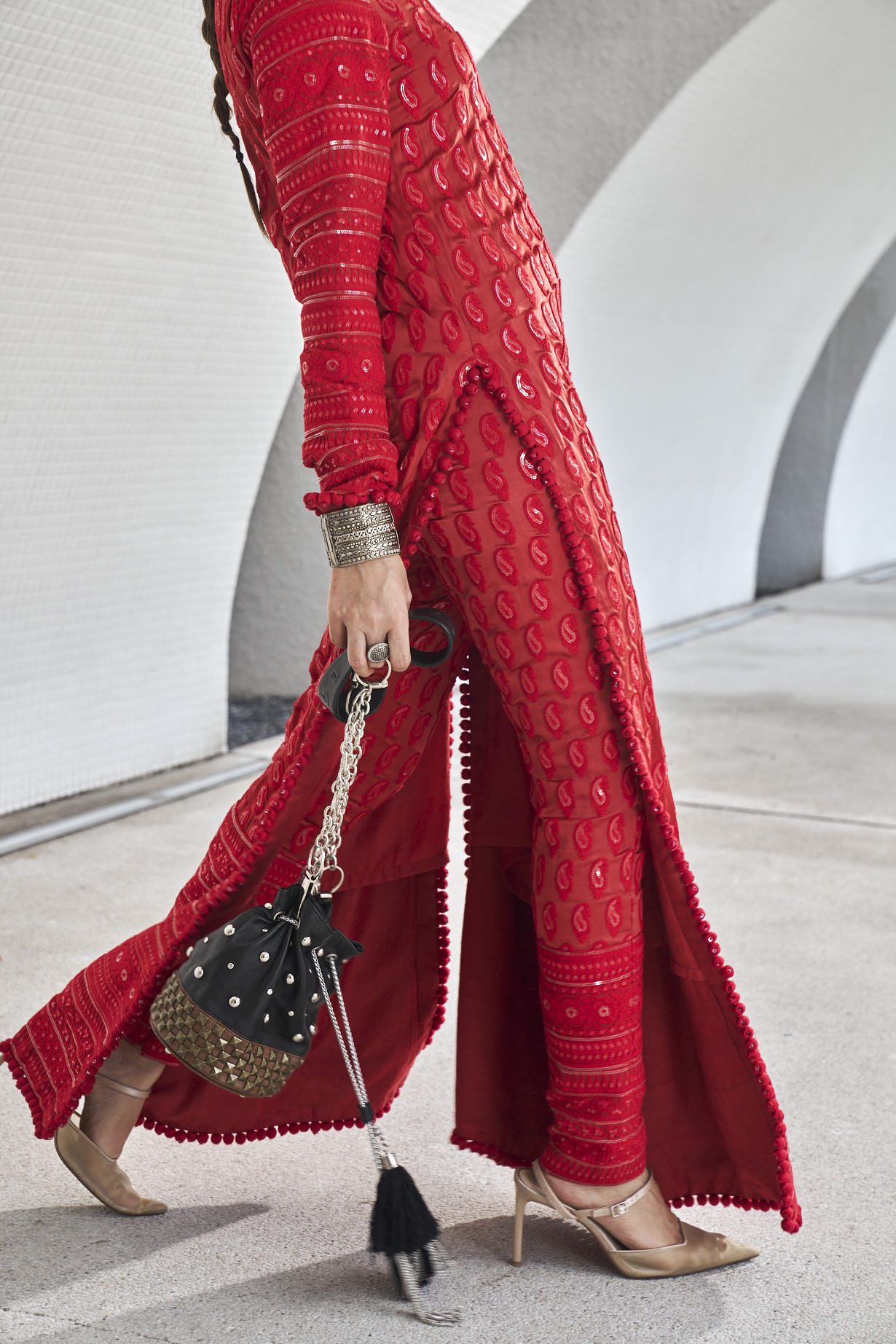Shirt: Deep Red pure silk heavily embroidered using techniques of thread and sequins work all over, finished off with resham balls.