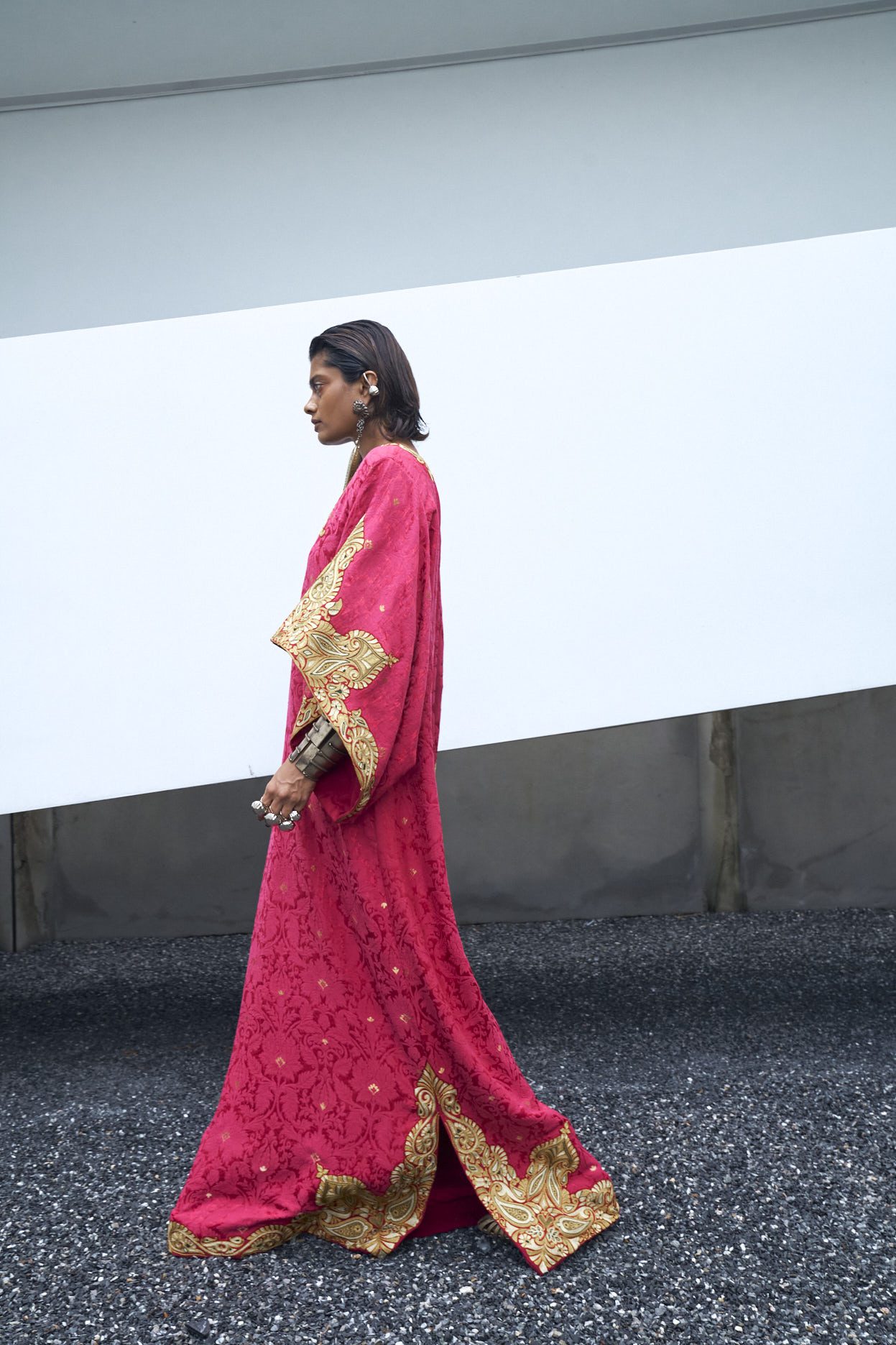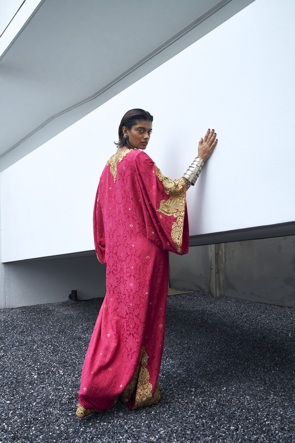 Kaftan: Berry Pink floor length kaftan crafted with self karandi jamawar using techniques of zari embroiderey on front and back neckline, sleeves, side slits and daman.