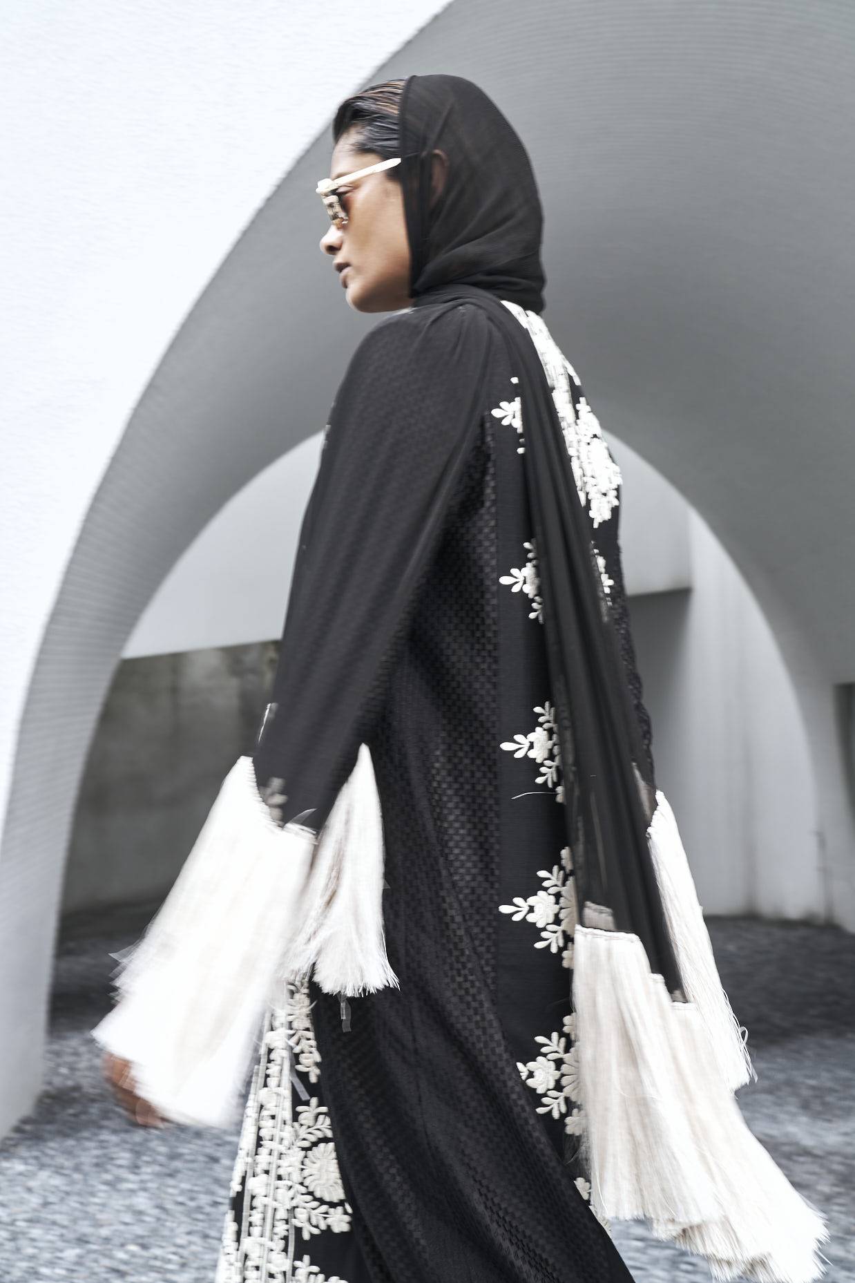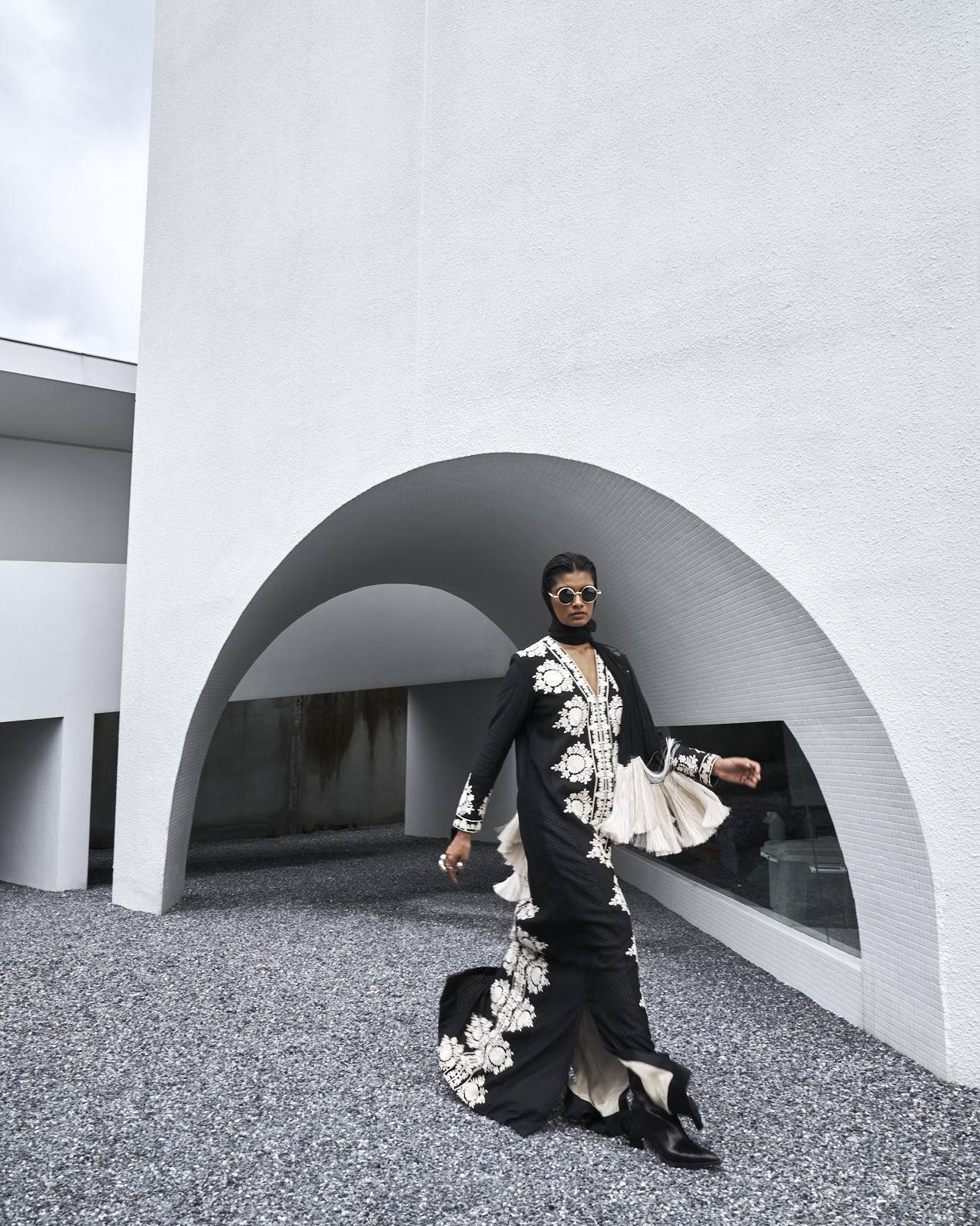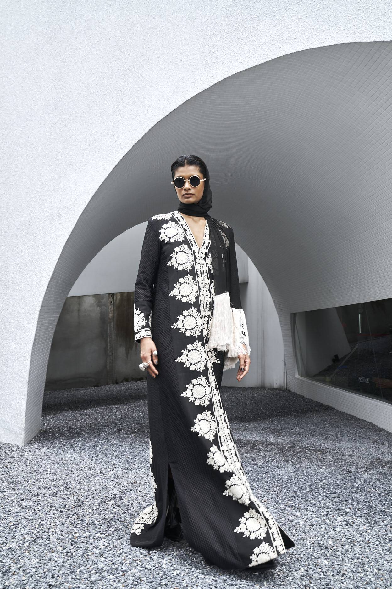 Kaftan: Floor length kaftan made with in-house fabric embellished with thread.