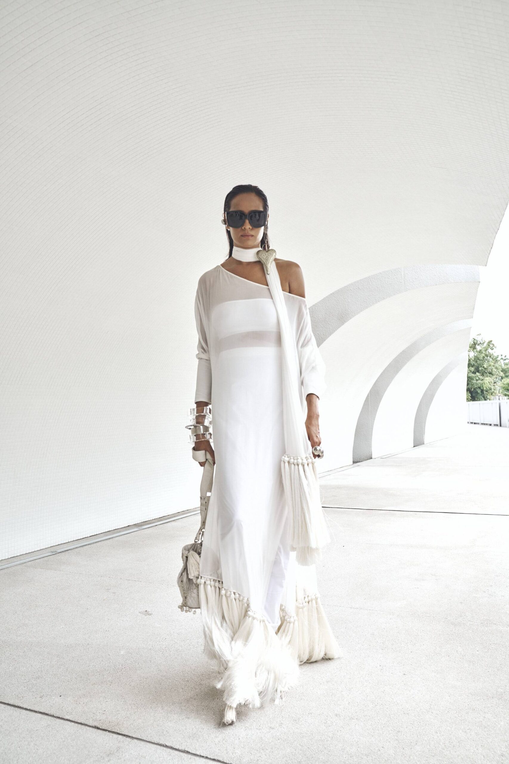 Shirt: Milky white off shoulder floor length shirt in 60 gram pure chiffon georgette with tassels, baggy sleeves with loop buttons detailing. Inner tube made with lycra stretch (can be converted into camisole or long lining- charges may apply for long lining).