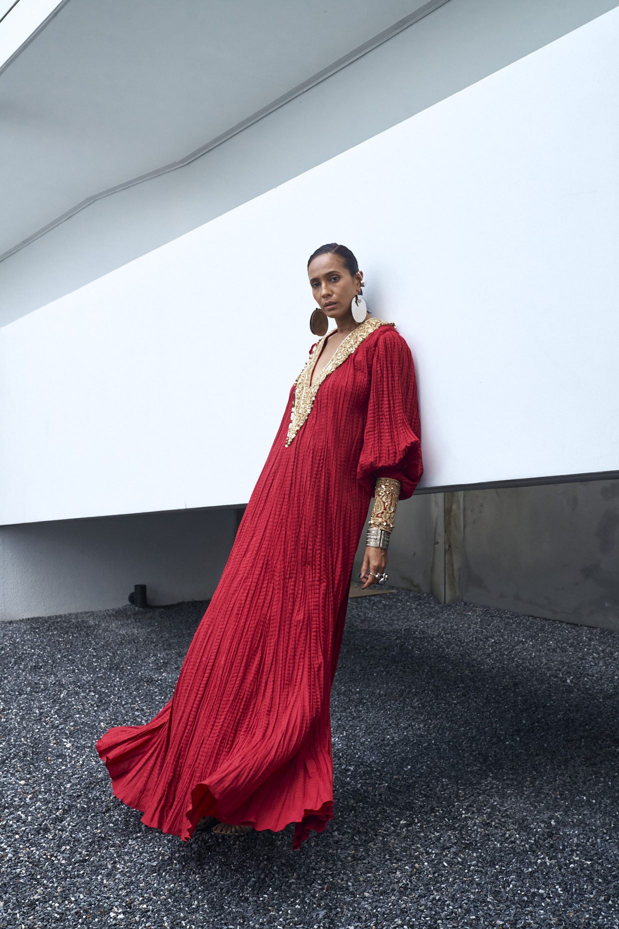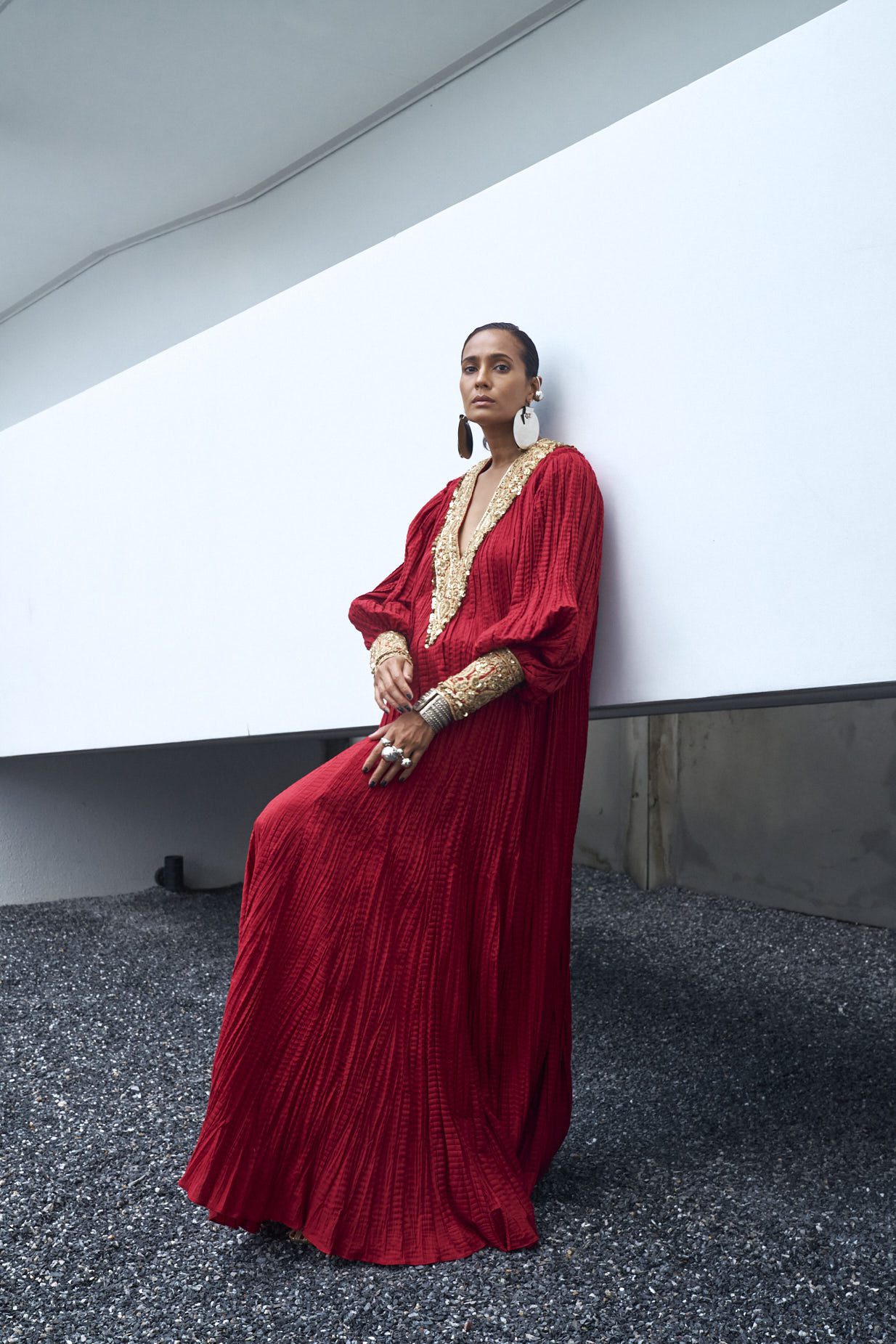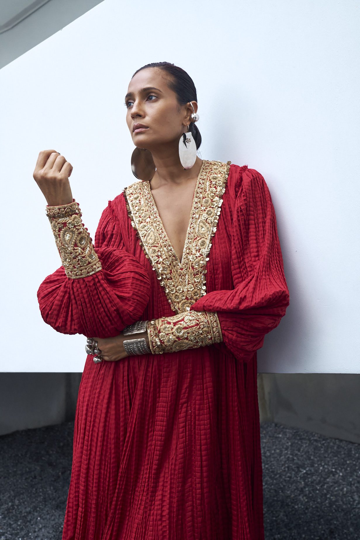 Kaftan: Deep Scarlet Red crushed floor length kaftan crafted in pure cotton using embroidery techniques of thread, zari,dabka and sequins work on front and back necklines and sleeves.
