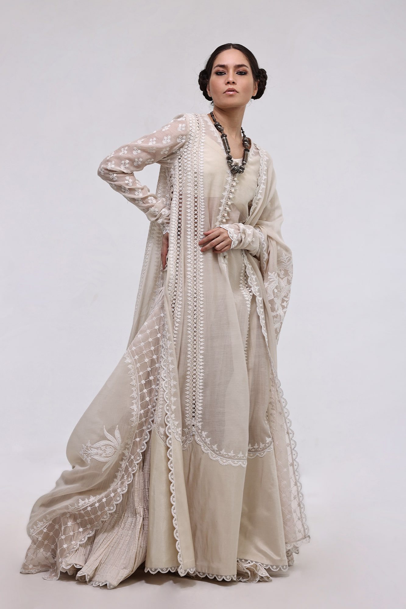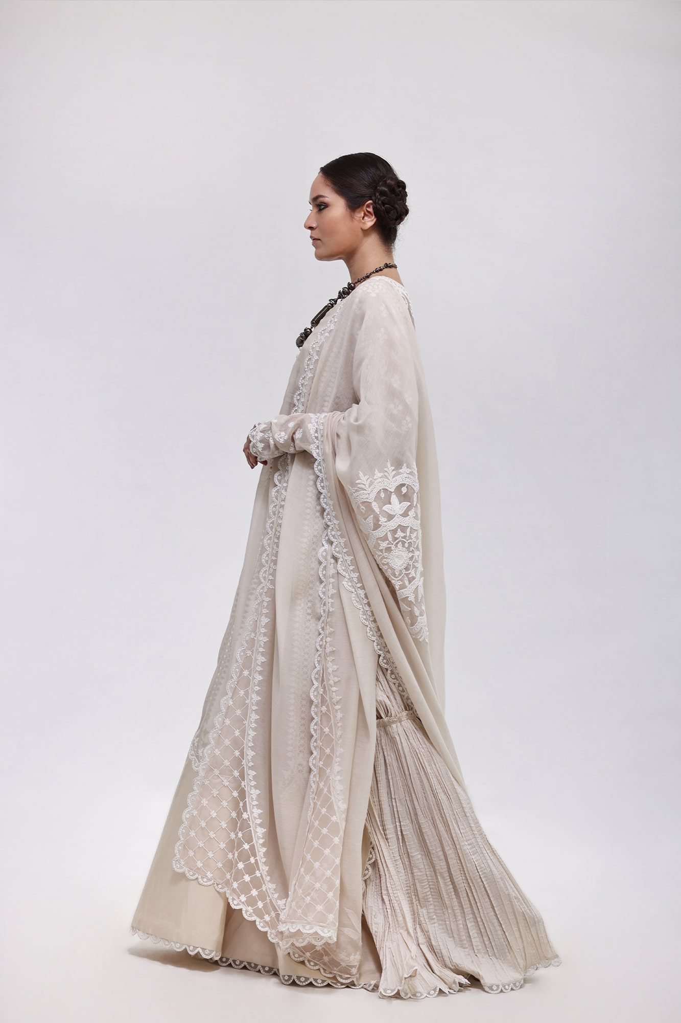 Displaying an array of intricate details, this elegant outfit includes a long flowy shirt, adorned with extensive dori work, layered with laces and featuring a crissed-crossed side design detail and a touch of applique on the shirt hem. Paired with a crushed cotton gharara and an embroidered duppatta.