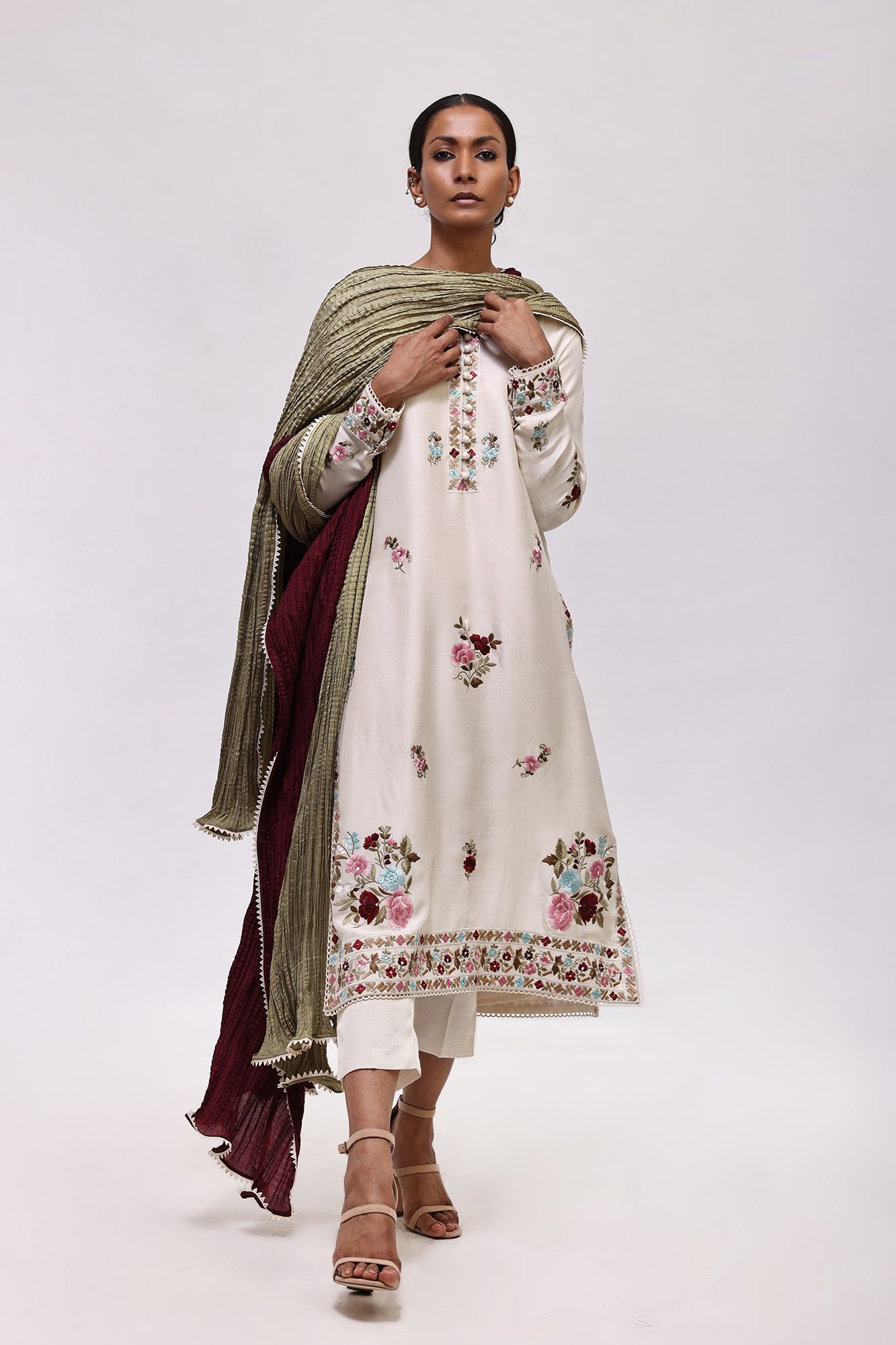 Set in ivory, with floral embroidery canvassed across this straight long shirt made in pure raw silk, paired with straight pants and finished with a two toned crushed silk duppatta in maroon and olive finished with lace trimmings.