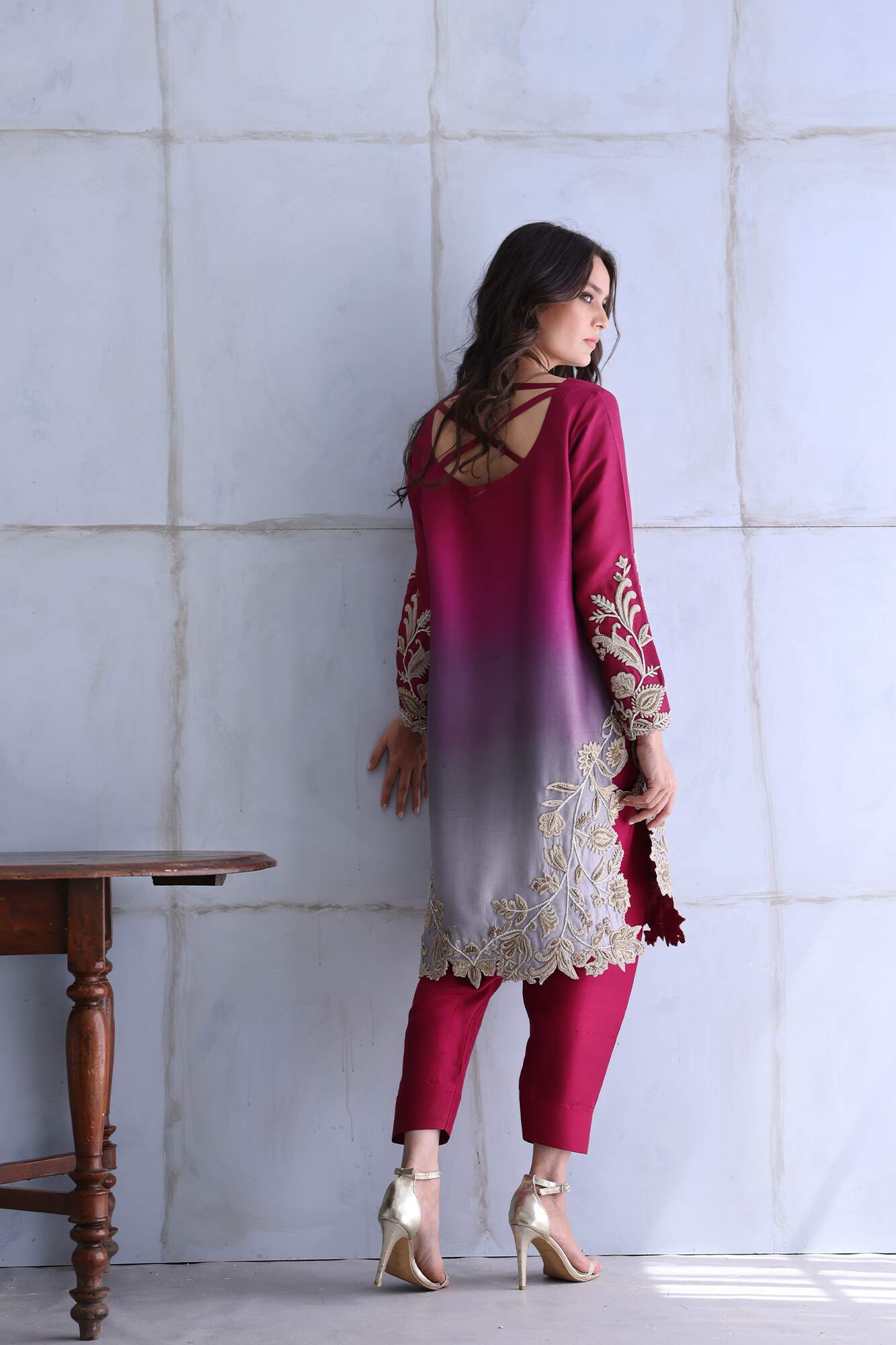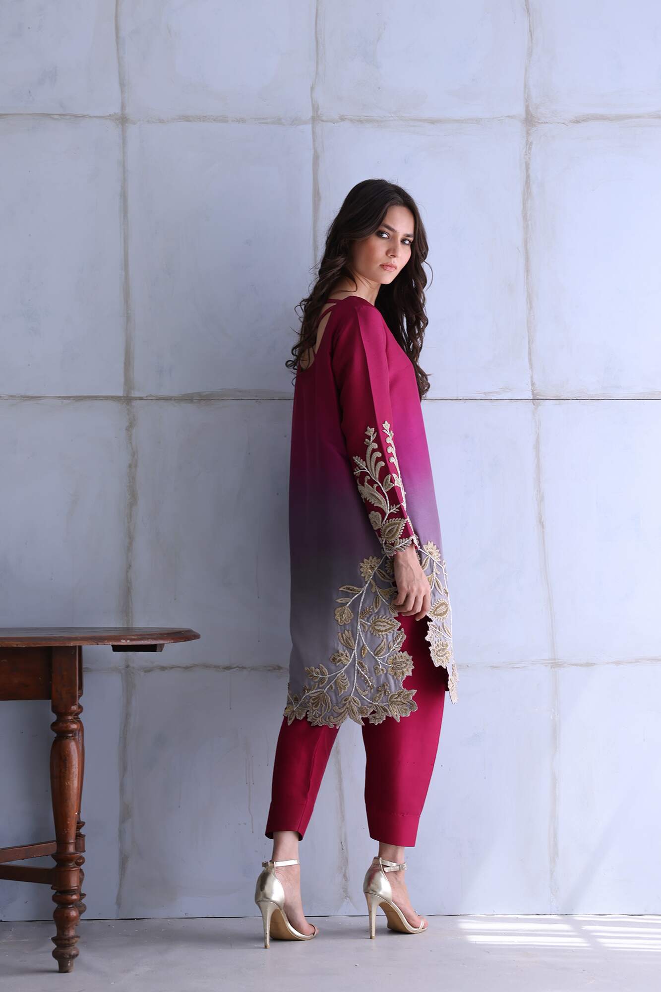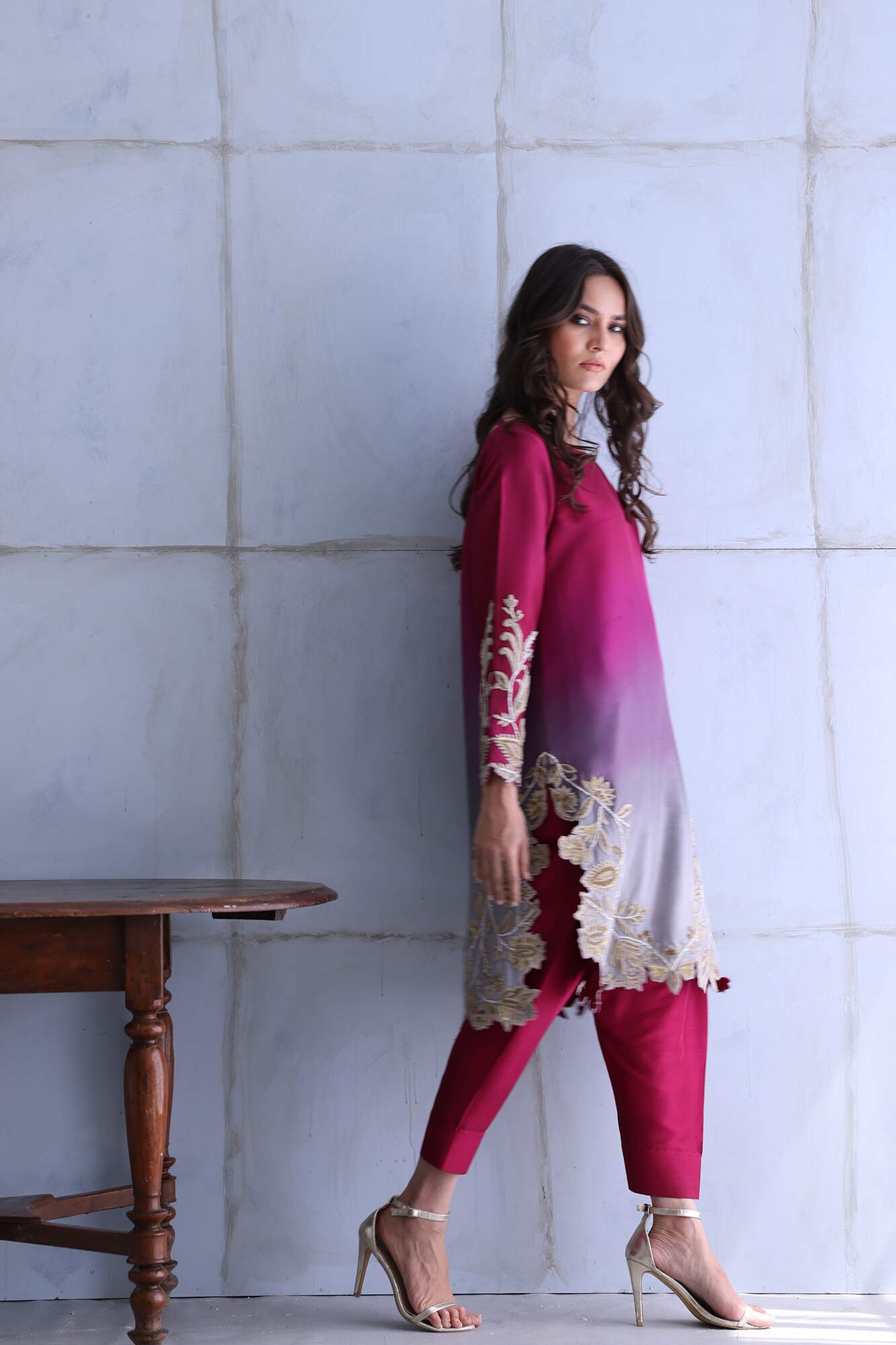 Pink dip dyed loose modern shirt paired with skinny shalwar