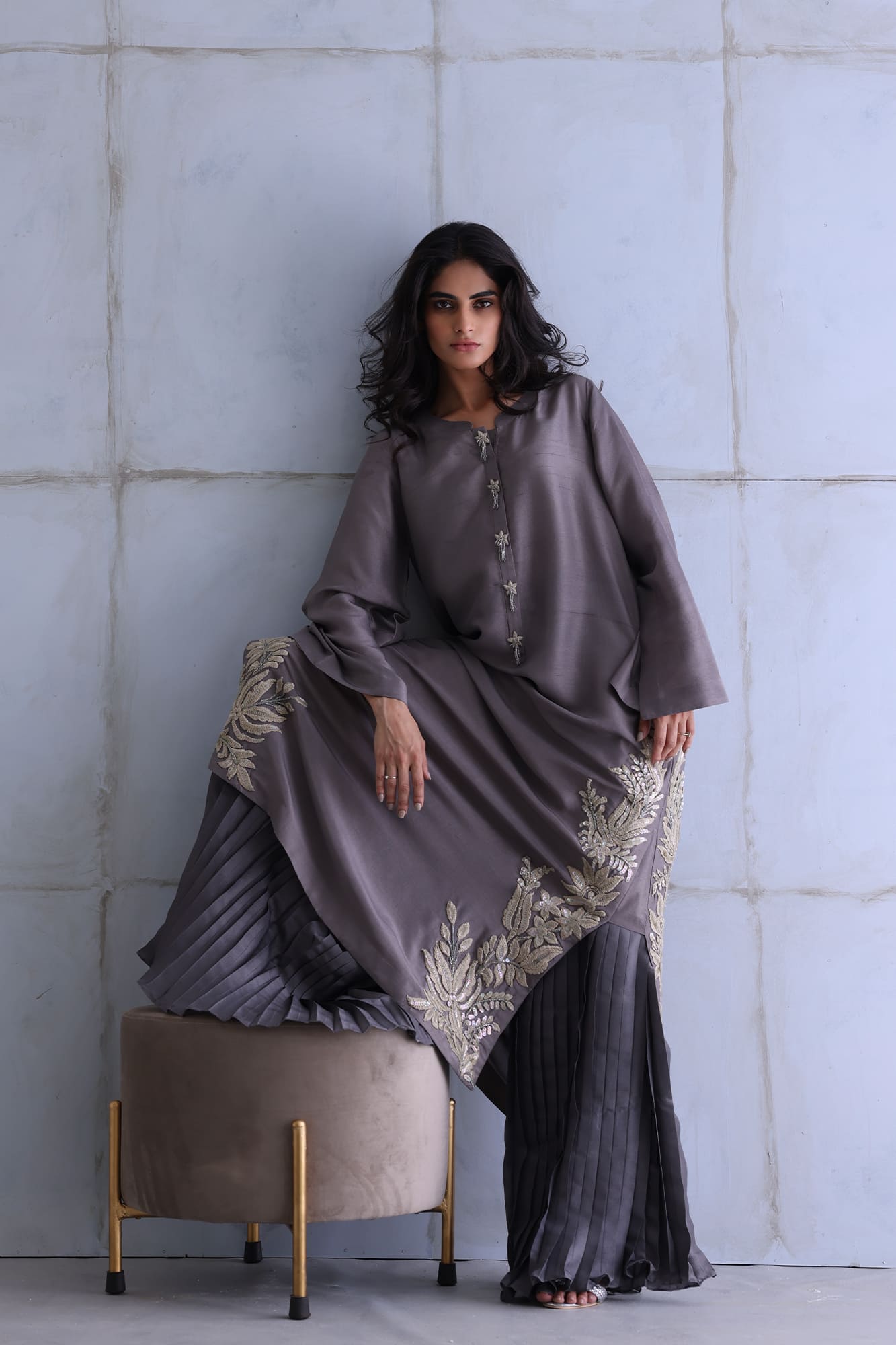 Gray modern shirt with embroidered side slits, paired with pleated pants