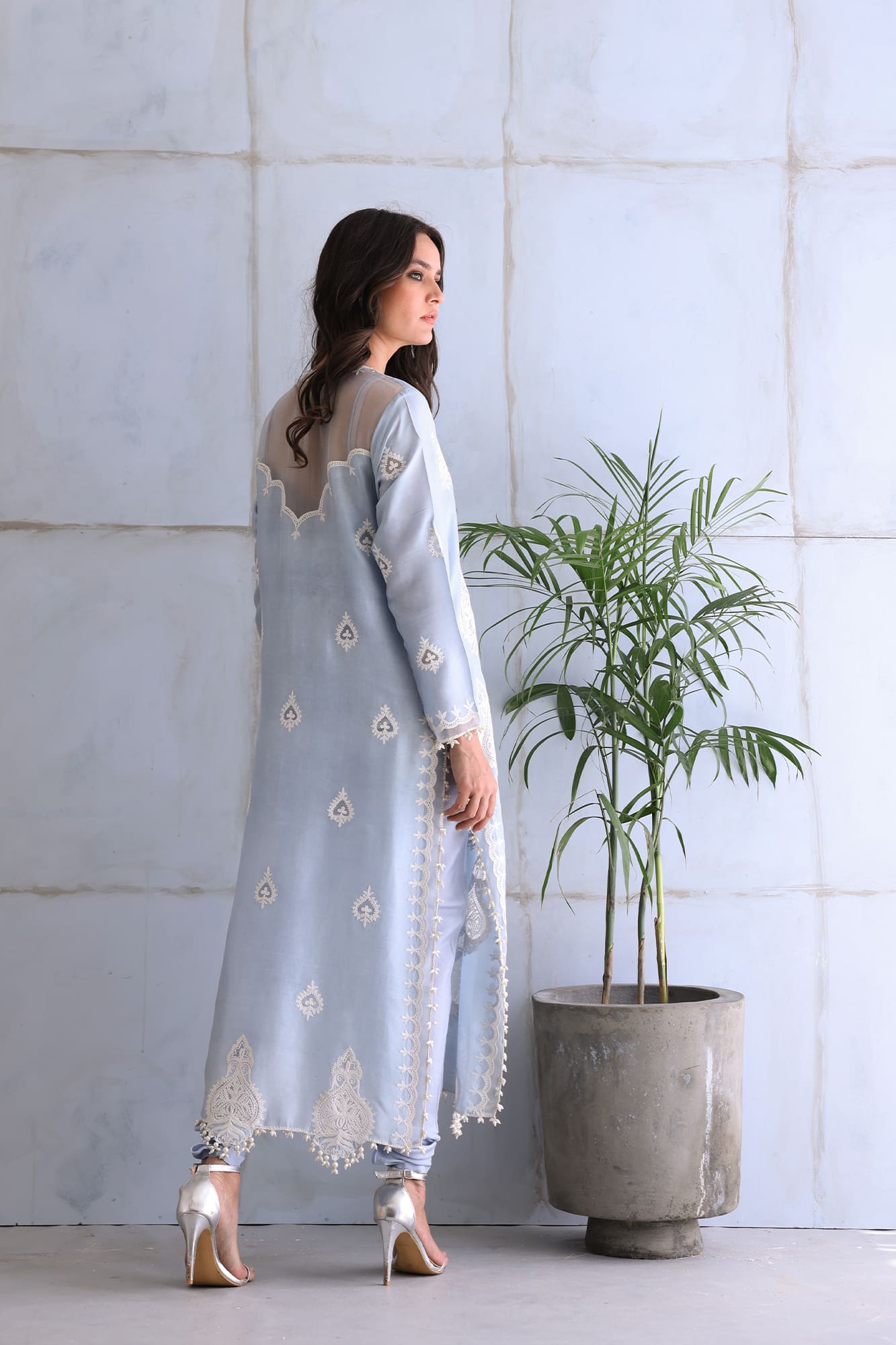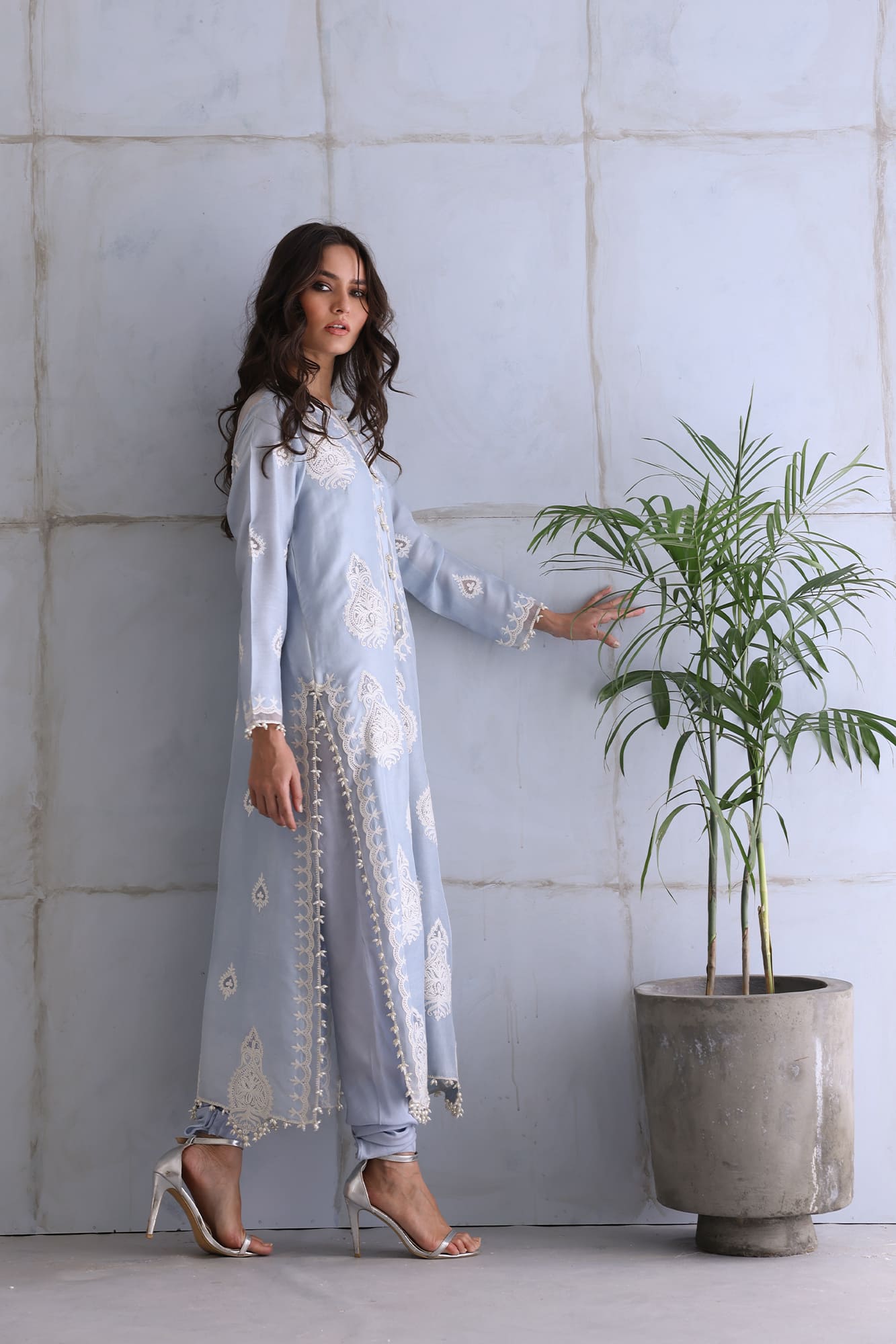 Powder blue, aari worked kurta with embroidered Indian motifs accented with pearl and organza detailings, paired with chooridaar pajama