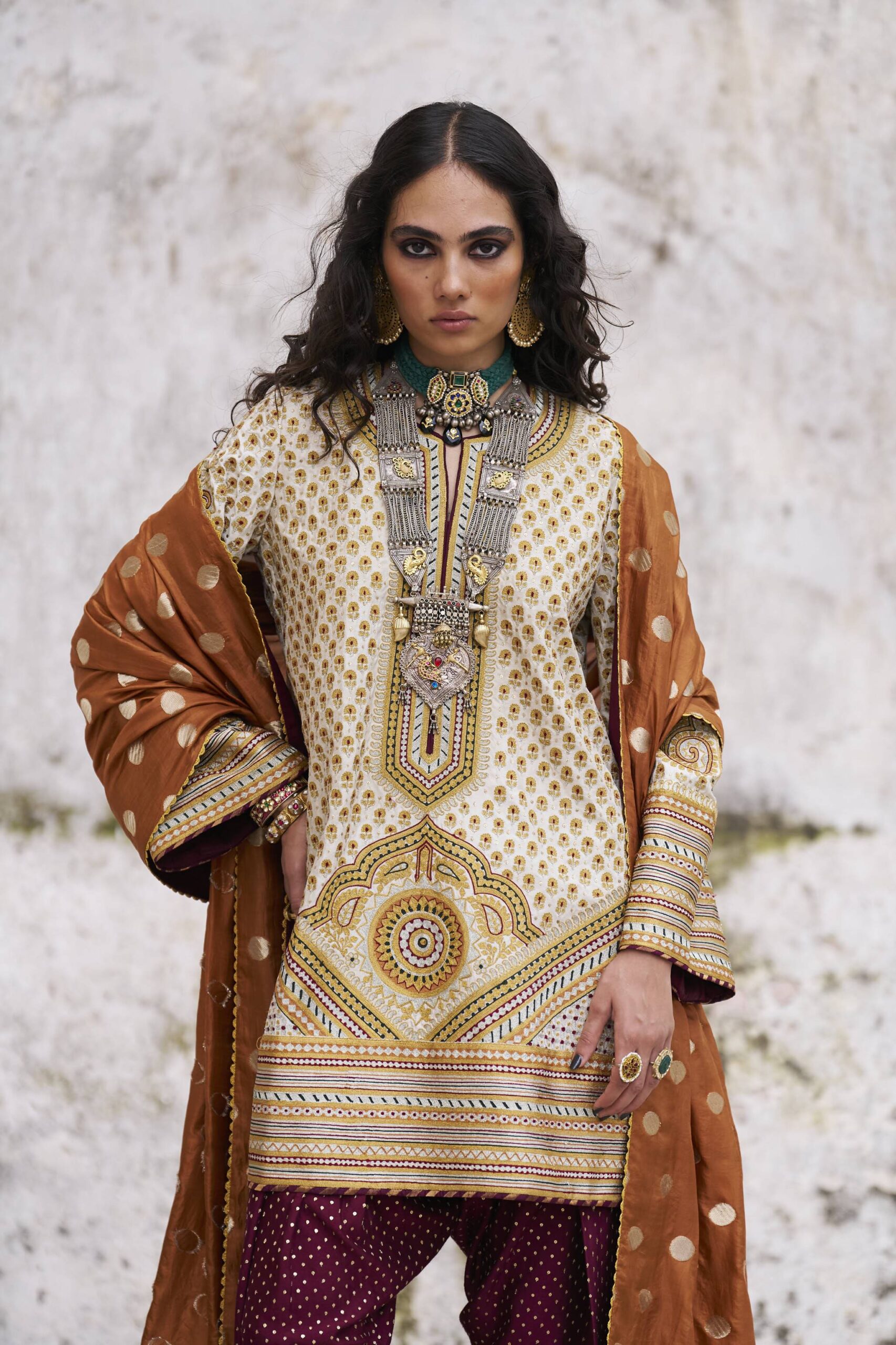 Shirt: Ivory pure mulberry silk, locally made by our artisans, reimagining age old banarsi technique into zari and silk thread aari embroidery, redefined with our signature motif, small booties with highlights of sequins all over the shirt and thick aari work, embroidered border on the hemline using zari and silk thread,on the front and back of the shirt as well as on the neckline and sleeves.