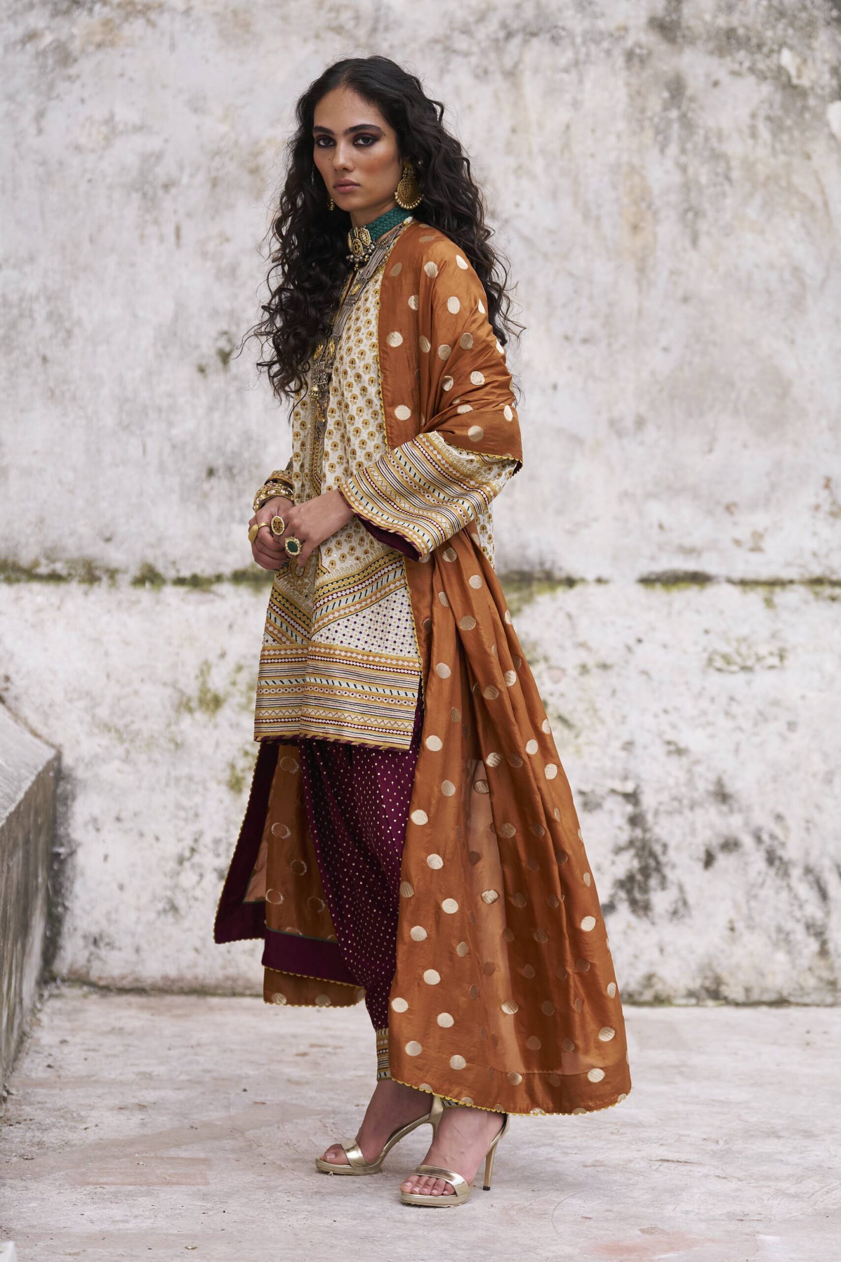 of the dupatta with thin golden zari scalloped edges. The dupatta is of 3 yards