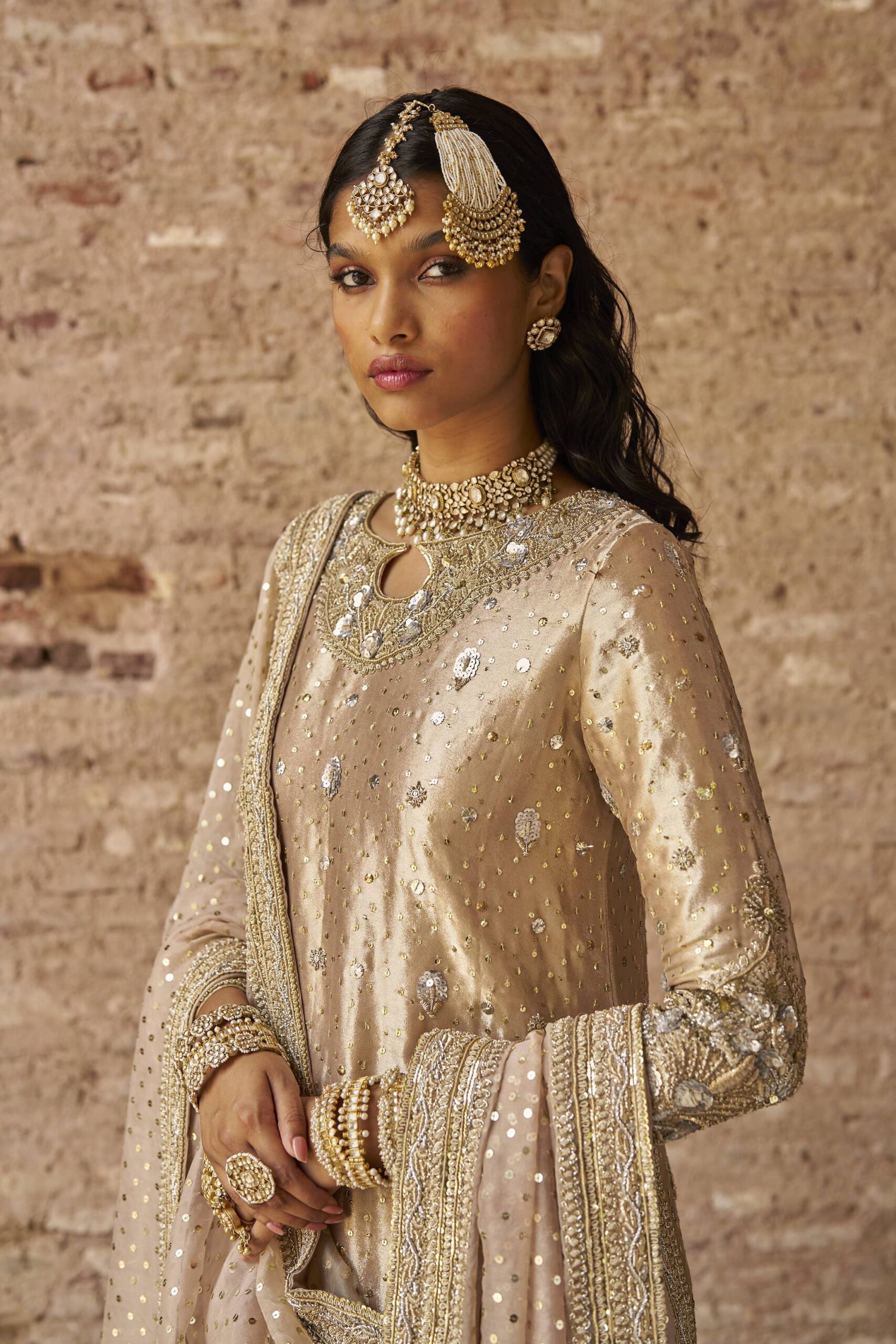 Shirt: Dusty pink long shirt in lame tissue fabric has a sprinkle of sequins work all over and small sequins booties. The hyderabadi neck style has ganga jamna (silver and golden) embroidered, same work on the sleeves follow. The thick criss cross border on the hemline of the shirt consist of hand embroidery techniques using ganga jamna (silver and golden work) with kora, dabka, nakshi and sequins work.