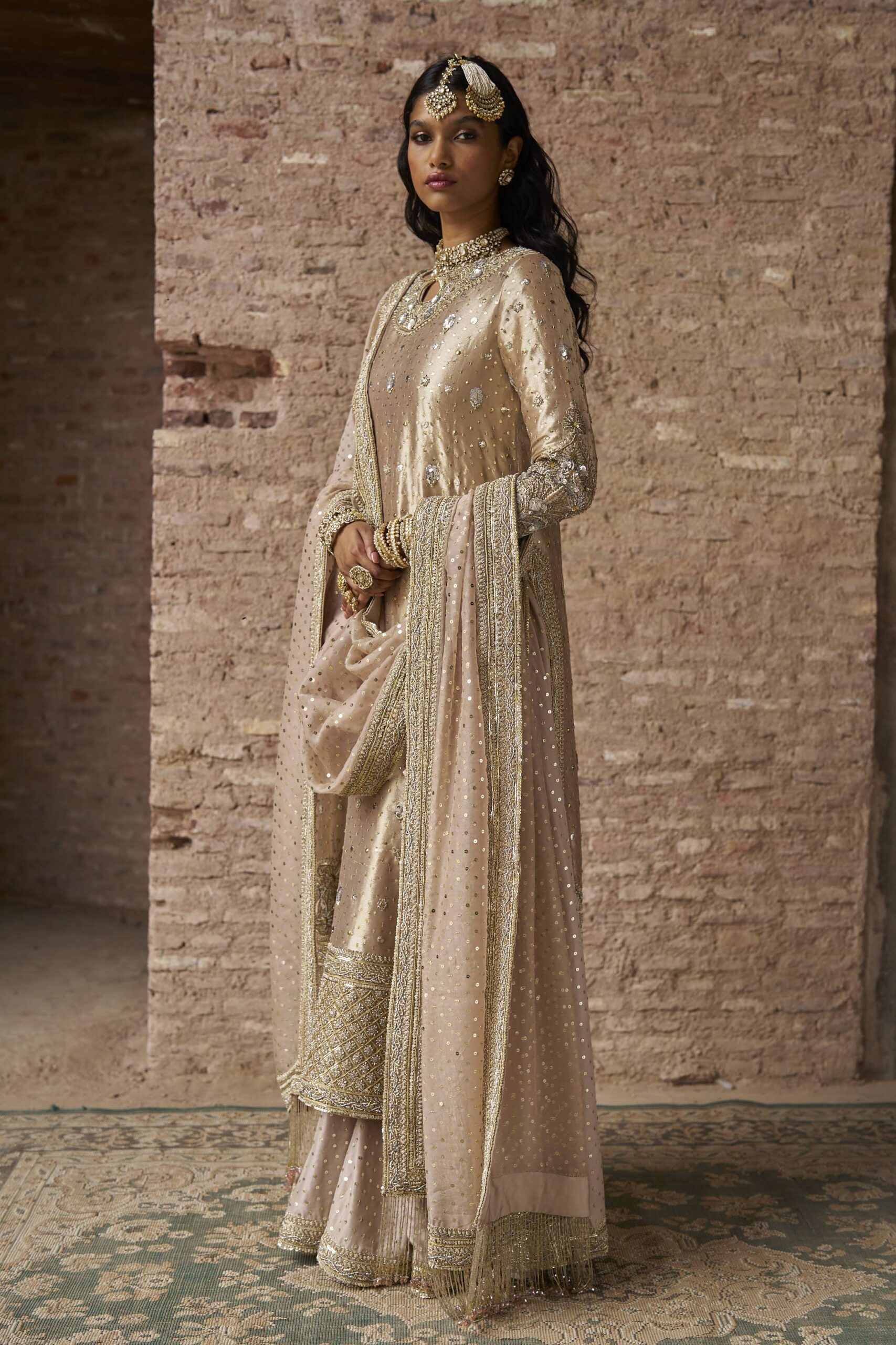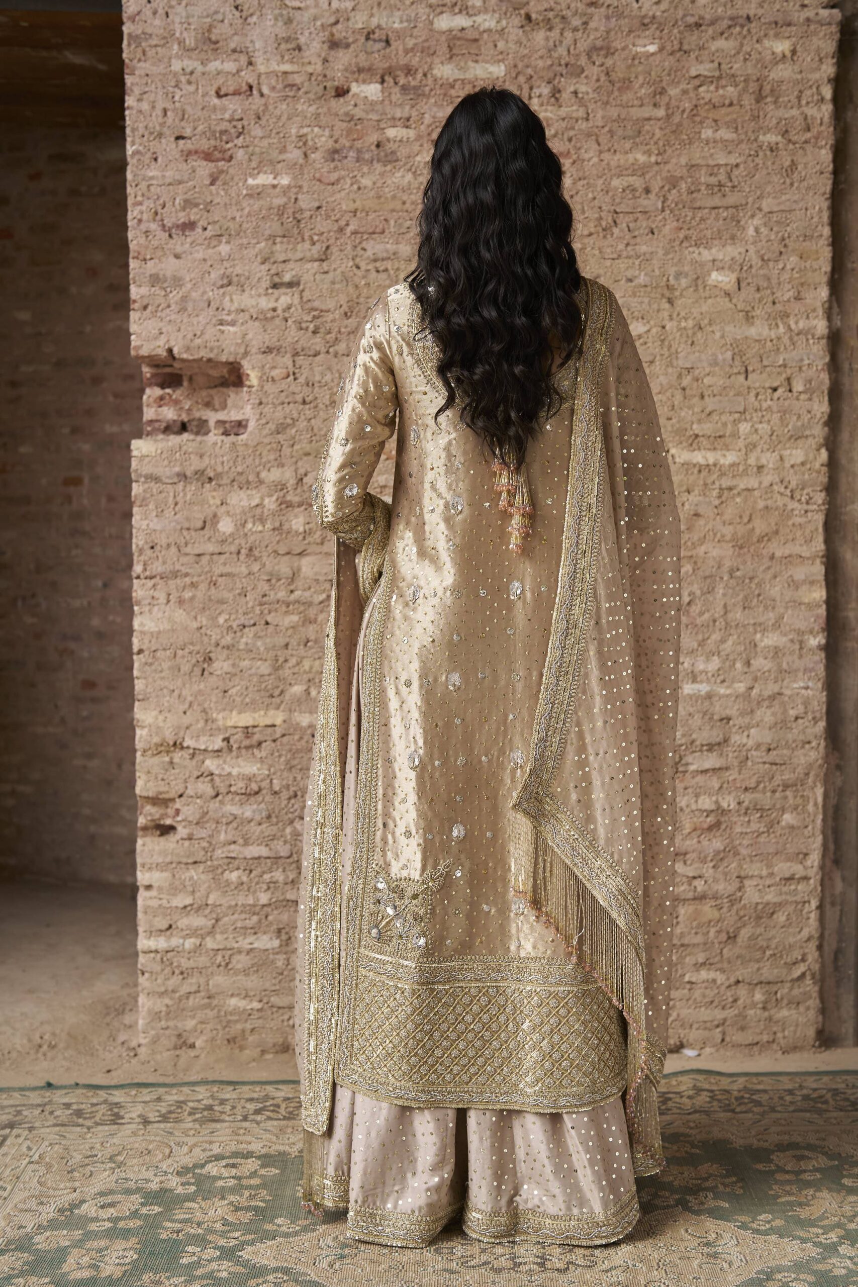 Dupatta: Pure organza dupatta in dusty pink colour has four side border using work techniques of kora, dabka, nakshi and sequins and sprinkle of sequins work all over. The dupatta is finished off with tassels for an elaborated look. The dupatta is of 3 yards.