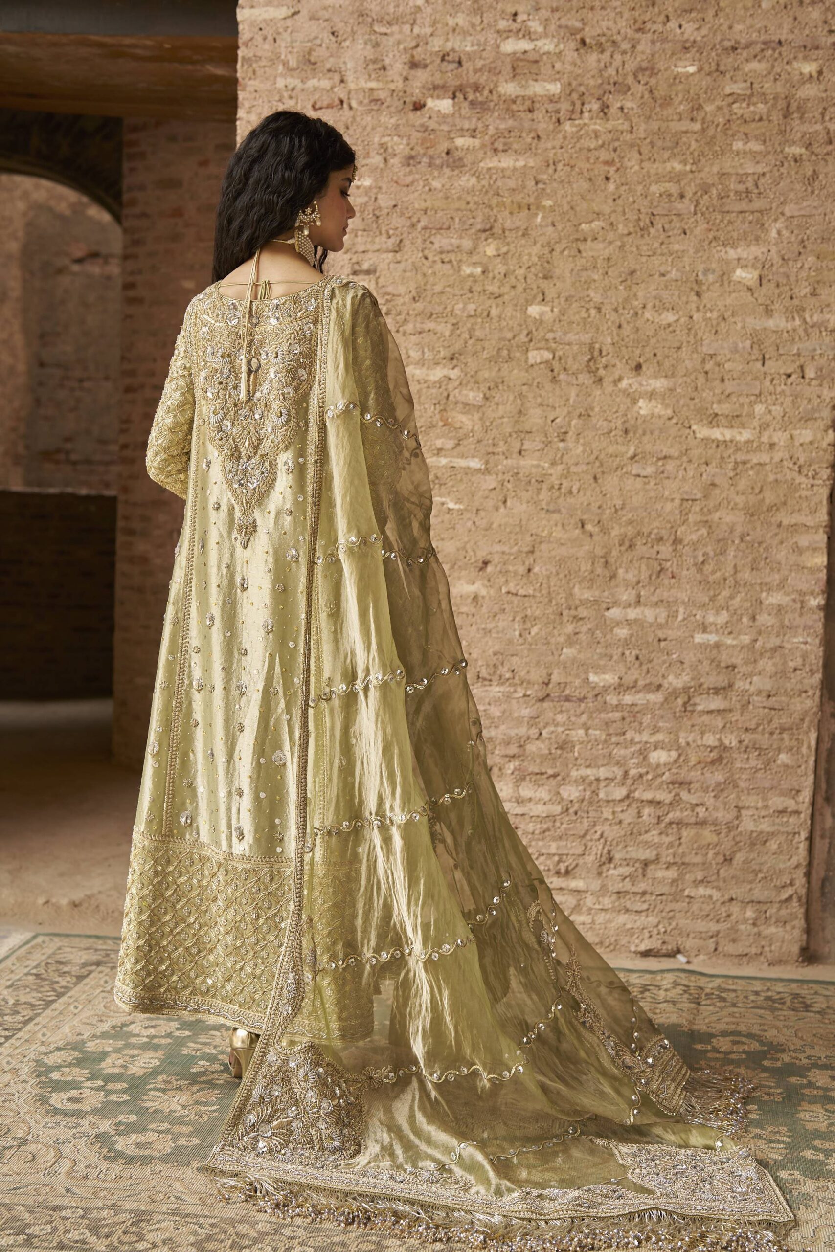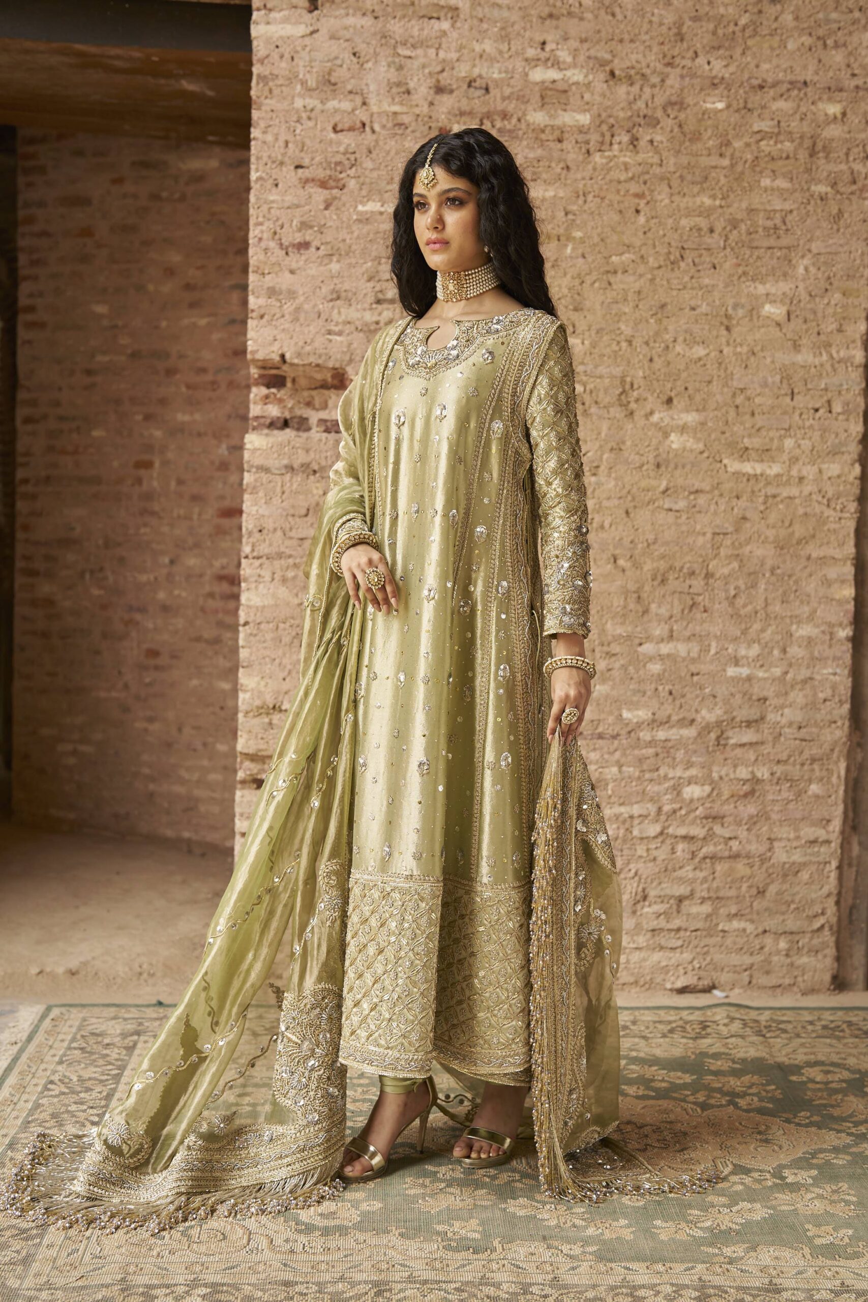 Shirt: The intricate and elegant pistachio green panelled shirt in tissue fabric consists of ganga jamna (silver and golden) embroidered work. The hyderabadi neck style is fully embroidered. The shirt has a thick border of dense embroidery using the ganga jamna technique in a criss cross pattern as well as the sleeves. The shirt is further embellished with doris on the side with danglings and tassels. The shirt is lined with pure silk and has big motif at the back.