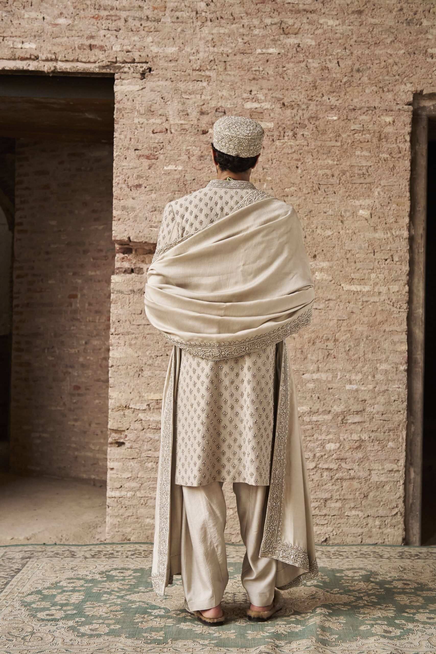Sherwani: Shell white jute net hand embroidered front open sherwani with zardozi work detailing on the front, back, collar & sleeves.
