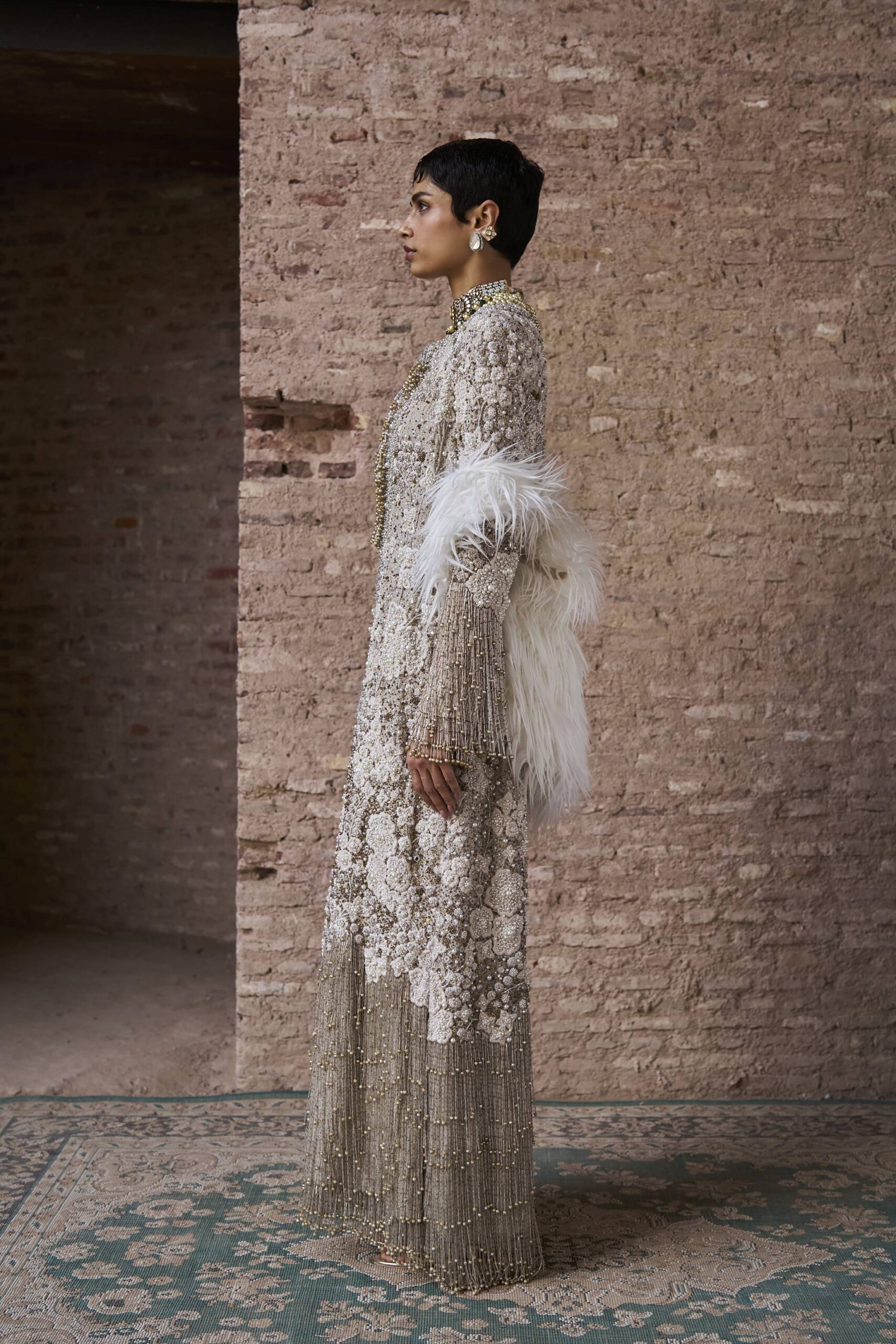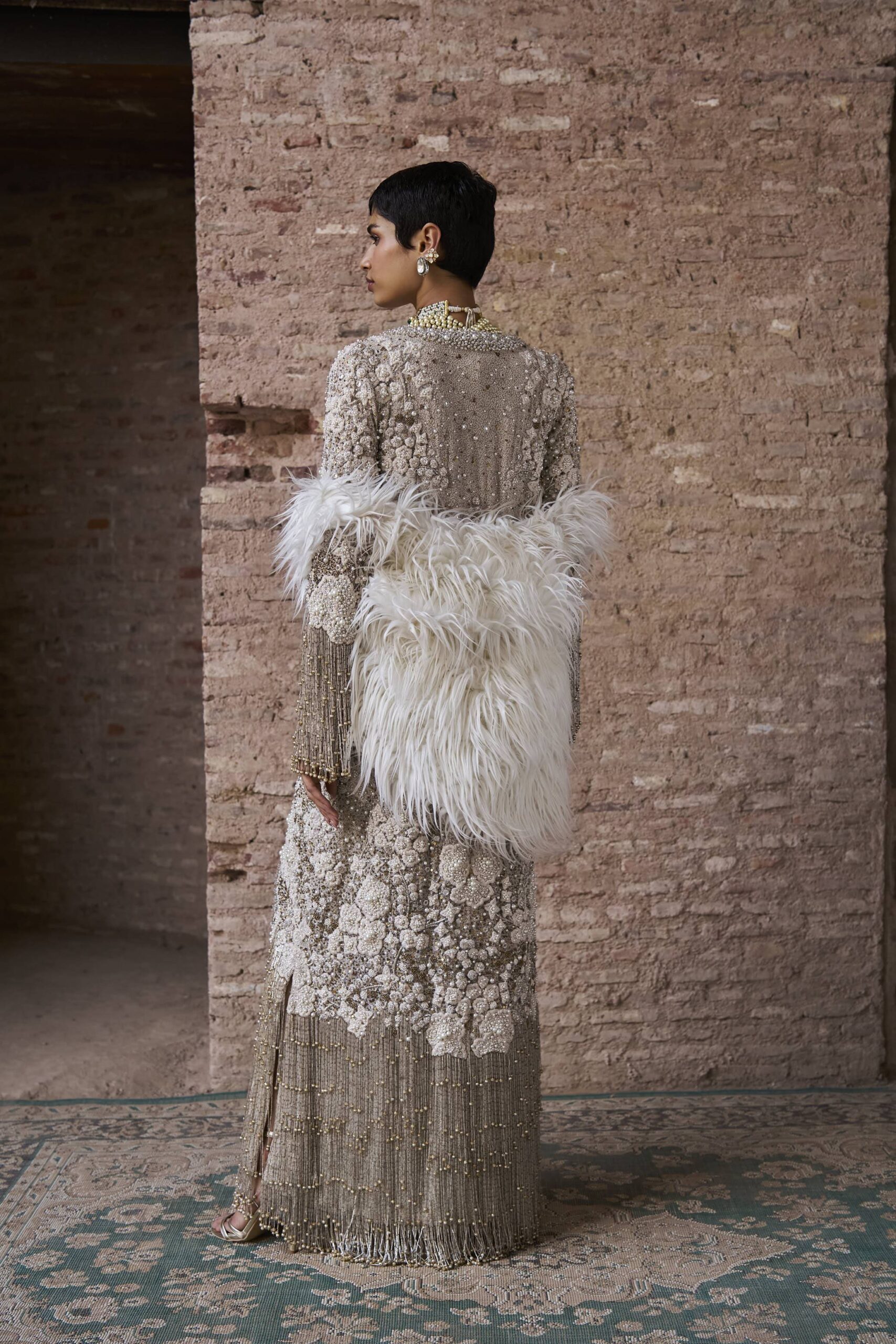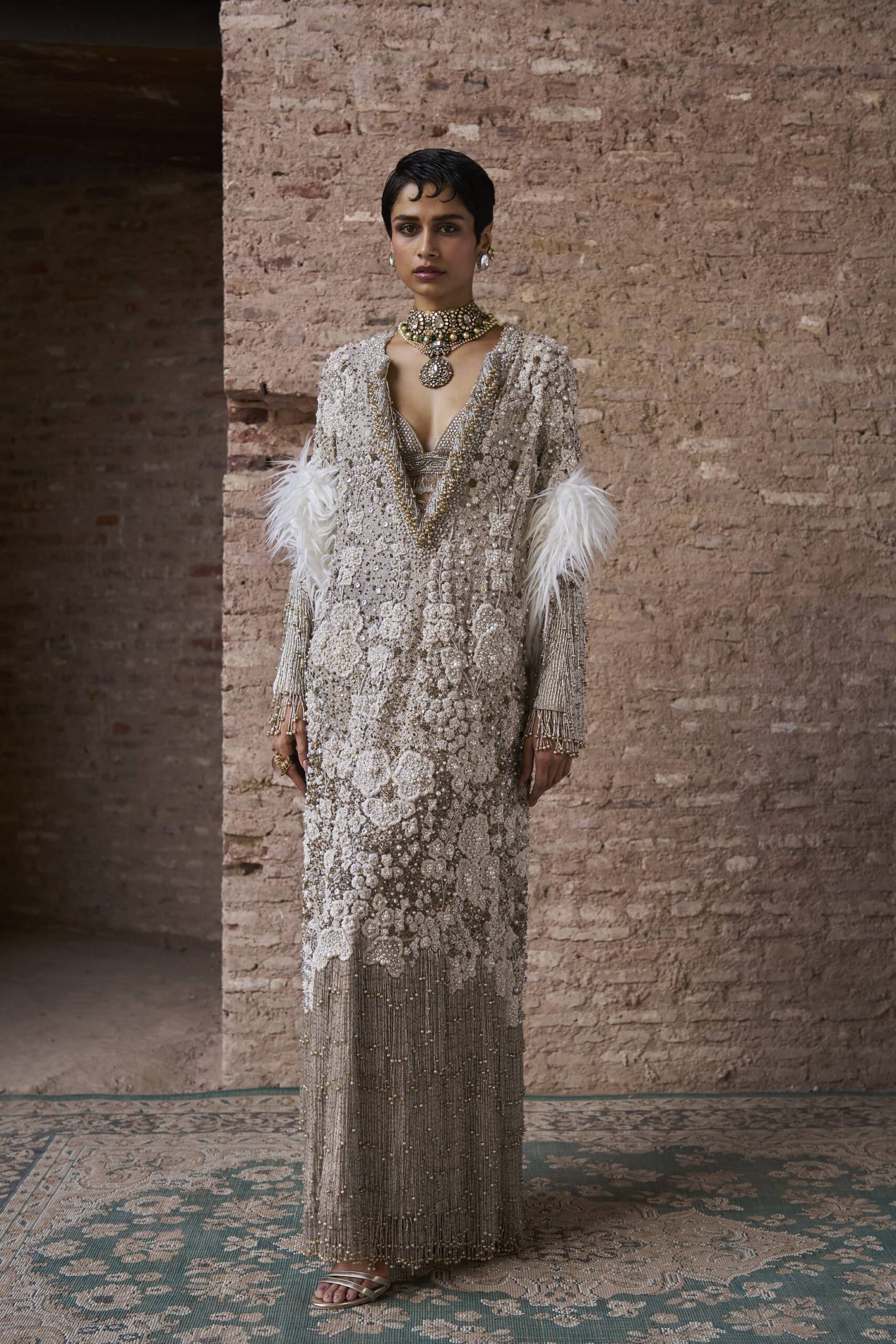 Dress: Taupe floor length dress in pure net with silk thread and lurex aari embroidery in the background along with cut beads, stones and pearls work. The dress also consists of antique beads and tassels.