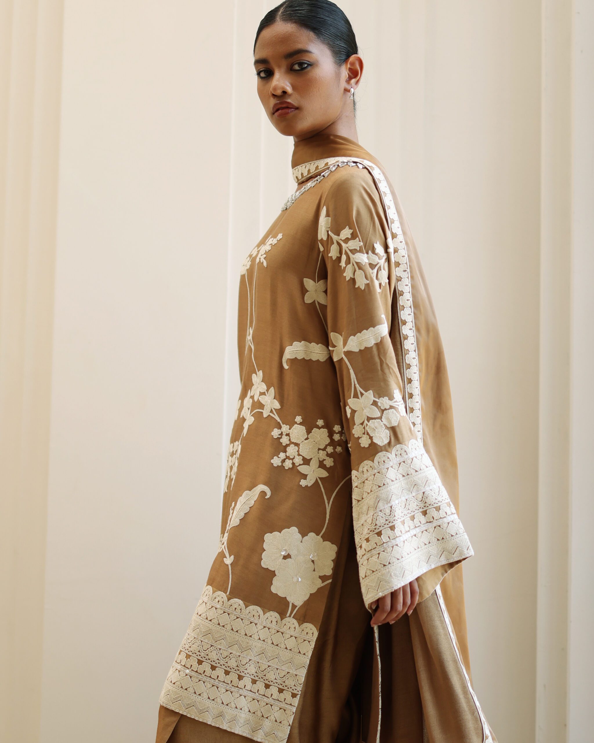 Shirt: Camel brown khaddi silk short shirt with off white embroidery, sequins highlighting and stone detailing on the neck
