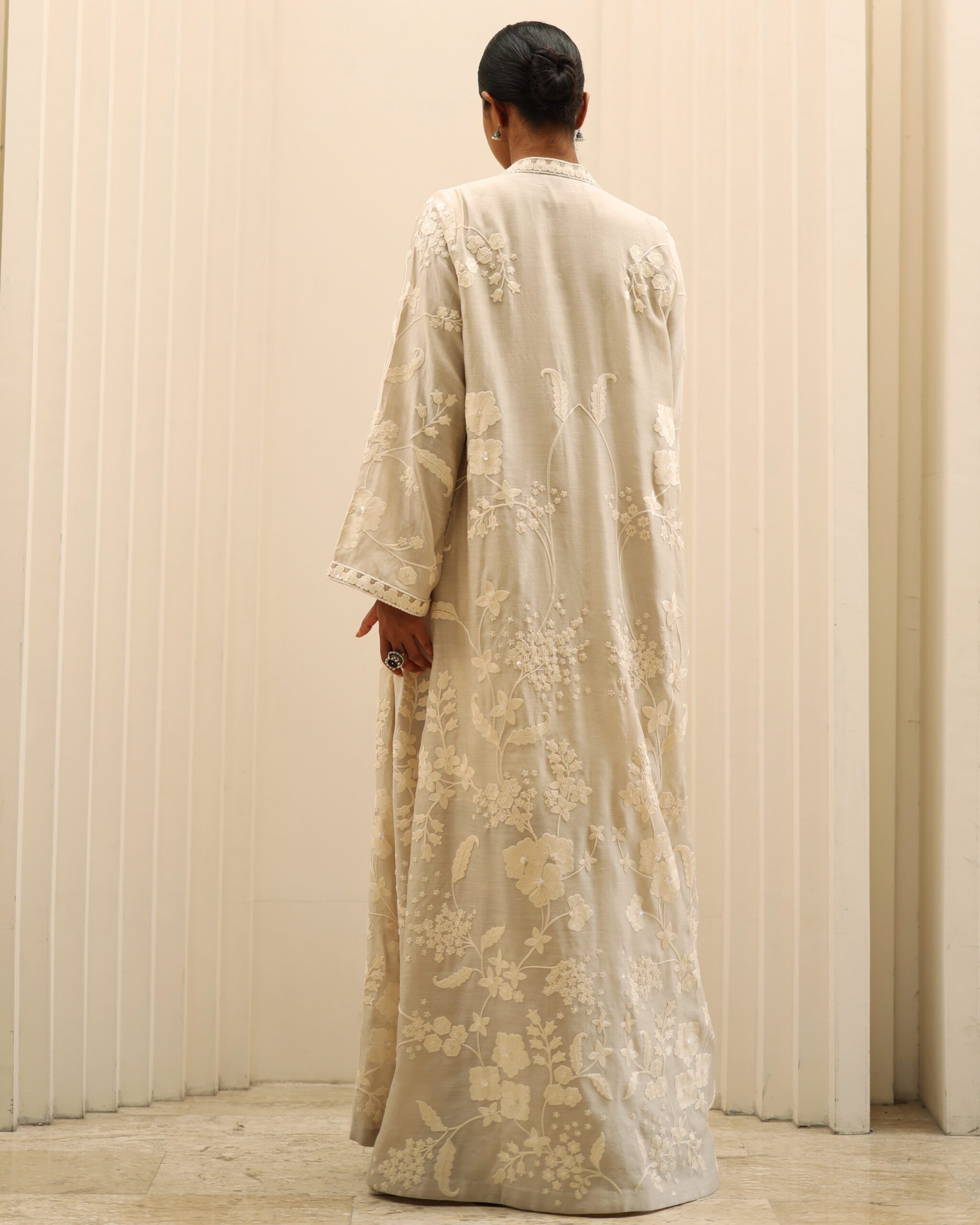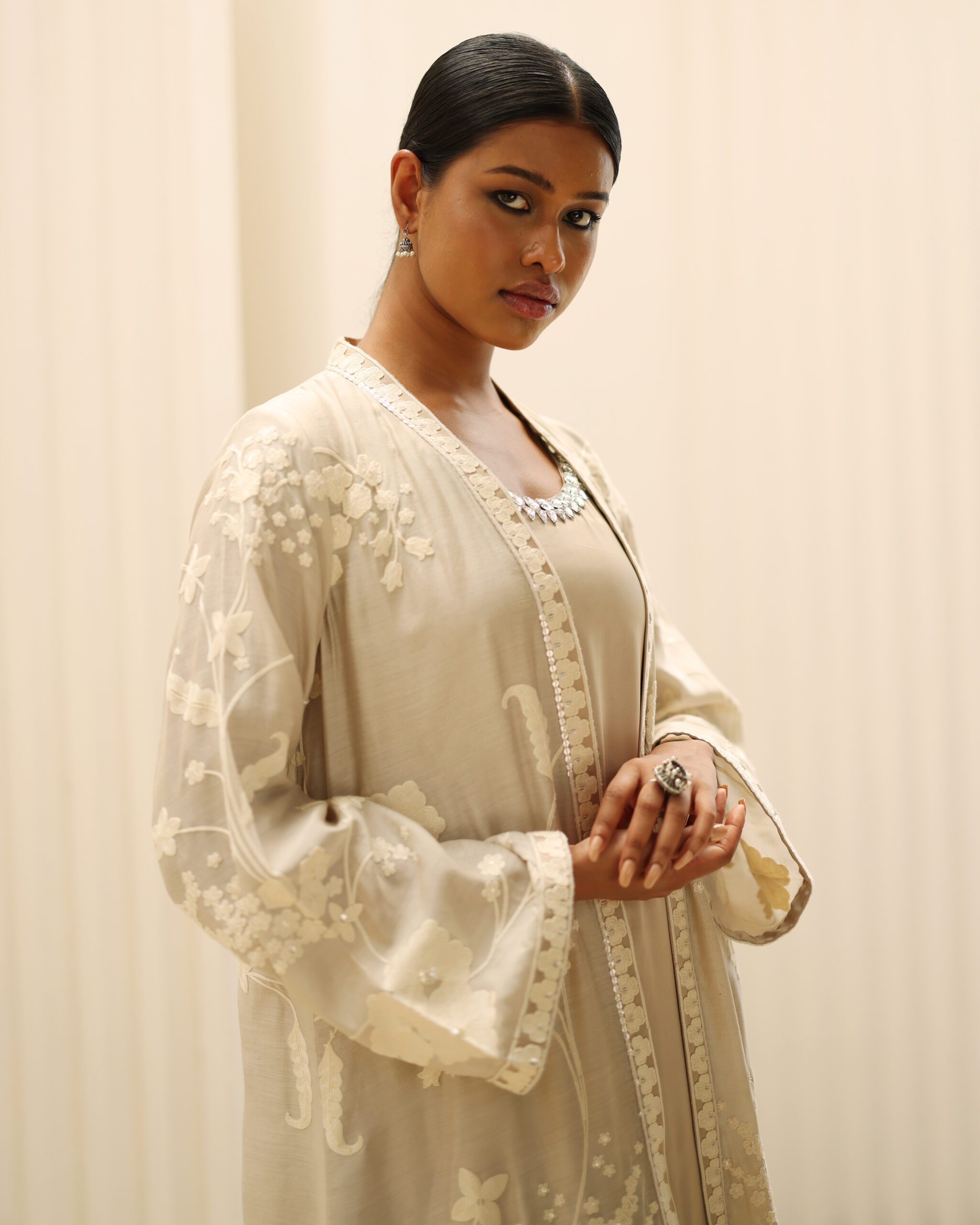 Jacket: Taupe khaddi silk jacket with off white embroidery and sequins highlighting