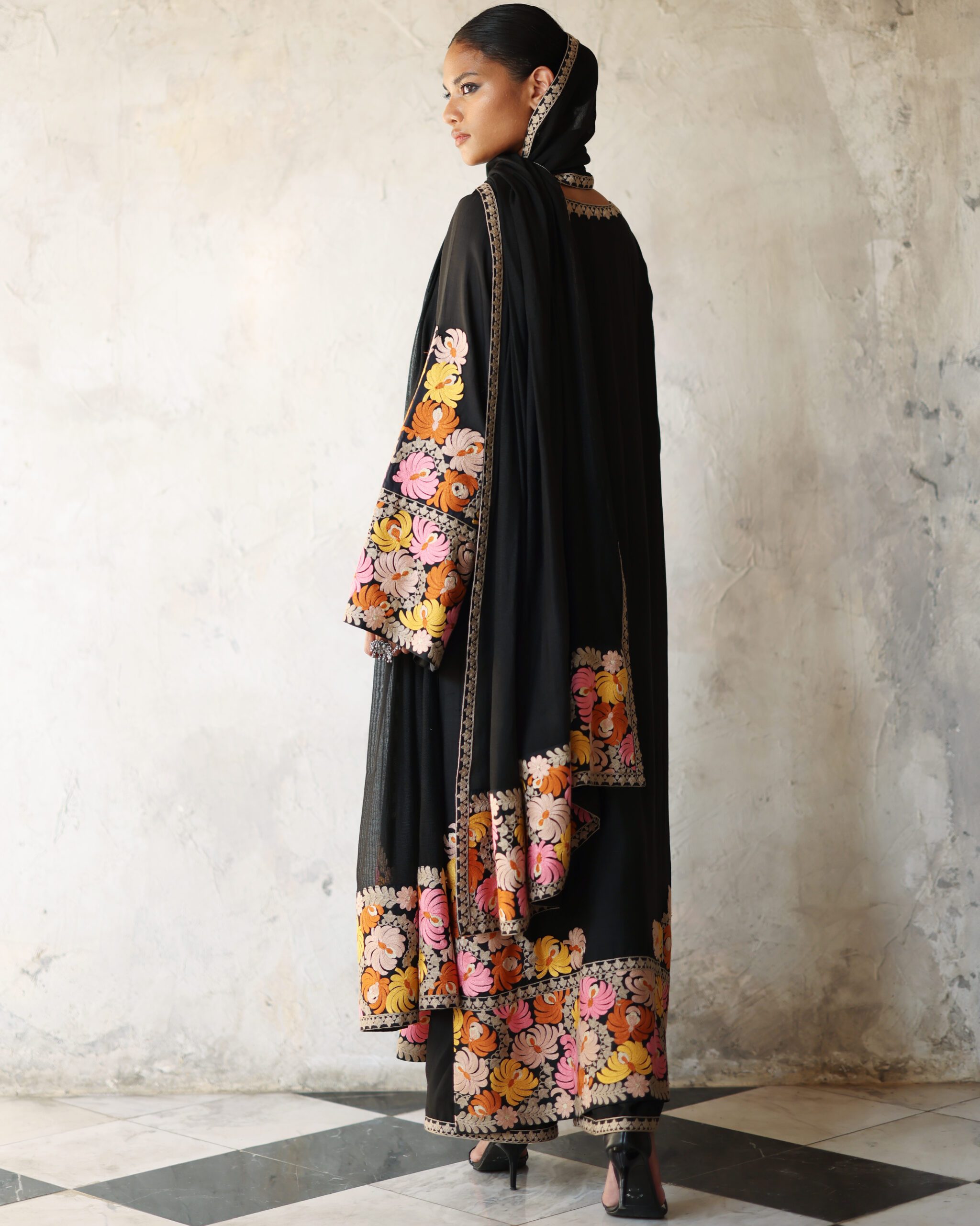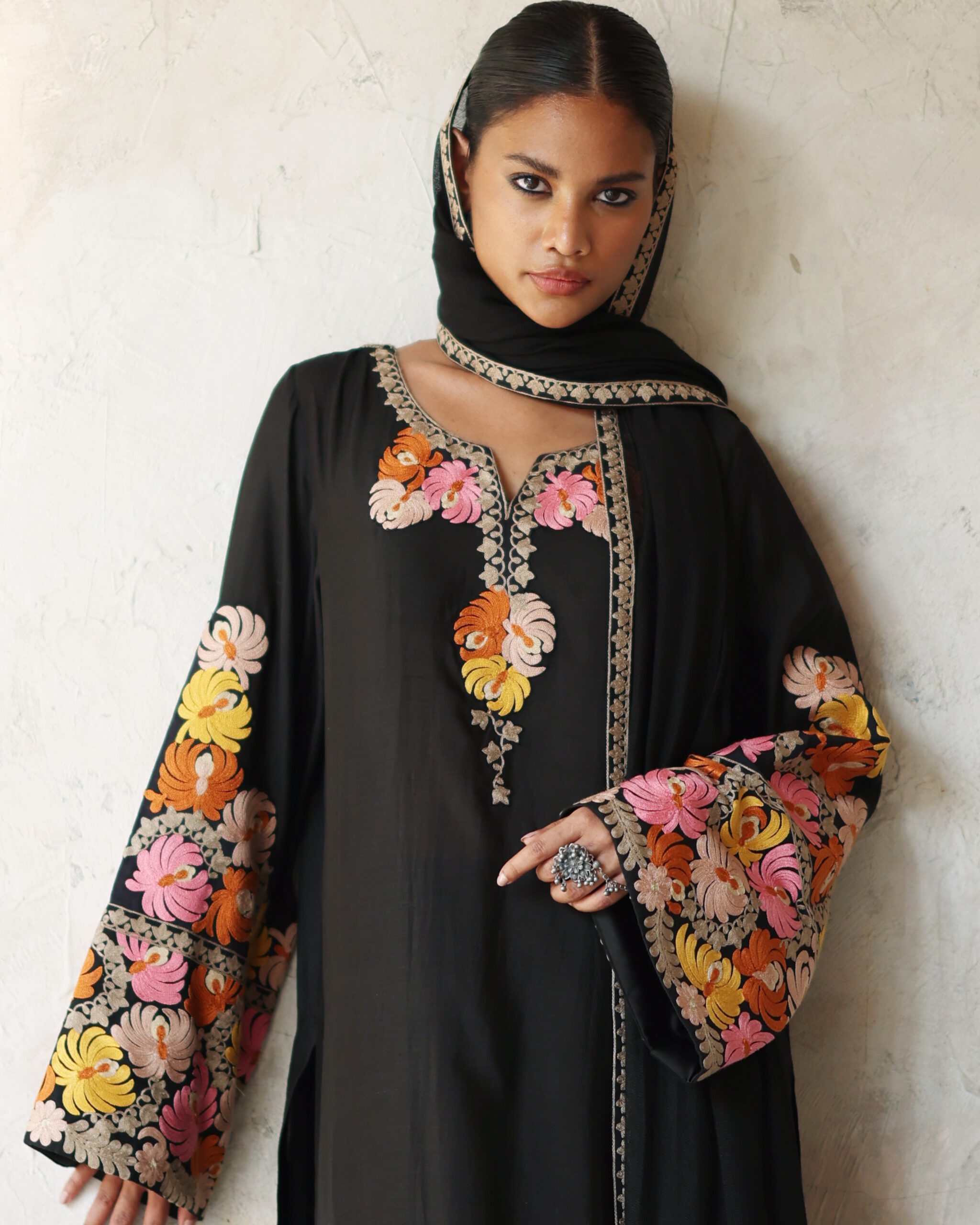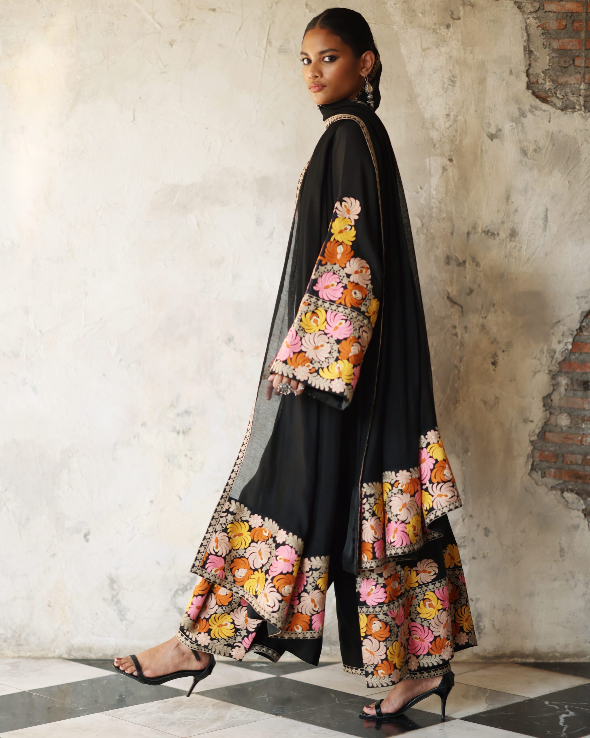 Shirt: Black khaddi silk long shirt with multicoloured embroidery