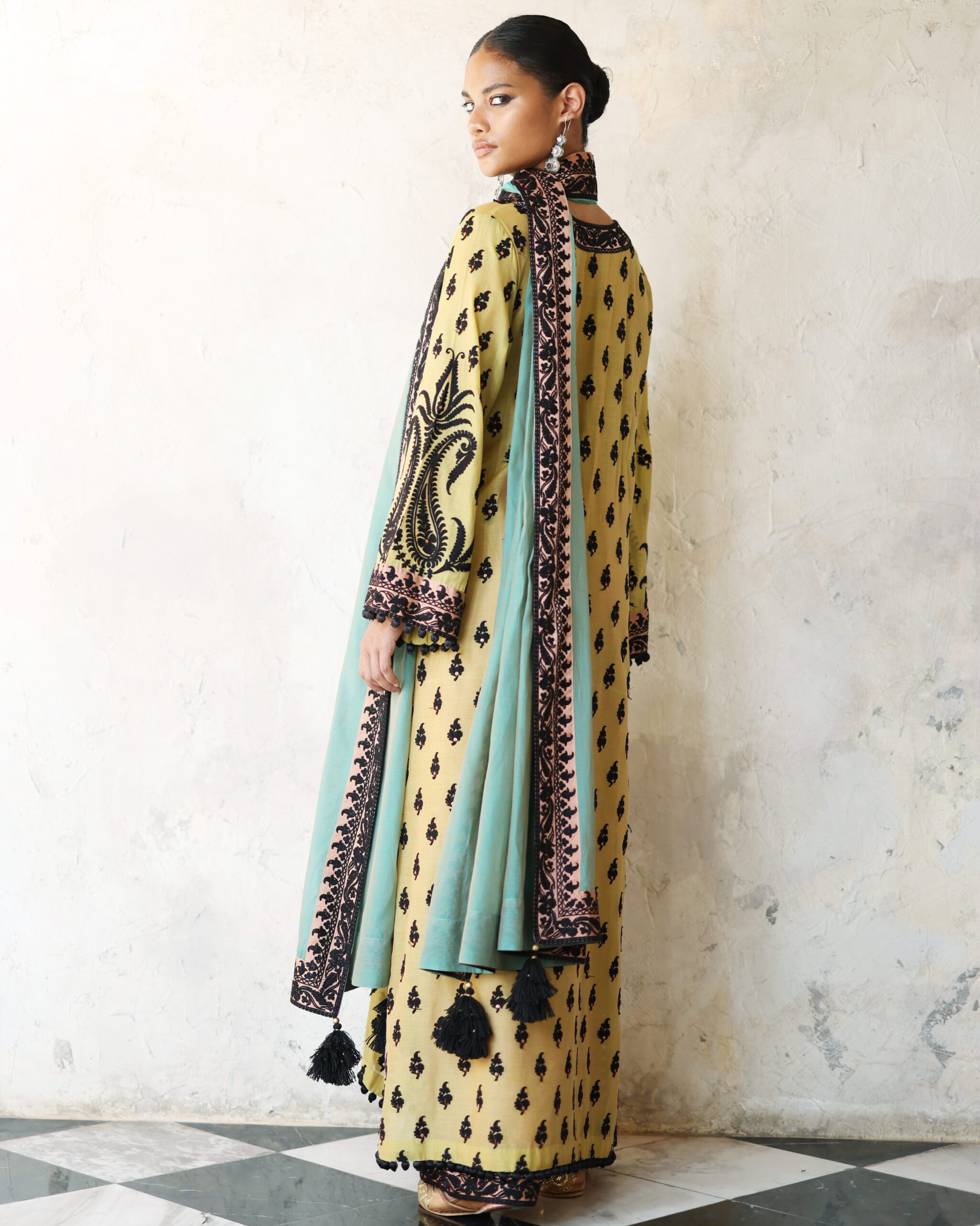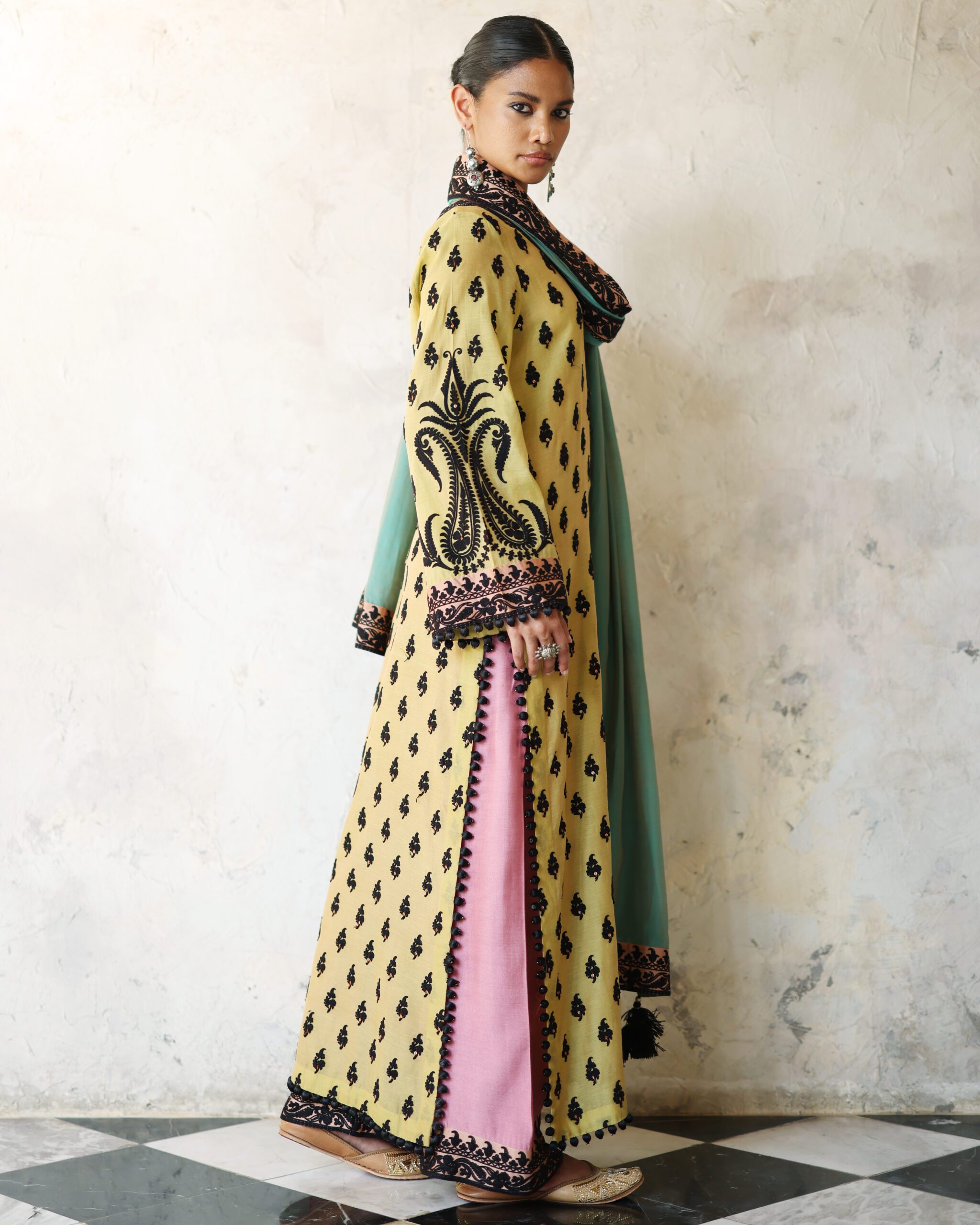 Shirt: Yellow two toned pure chanderi silk long shirt with black embroidery, sequins highlighting and black thread ball detailing on side slits and hem