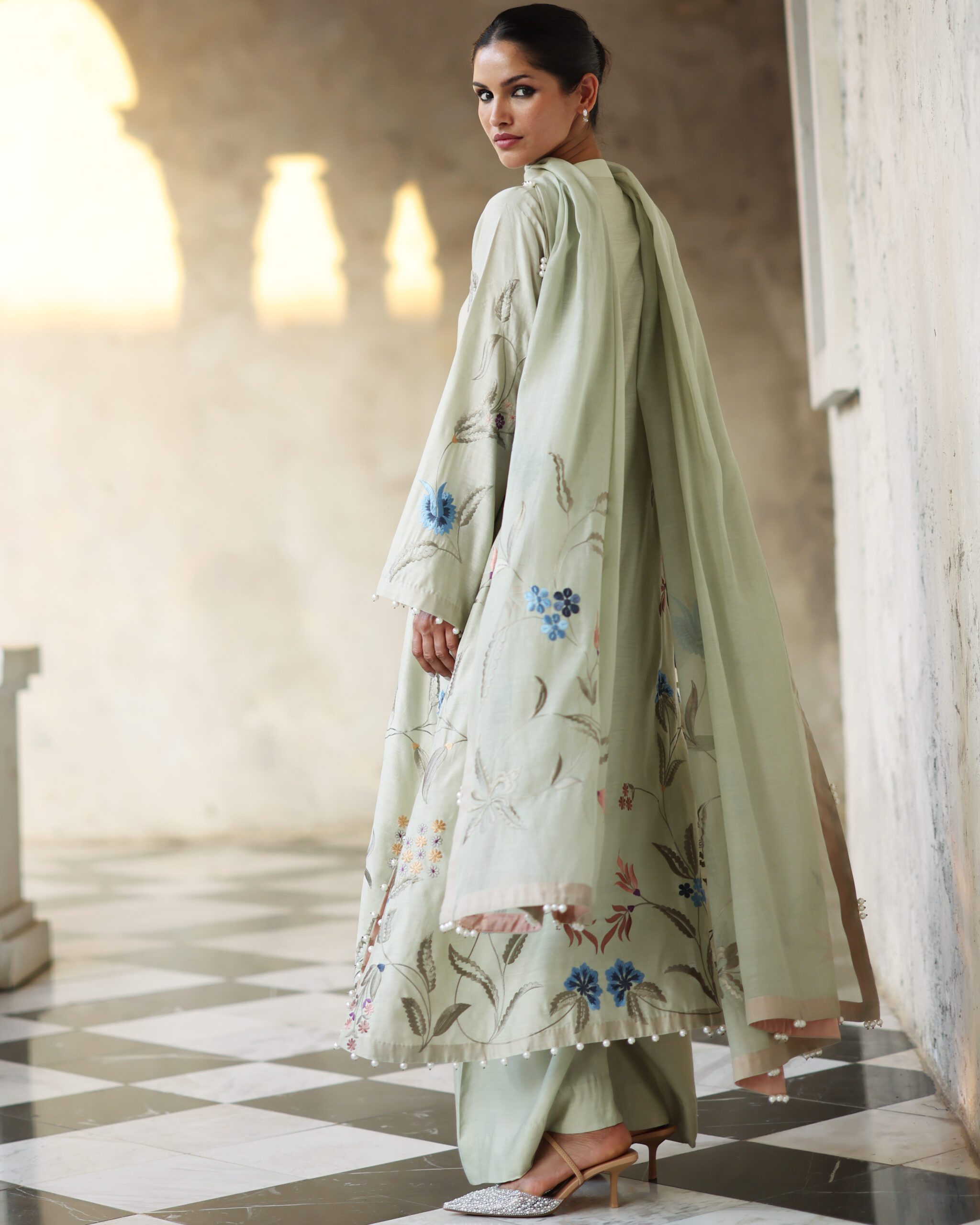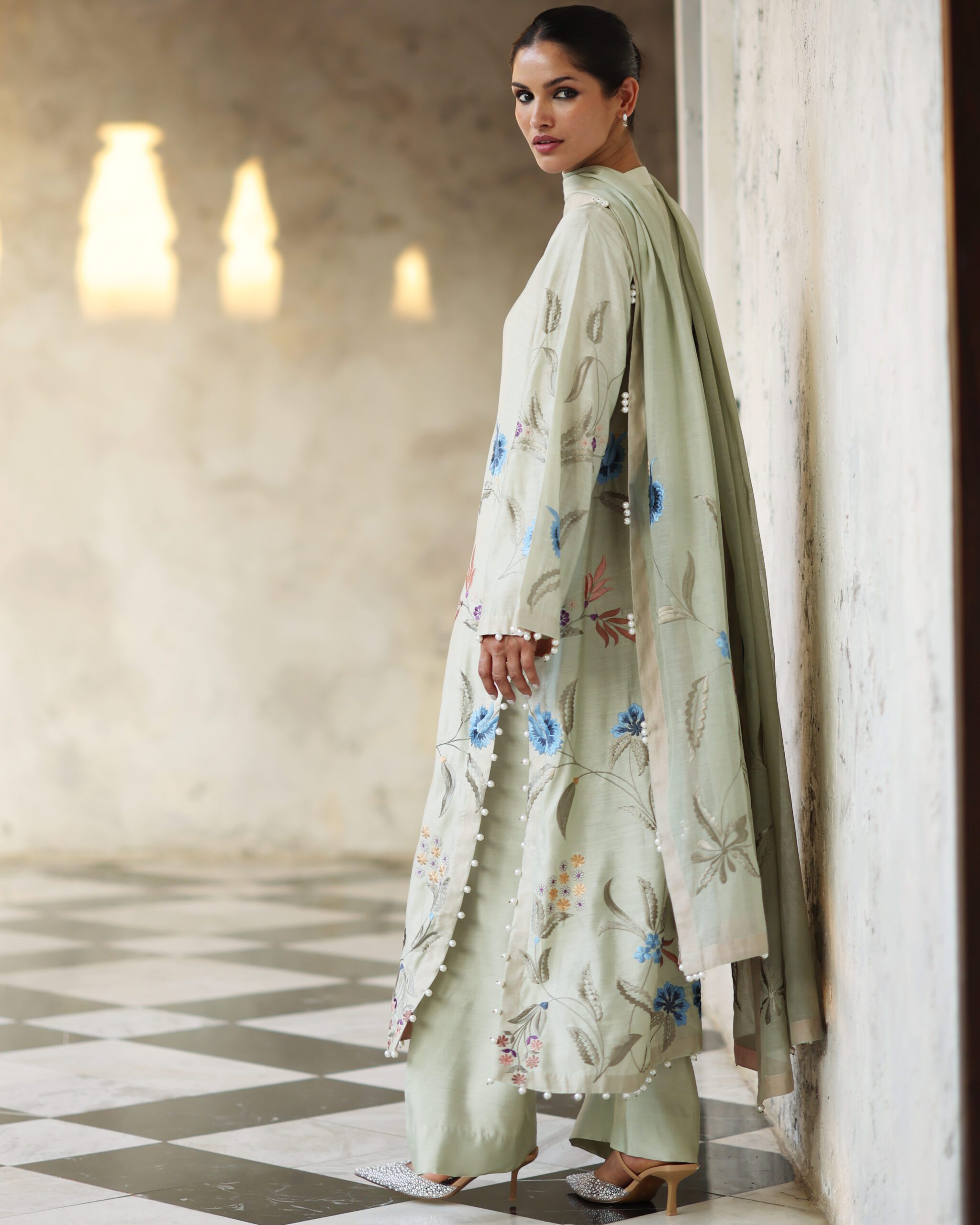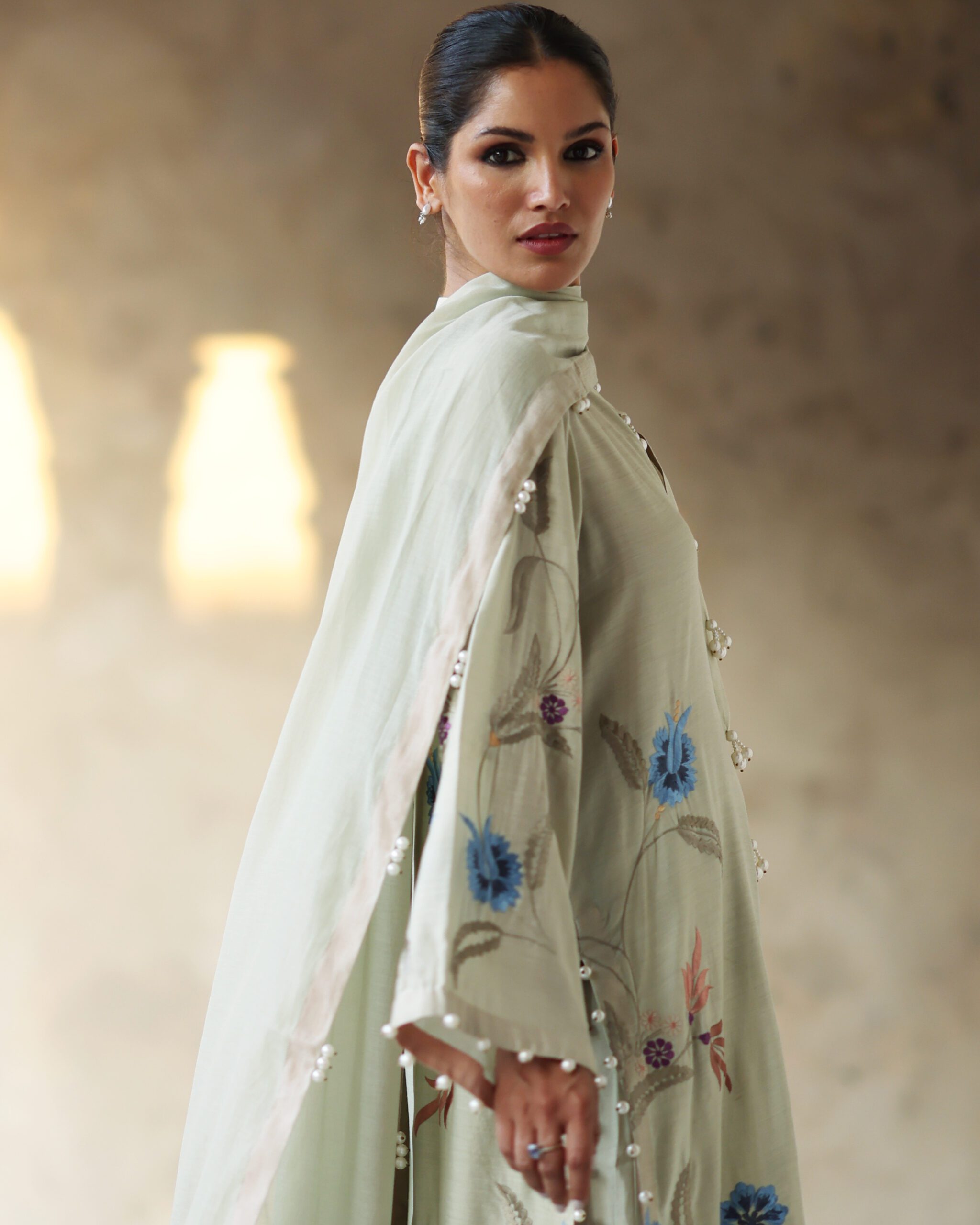 Shirt: Pistachio green khaddi silk long shirt with multicoloured gara embroidery and pearl detailing on sleeves, side slits and hem
