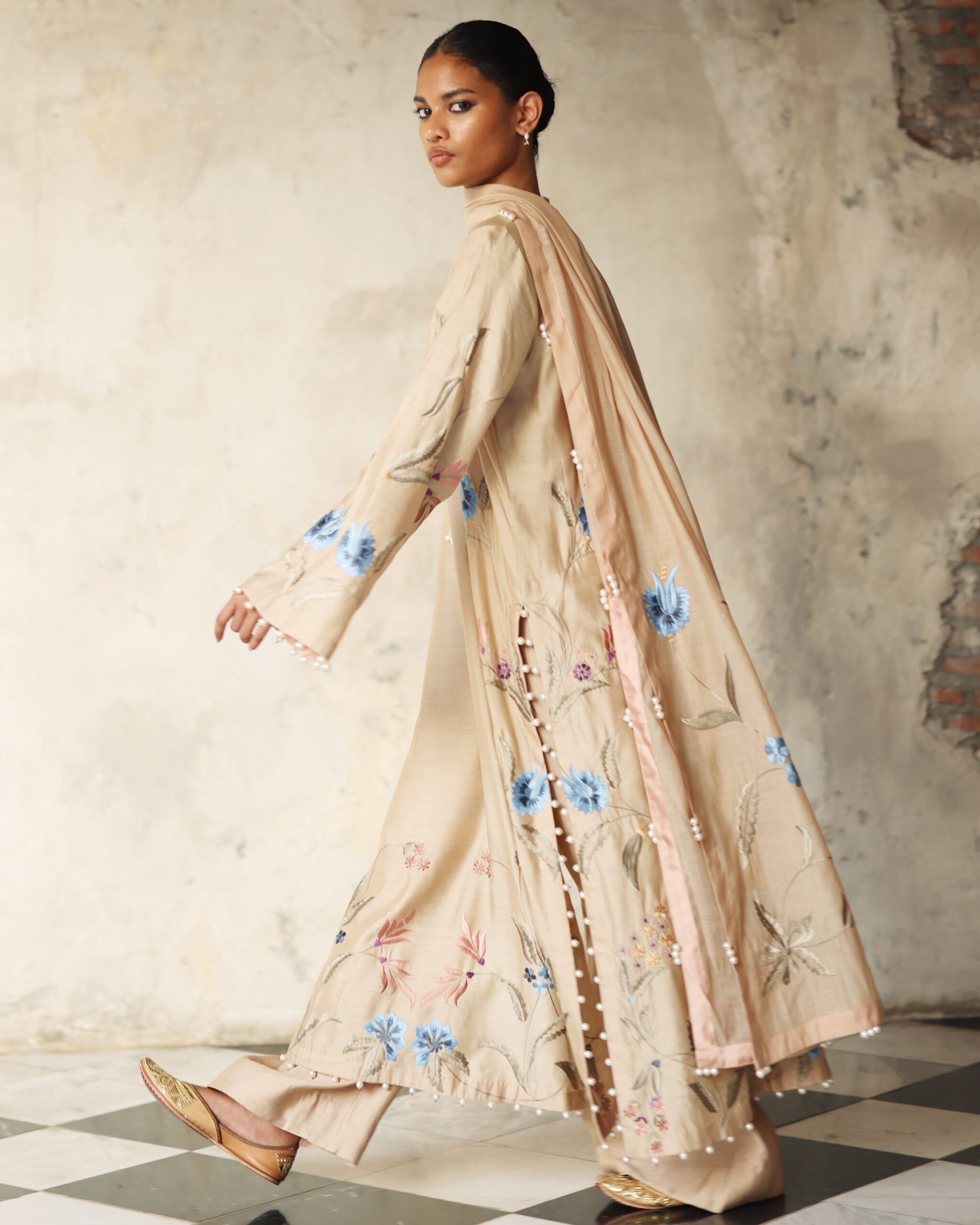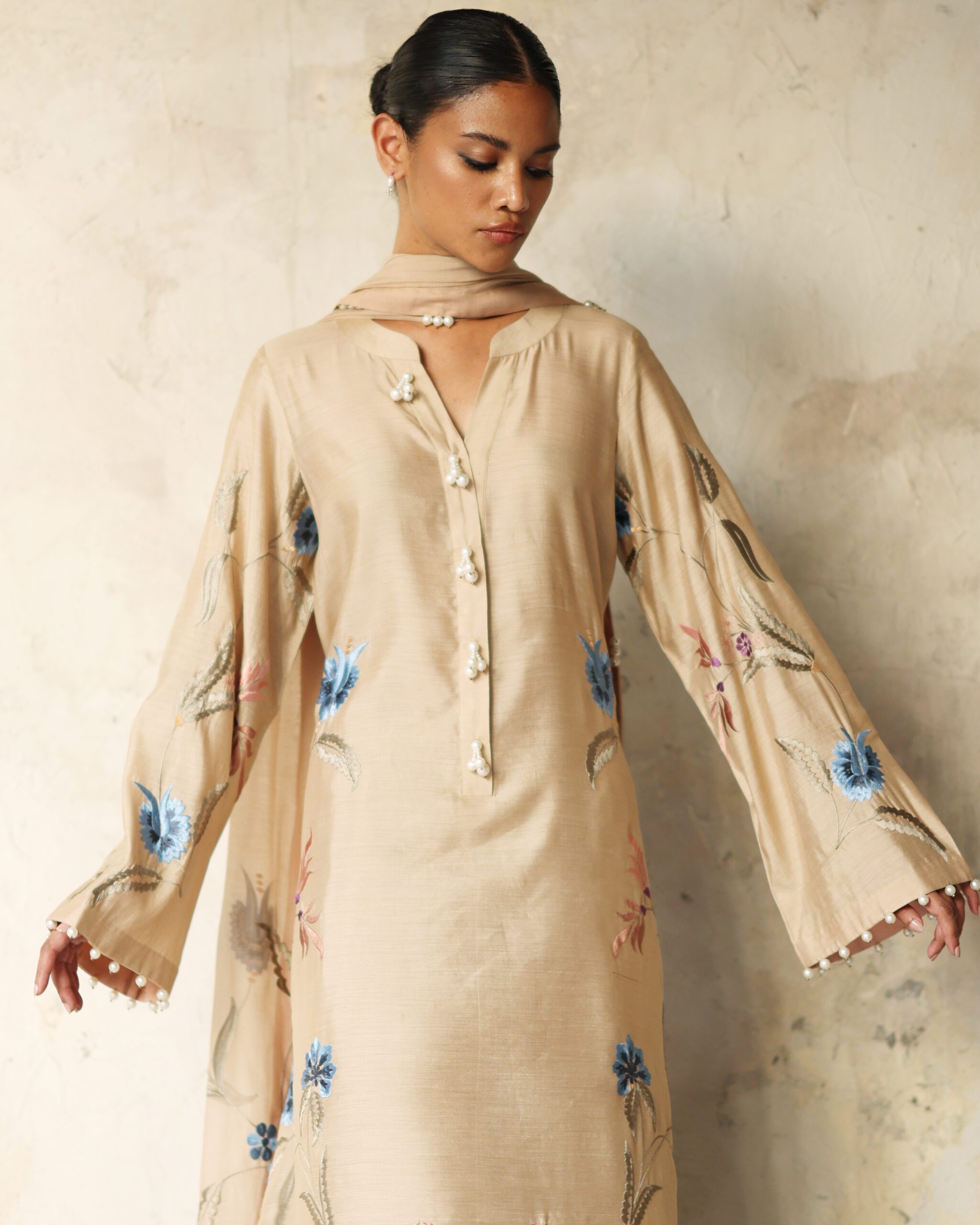Shirt: Beige khaddi silk long shirt with multicoloured gara embroidery and pearl detailing on sleeves, side slits and hem