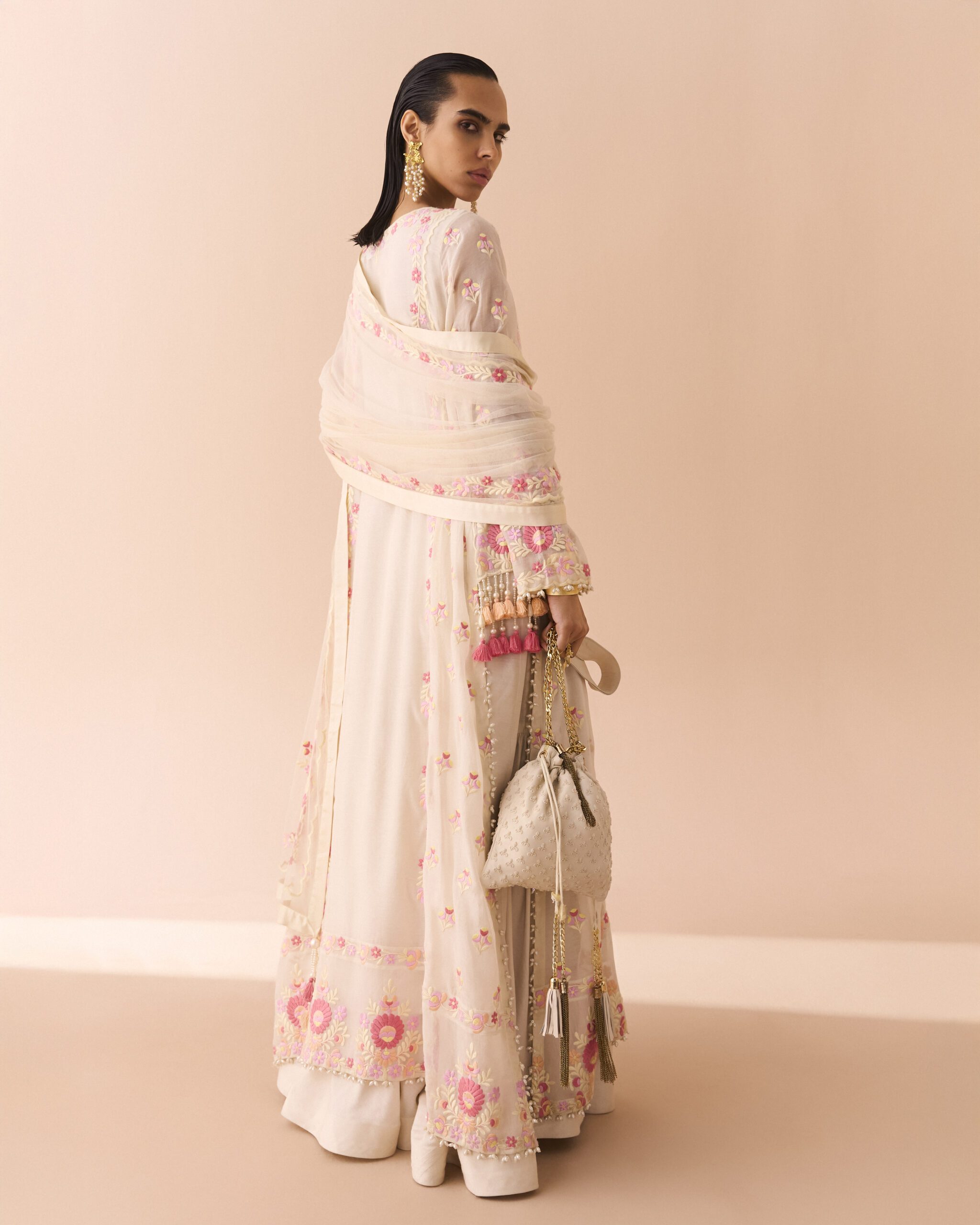 The model is wearing a gharara.