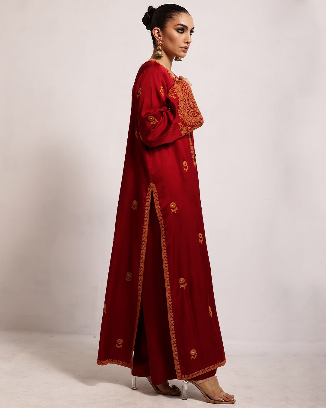 Shirt: Maroon shirt with dull orange thread work