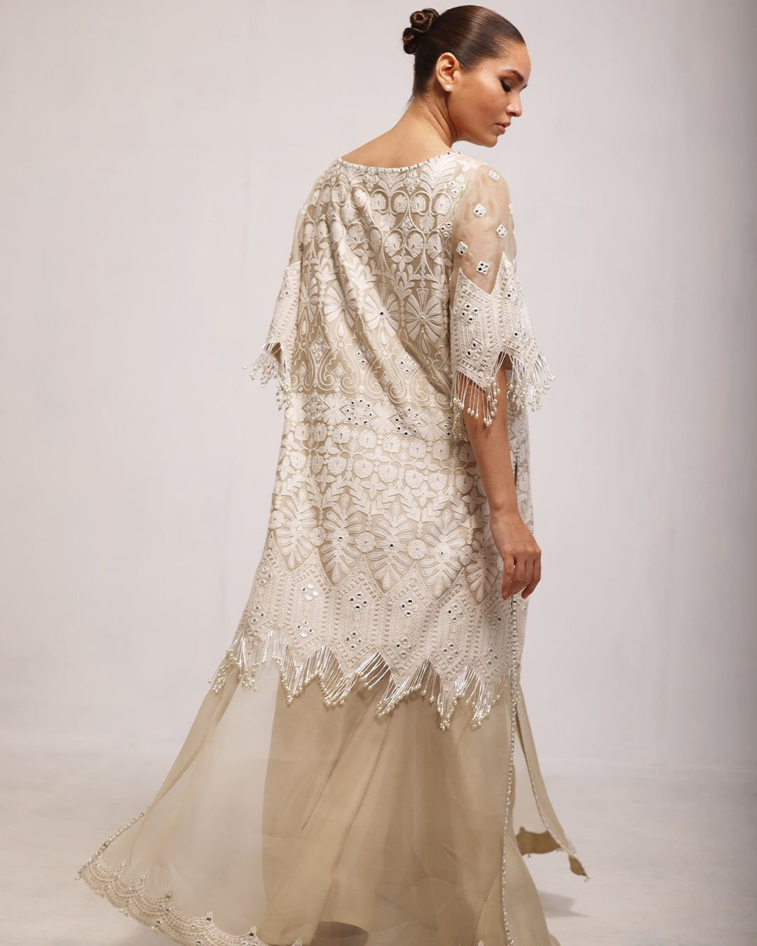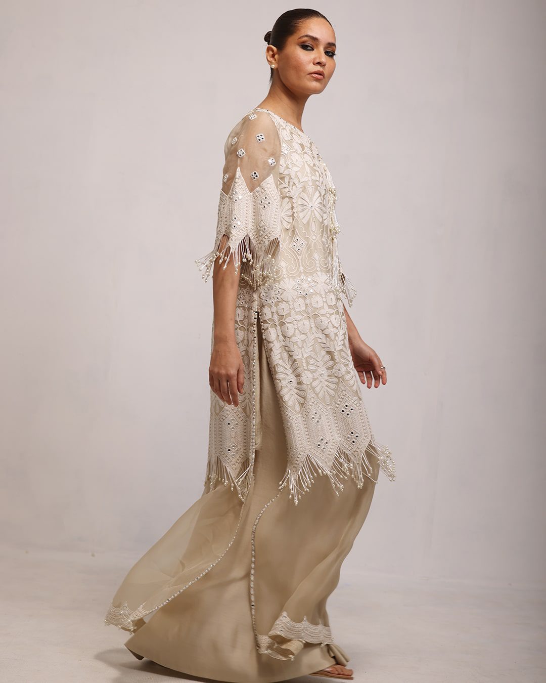 Shirt: Ivory heavily embellished shirt with organza, pearls and mirror work and tassels detailing