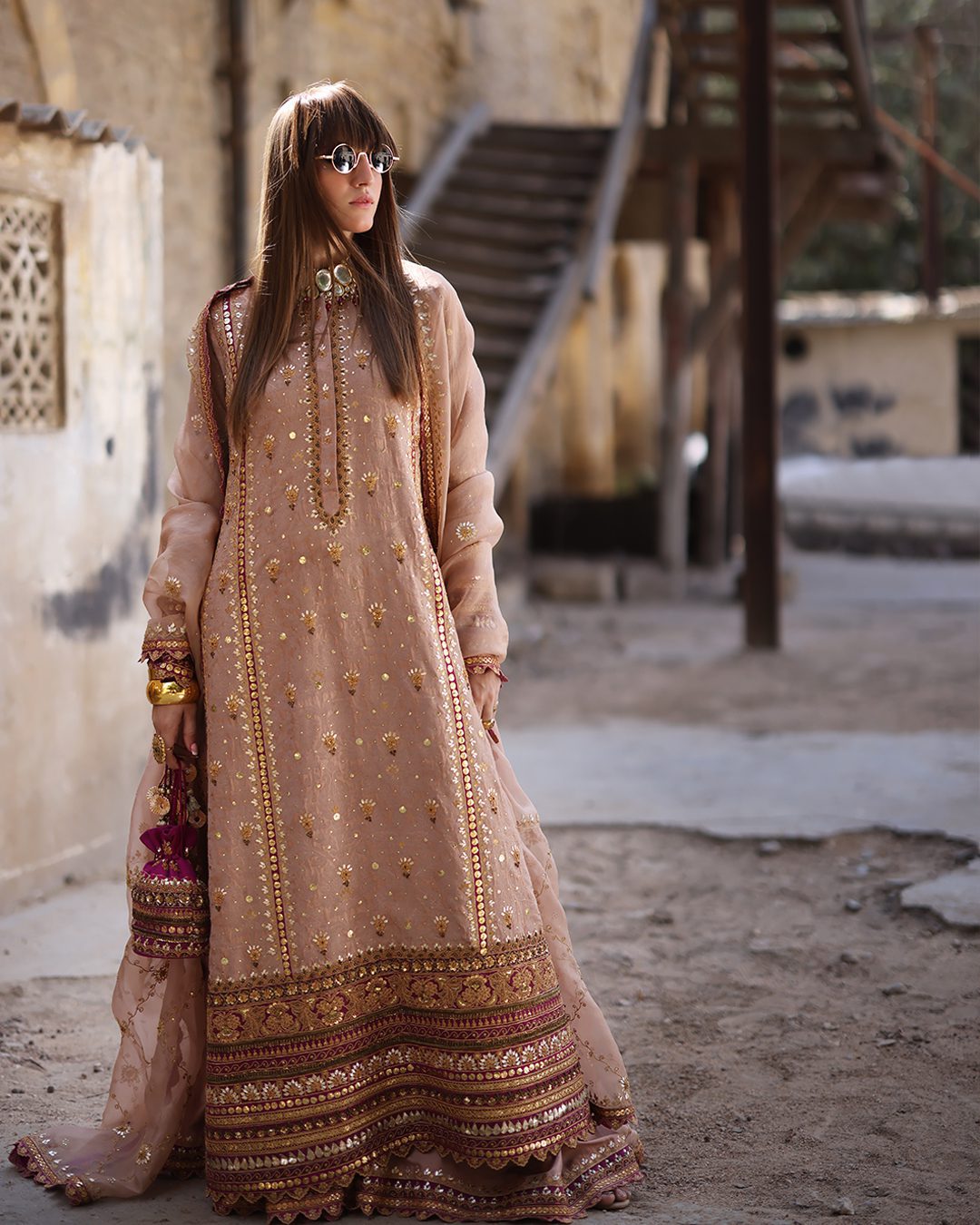 Dupatta: Dusty rose pure thick organza dupatta with four side border of gota and marori work and work on the pal- loos of gota and marori work