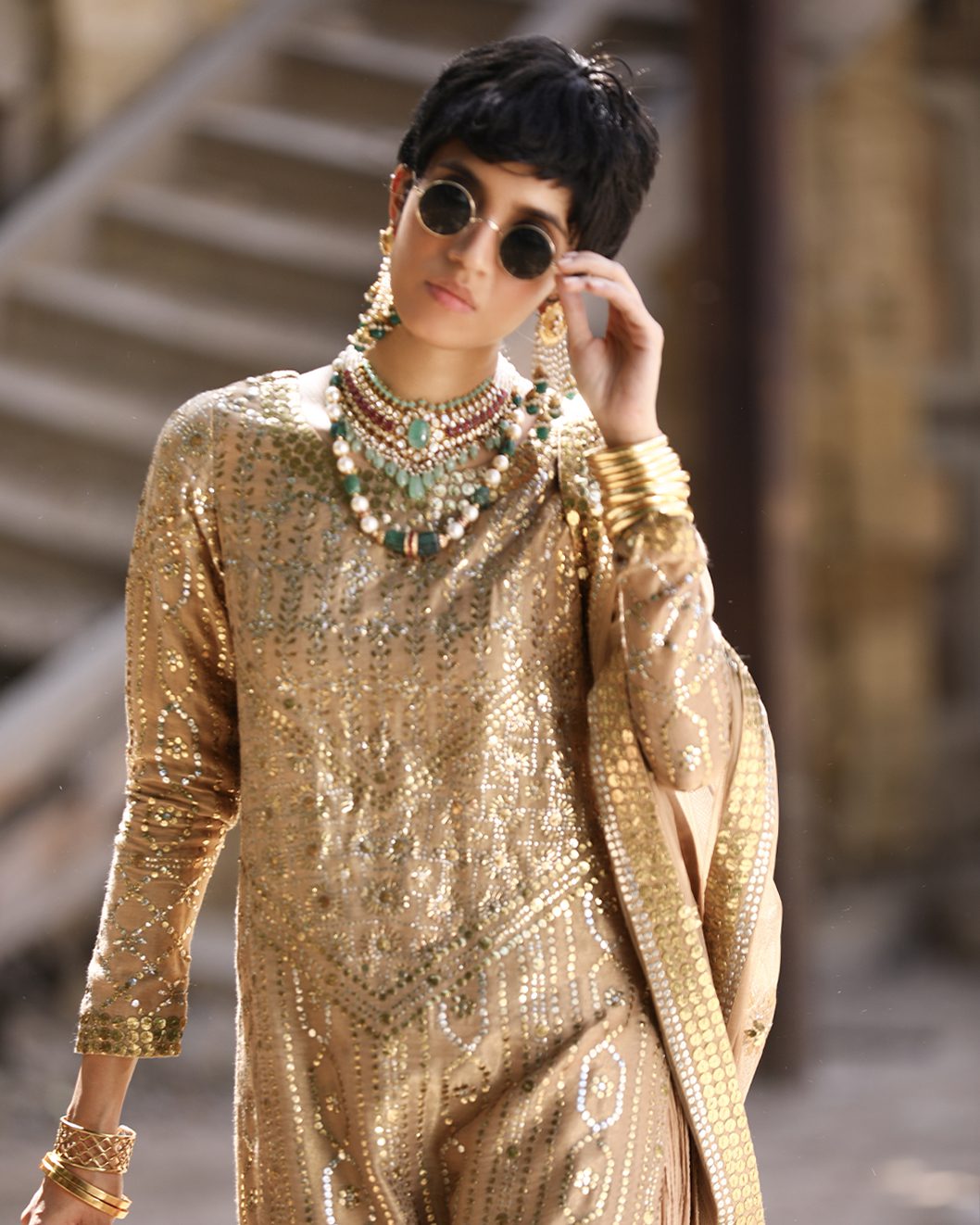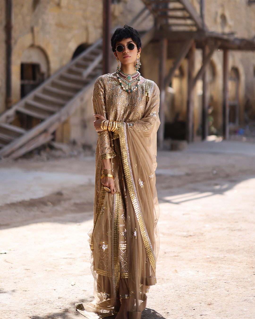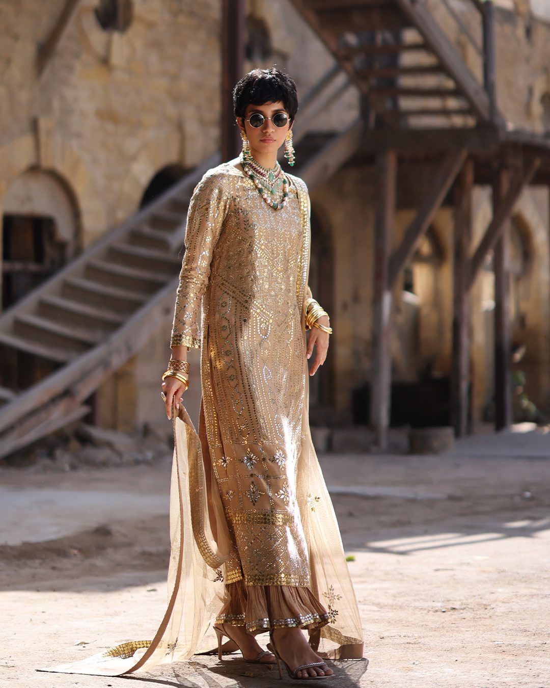 Finely crafted peachy gold ensemble embellished with meticulous mukesh work.