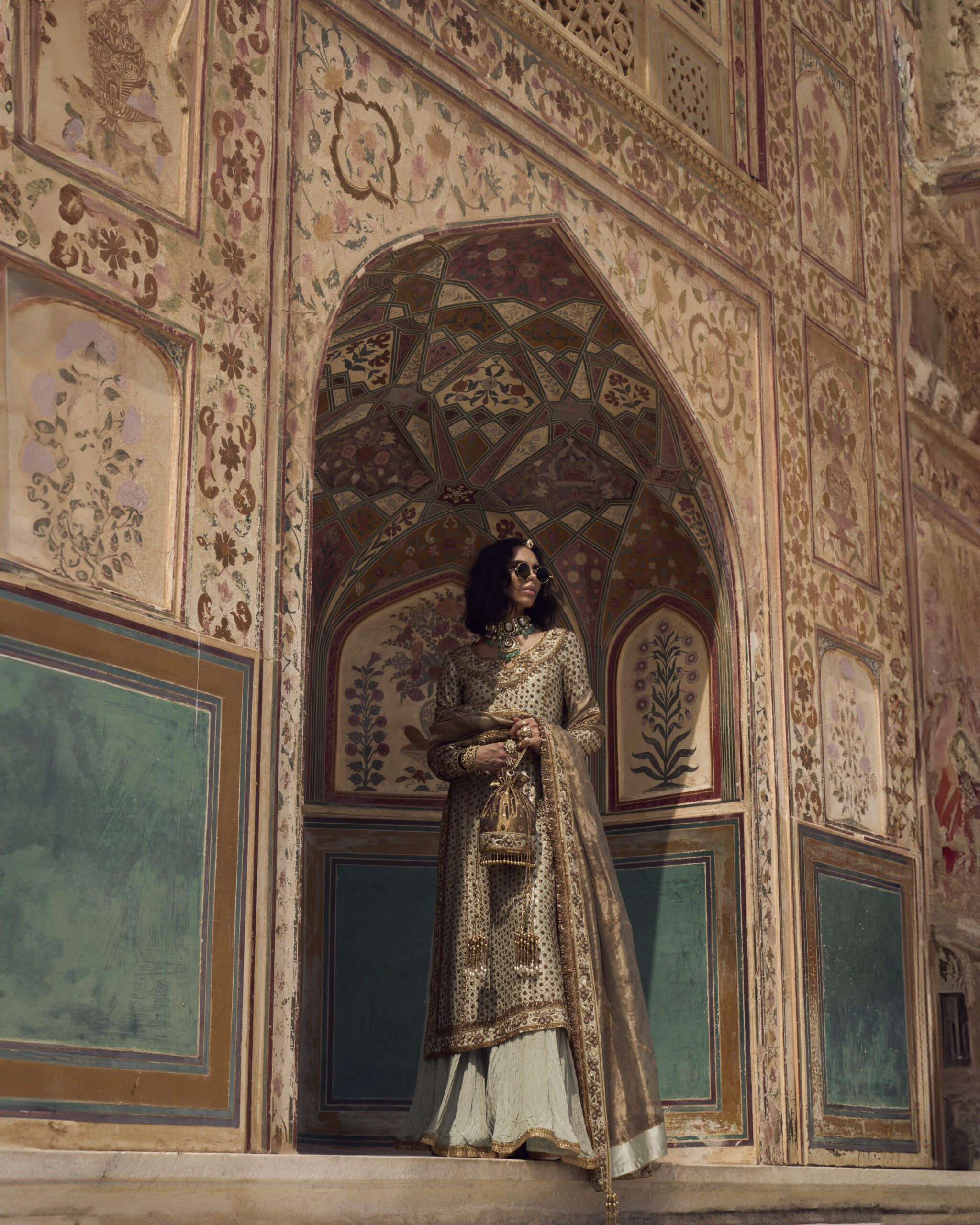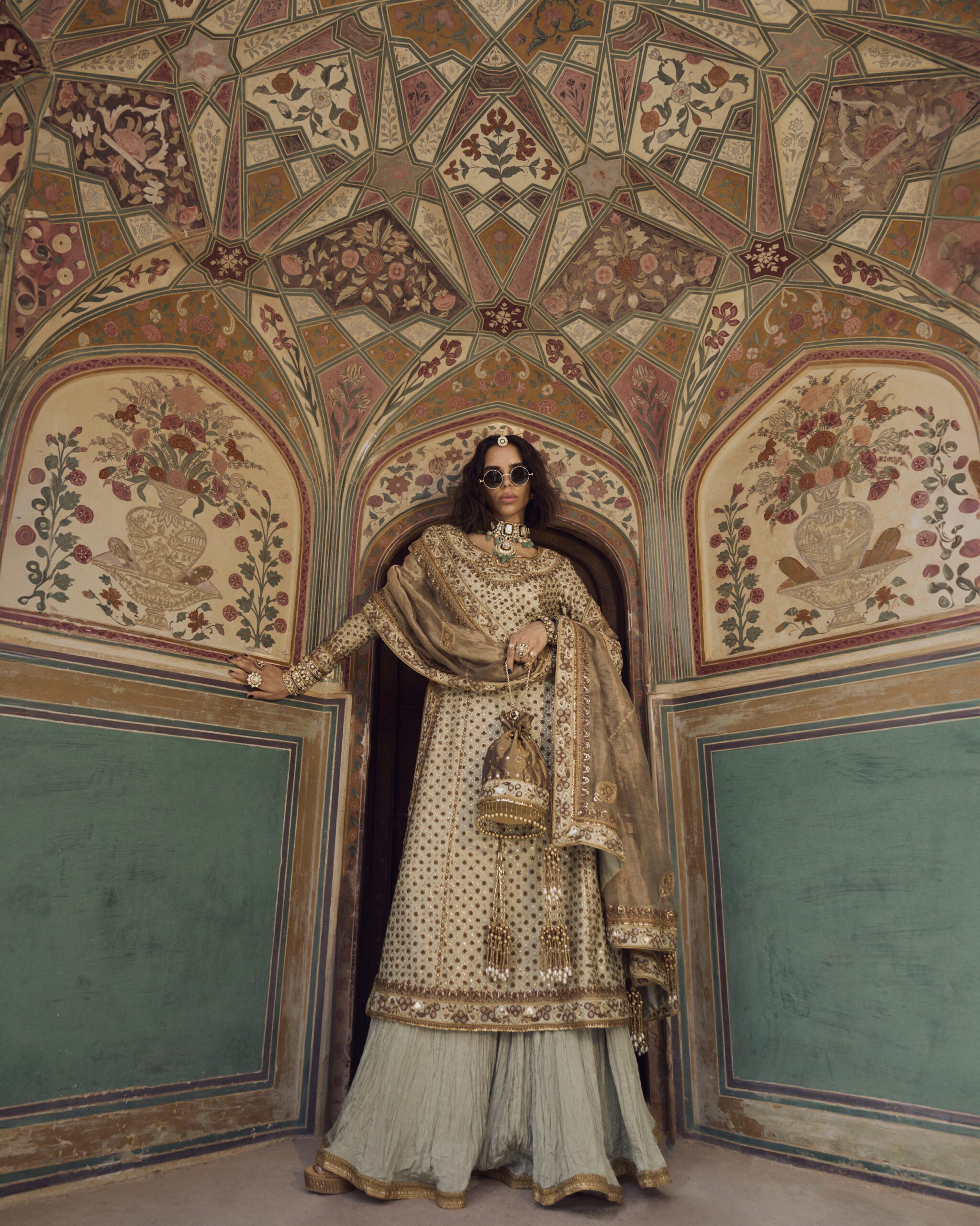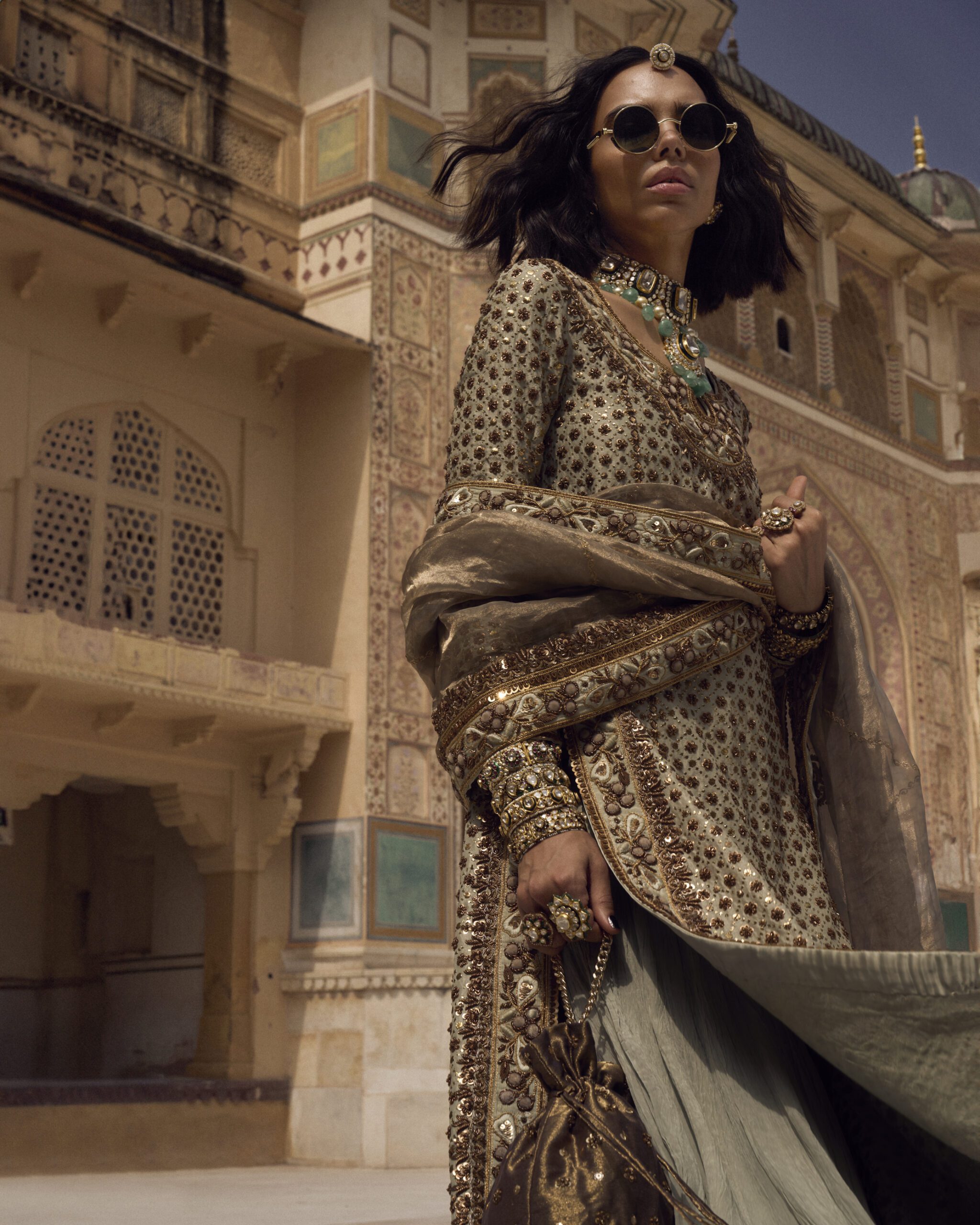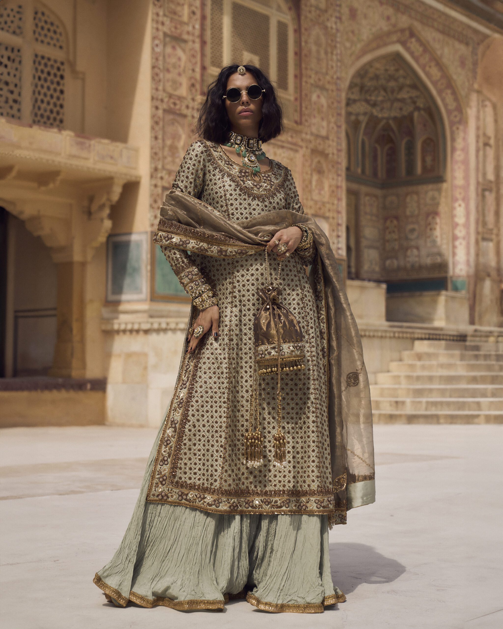 Shirt: Mint green pure raw silk shirt with resham, zardozi, dabka, nakshi and kaamdani jaal all over