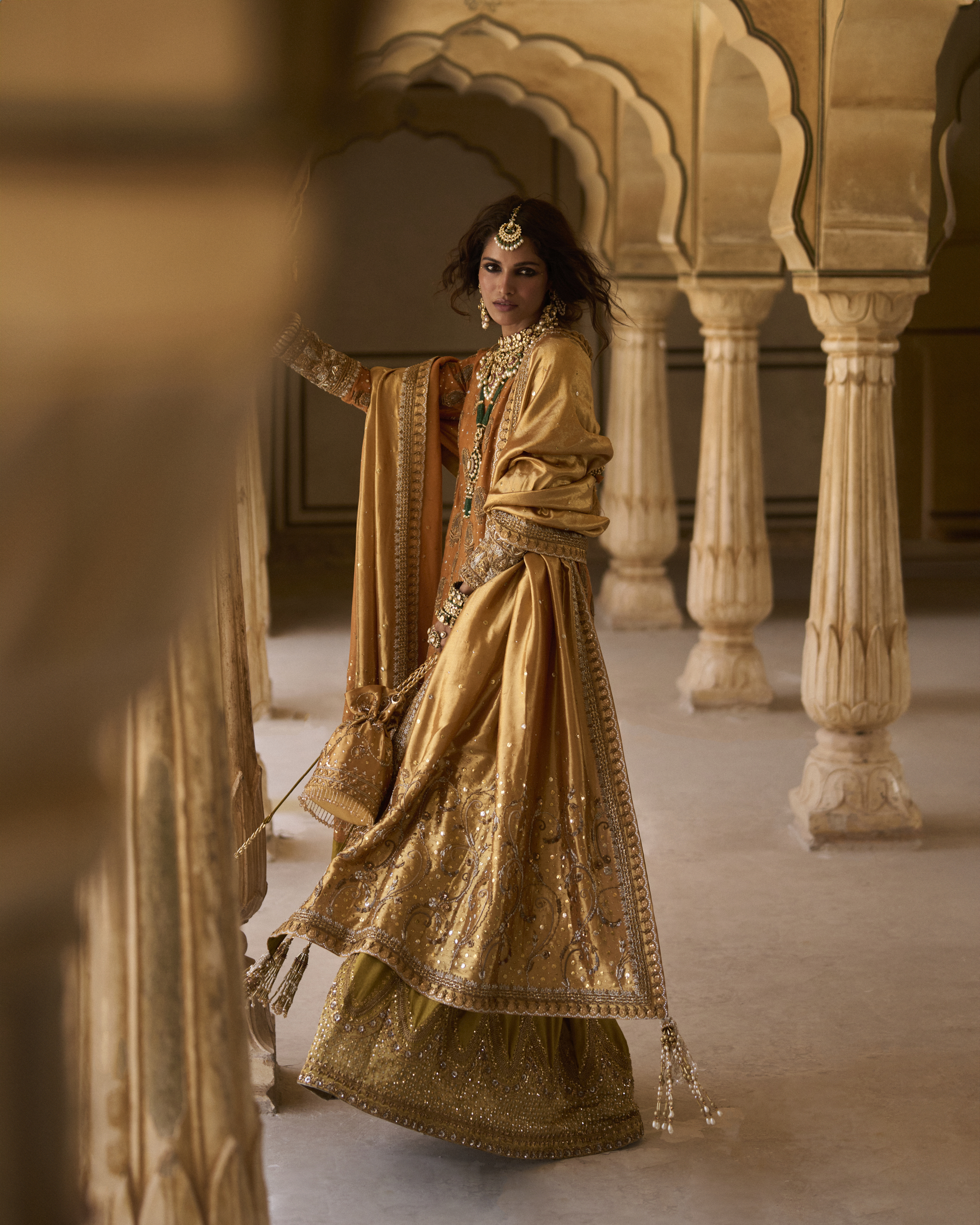 Dupatta: Mustard pure lamè tissue dupatta with heavy work on four side borders and palloo, with sprinkles of kaamdani all over