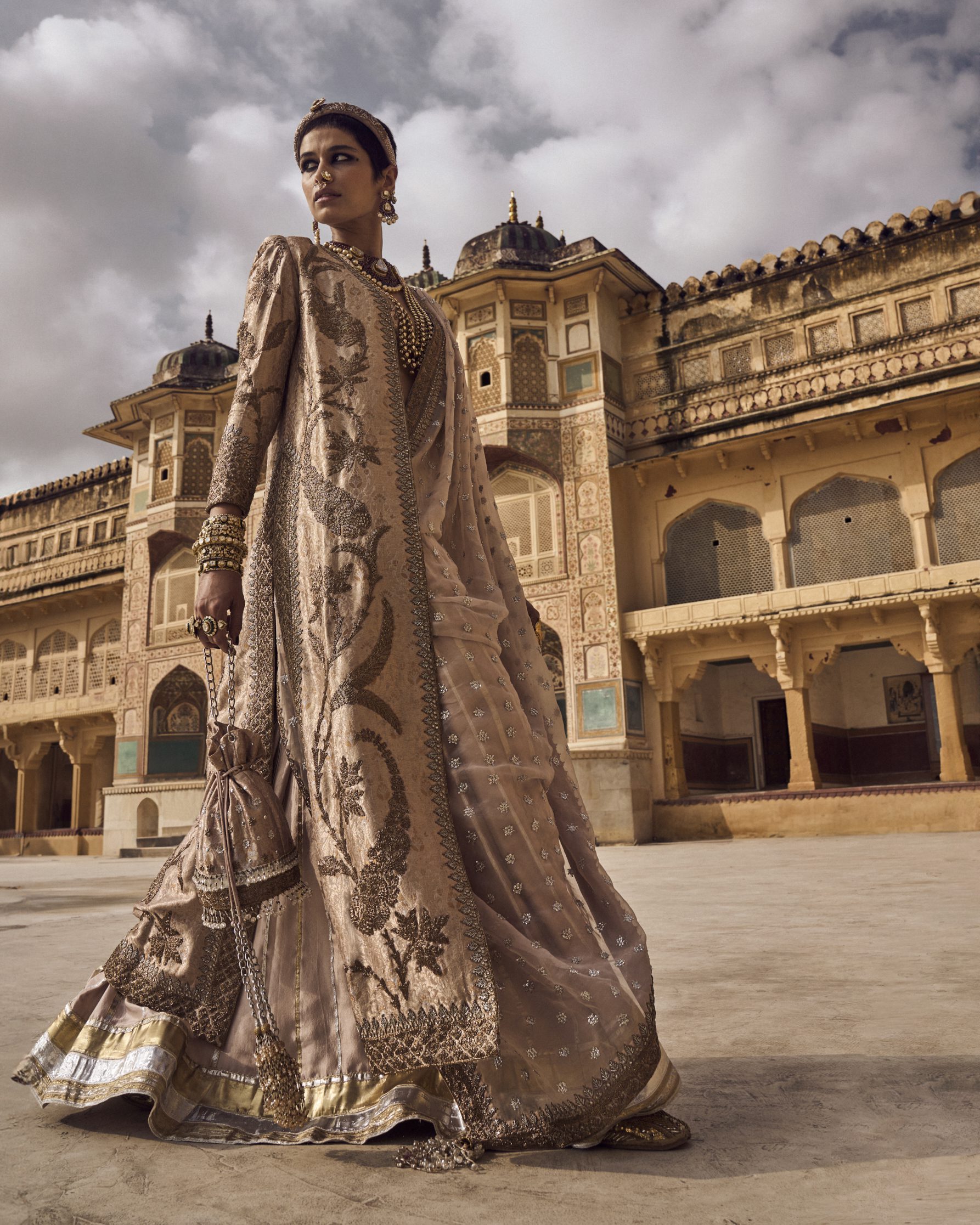 Jacket: Soft pink pure atlas jamavar jacket consisting of antique nakshi, dabka and zardozi work with silver stones