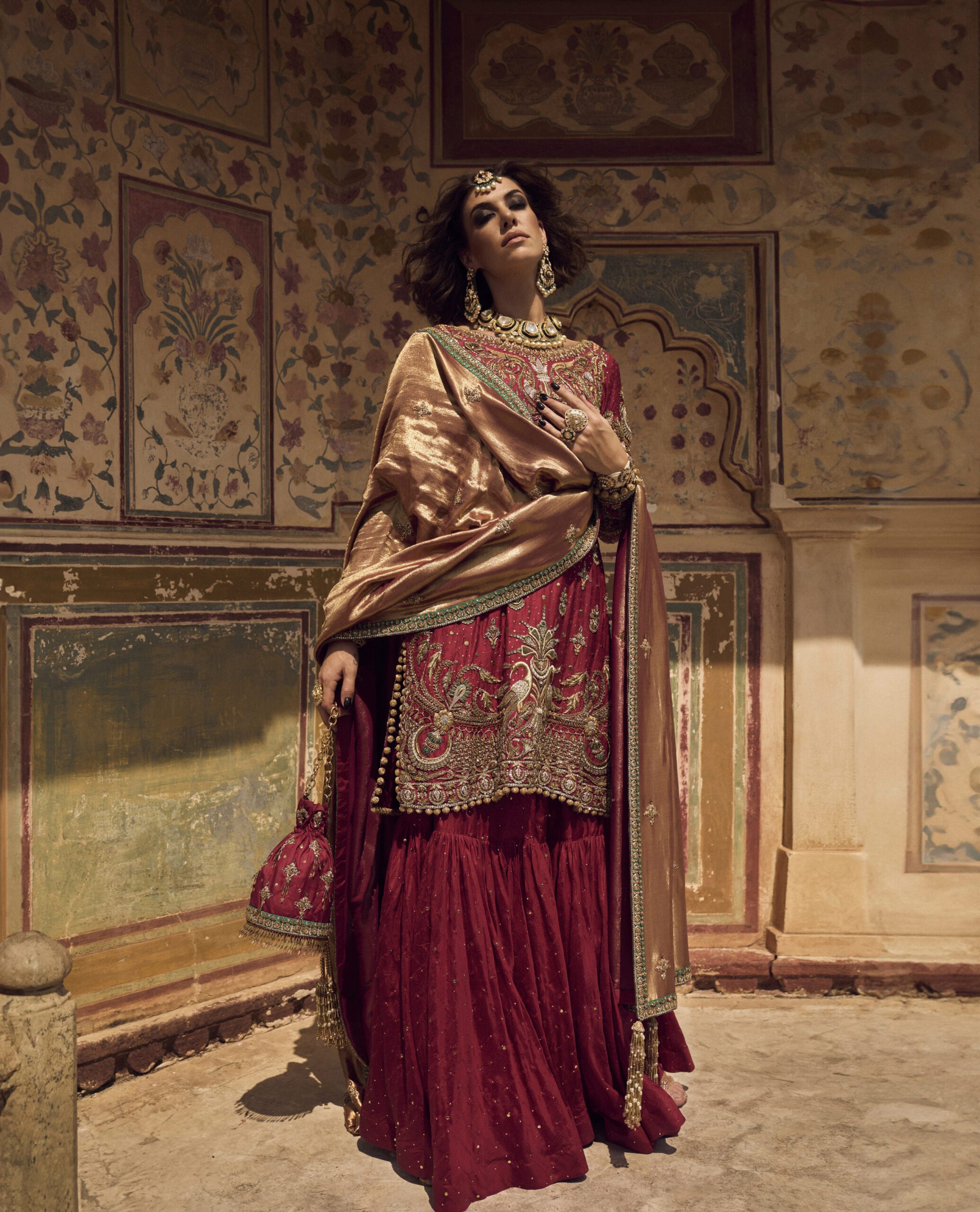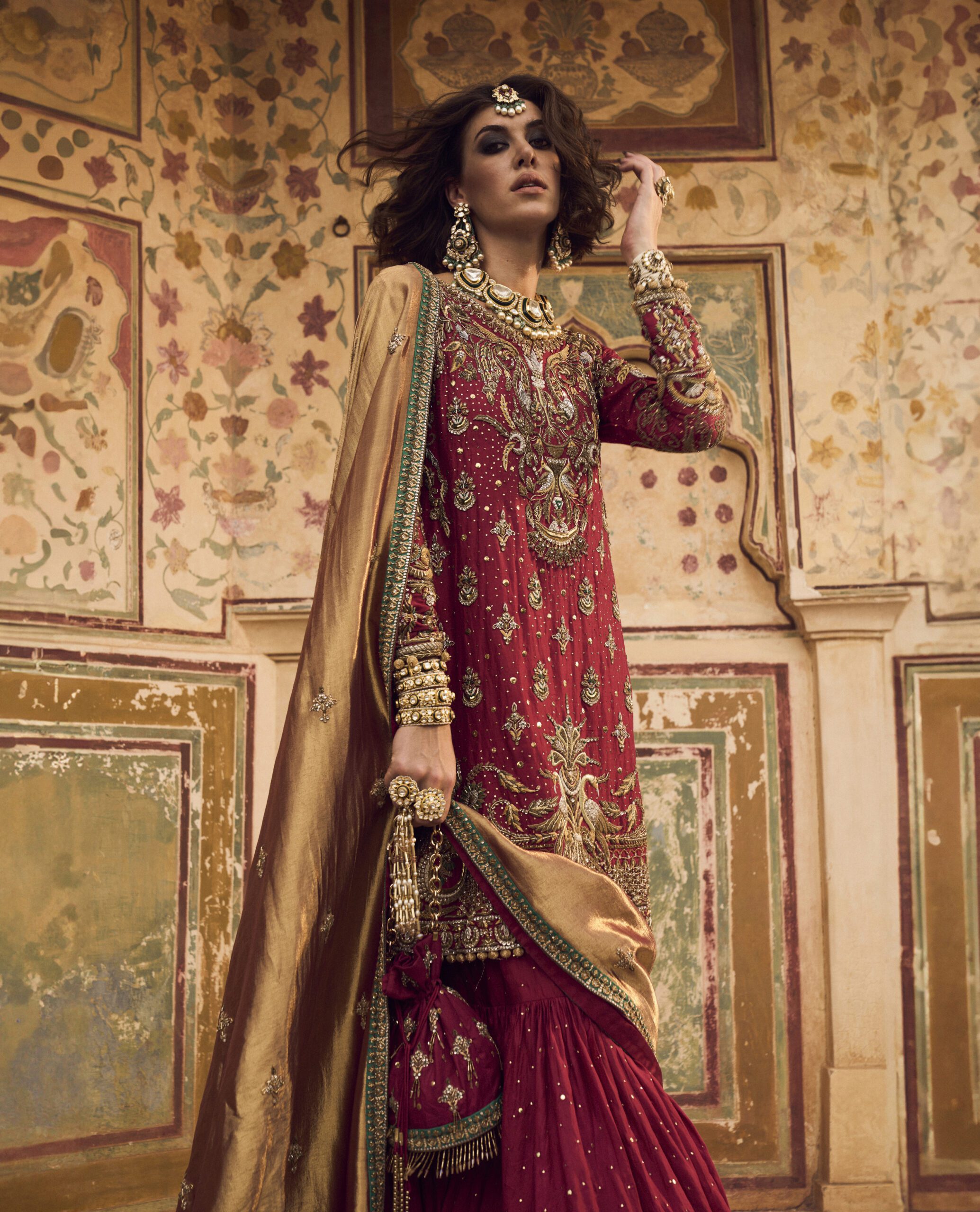 Bottom: Rose red pure kattan silk gharara with sprinkle of kaamdani all over