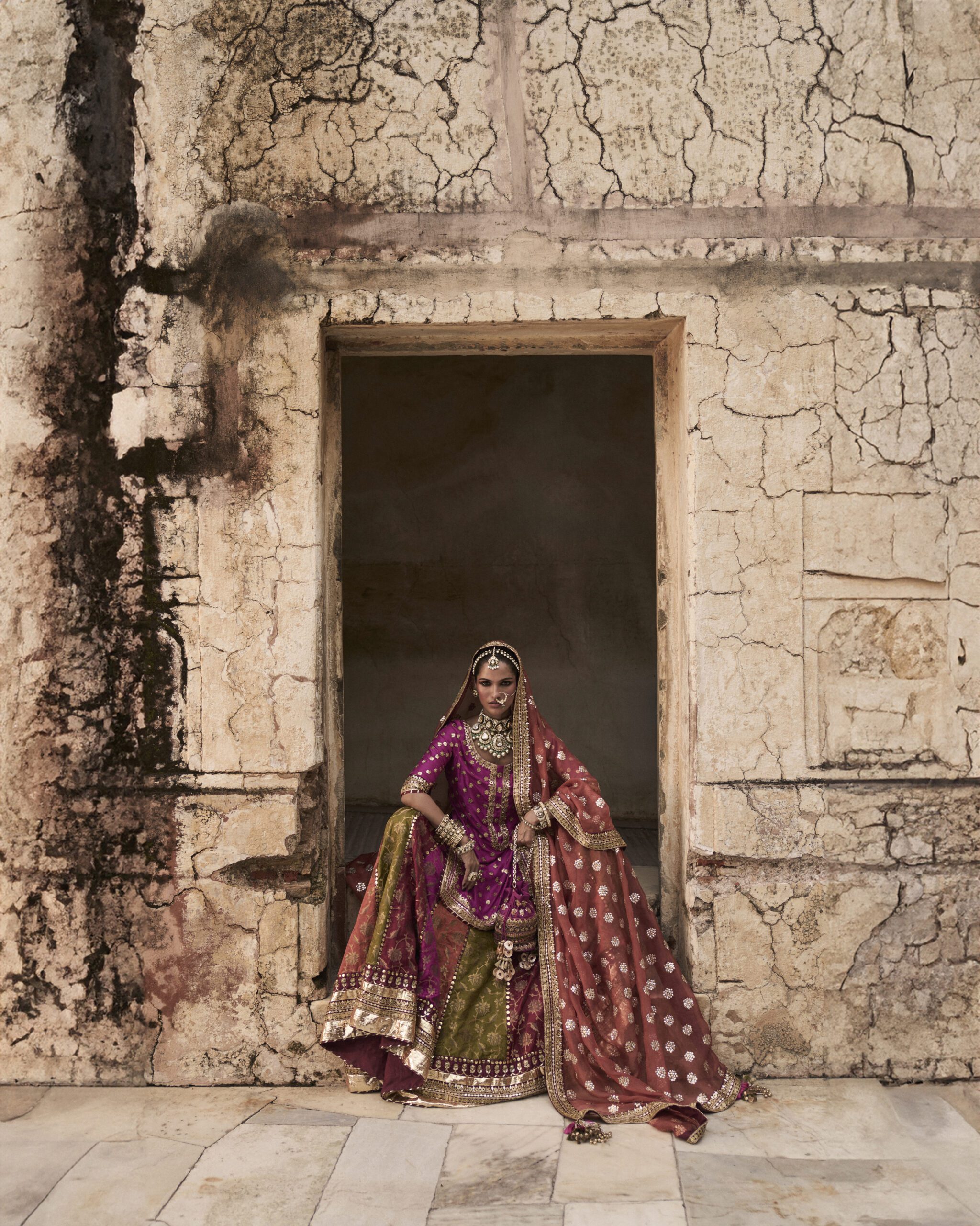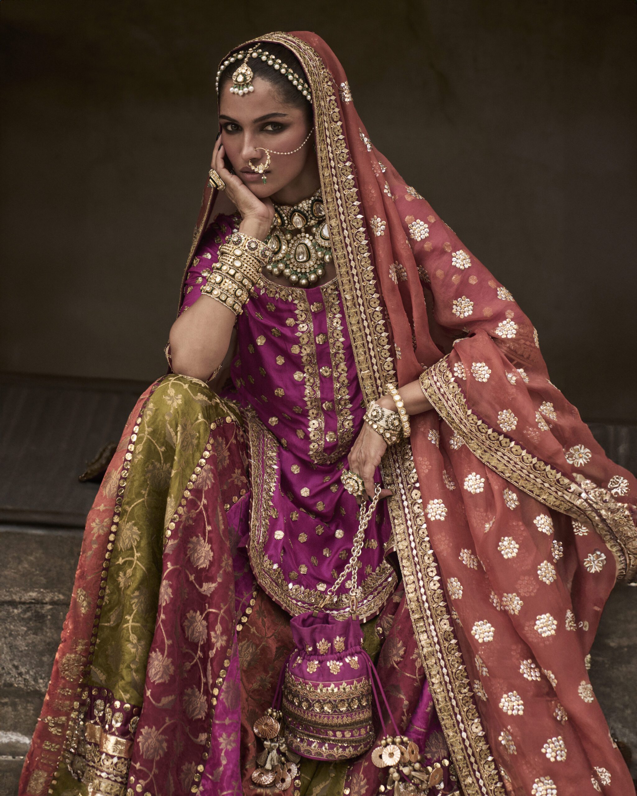 Bottom: Multicoloured pure jamavar lehenga with gota work border and kaamdani