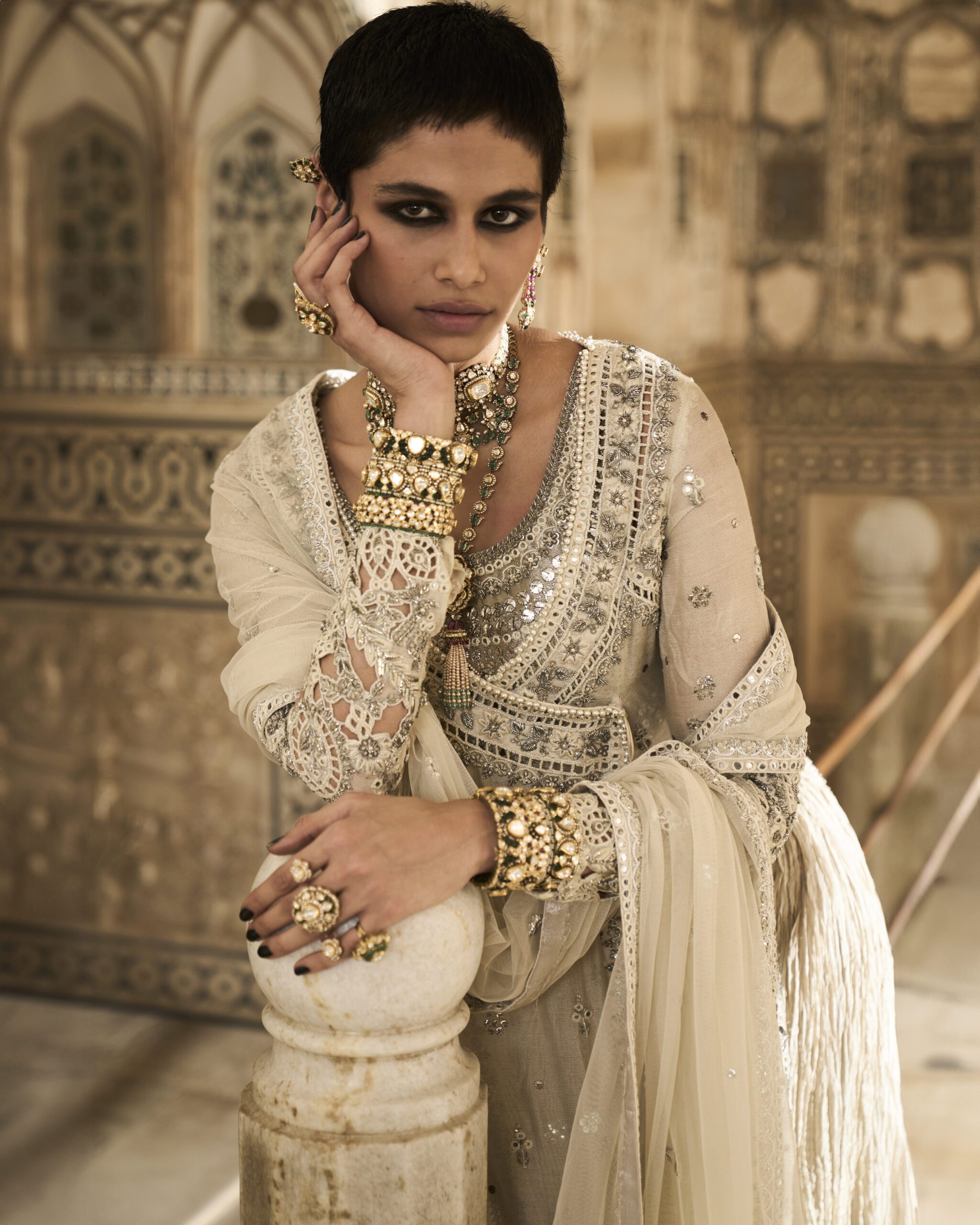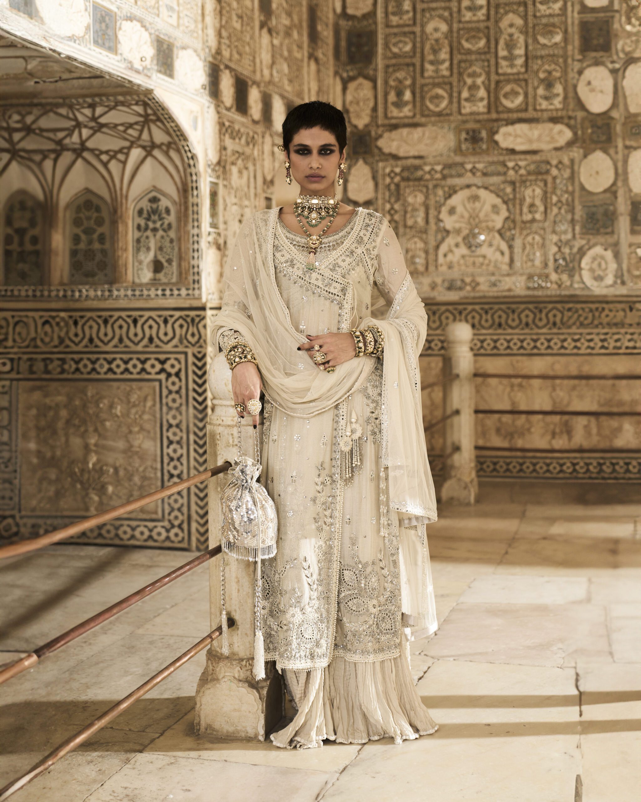 Angarkha: Off white pure silk net angarkha with zardozi, kaamdani and mirror work and pearl finishing