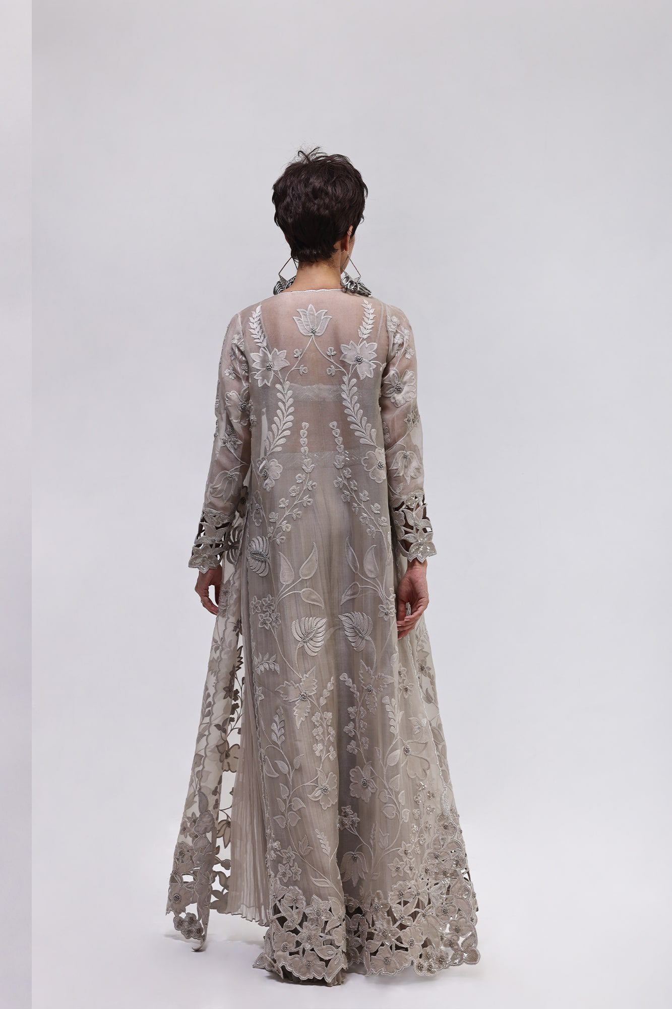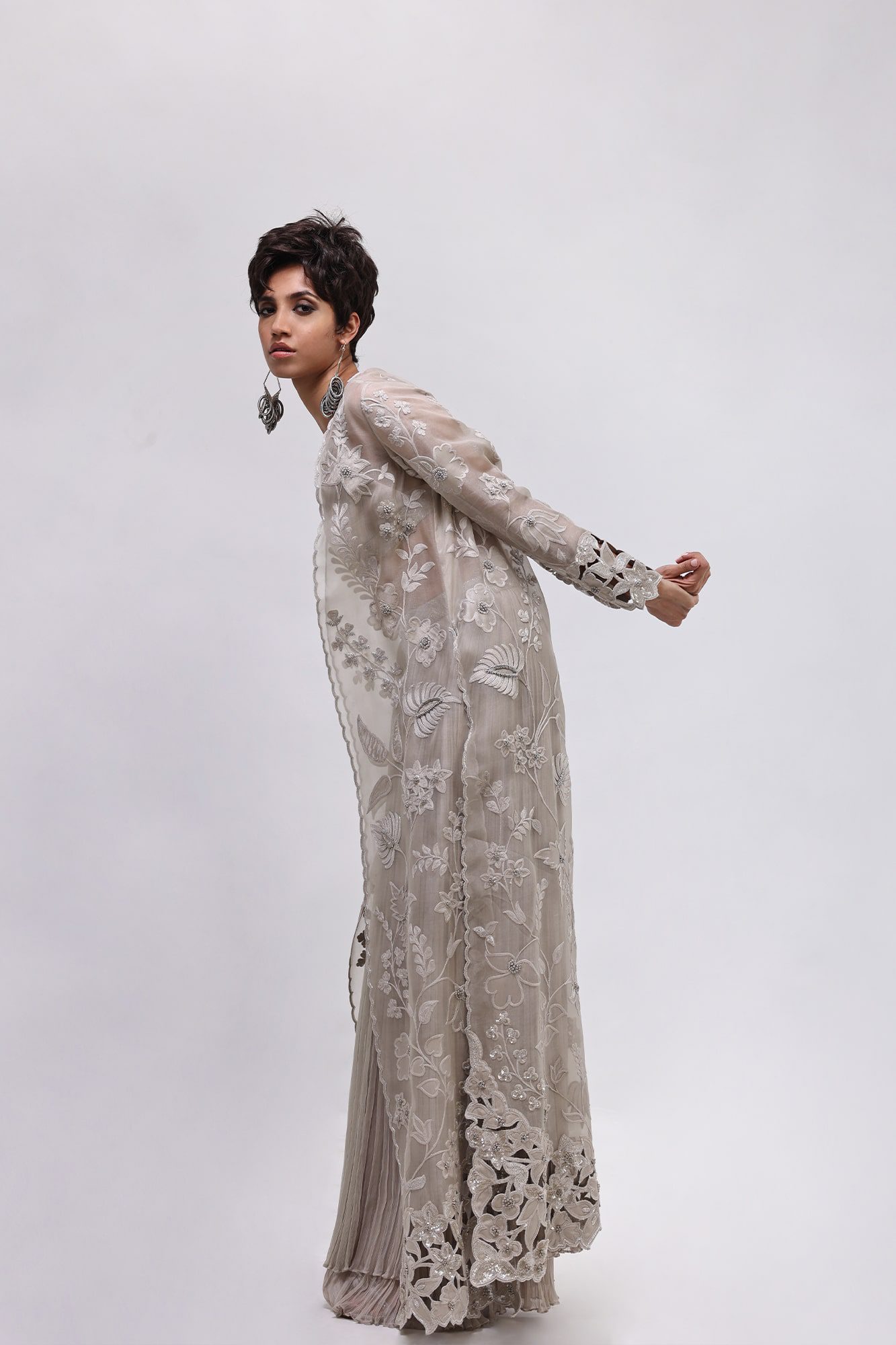 This 3 piece set in grey consists of a short textured chiffon blouse, embellished at its waistline complimented with a long organza jacket, featuring details like embroidered applique and cutwork on the sleeves and hem, with scalloped edges and finishing’s, paired with double layered textured chiffon flares
