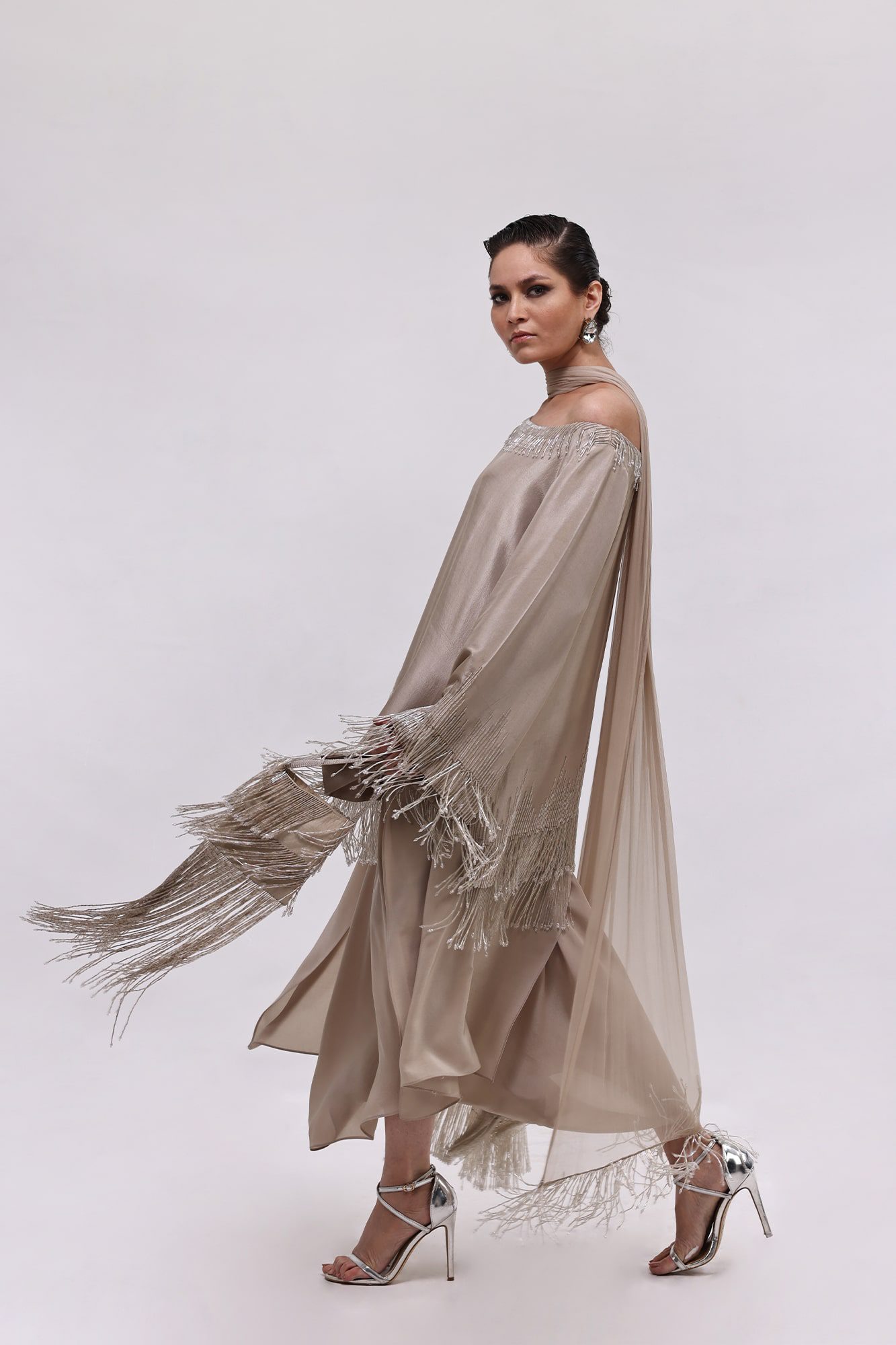 Draped beautifully in raw silk, with a beaded fringe embellished A-symmetrical neckline. The attire is further enhanced with an array of beaded fringes along the hem of the shirt, sleeves and duppatta. Paired with a draped dhoti shalwar.