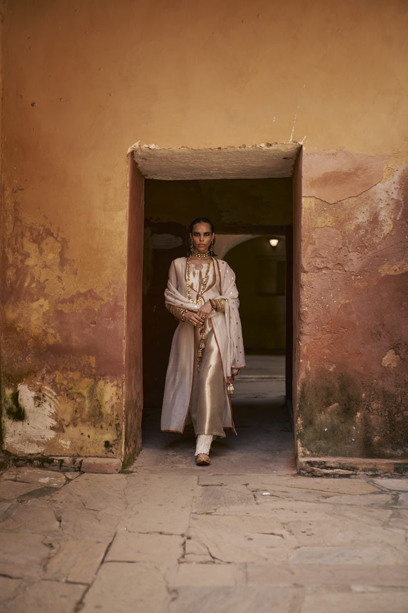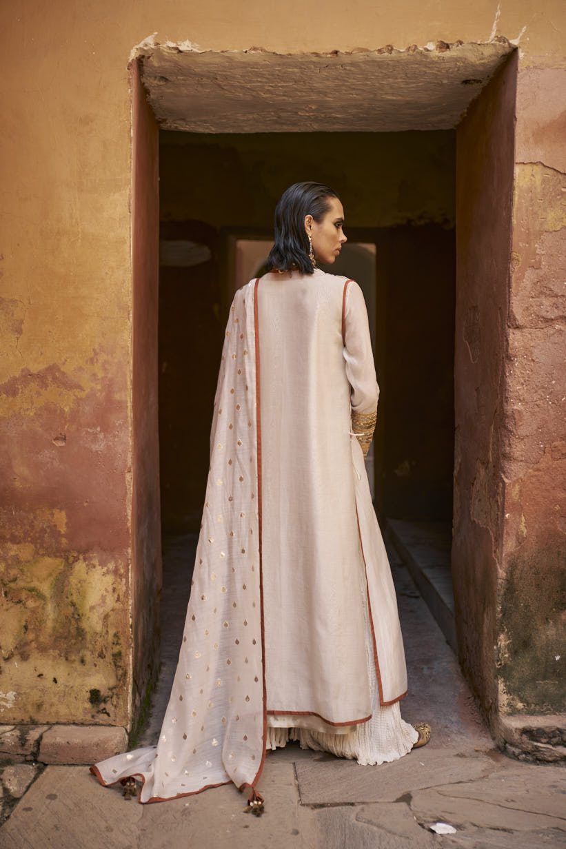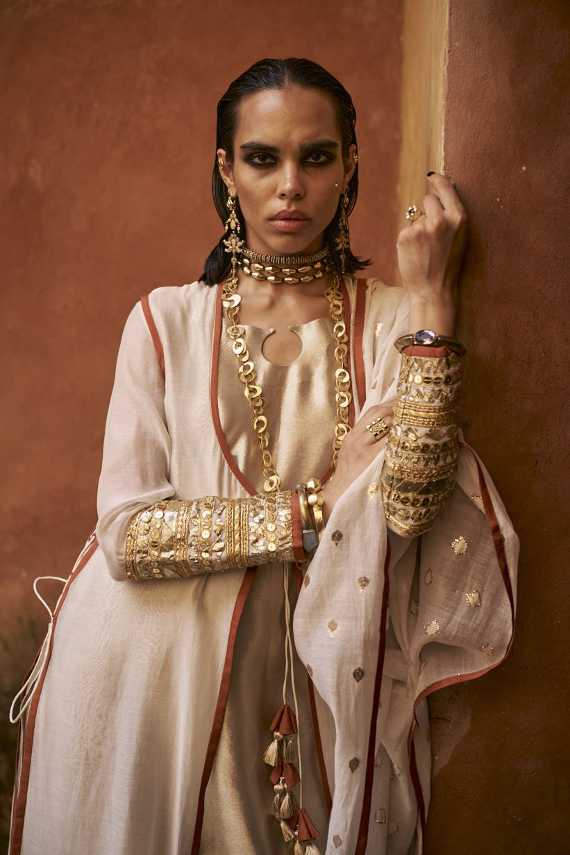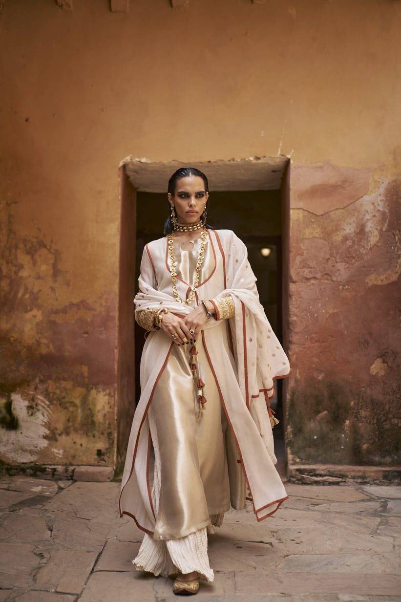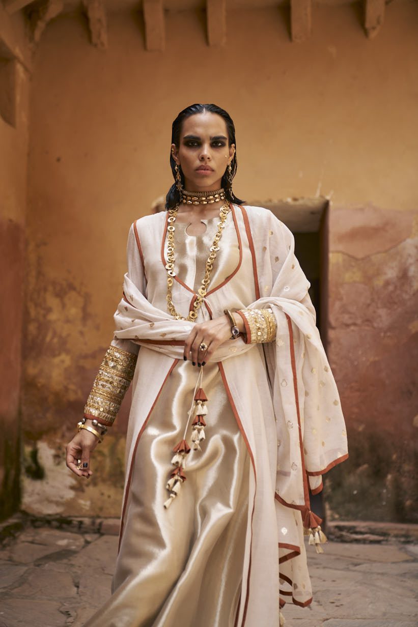 Shirt: Ivory pure cotton silk upper shirt with rust piping and tassels on sides and on the neckline, ivory pure lame tissue inner shirt with gota work on sleeves