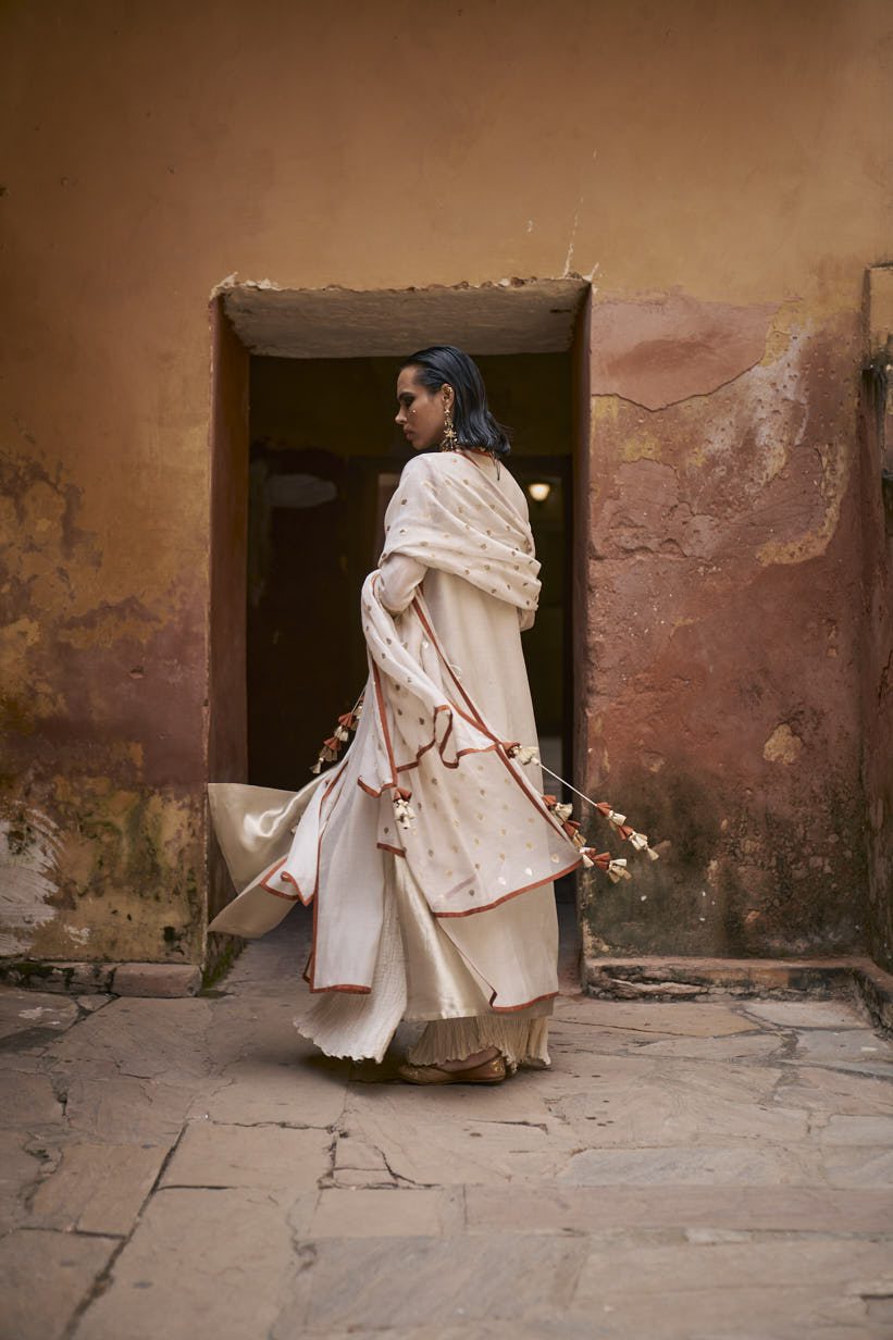 Dupatta: Ivory pure cotton silk with zari booties dupatta with four side rust piping