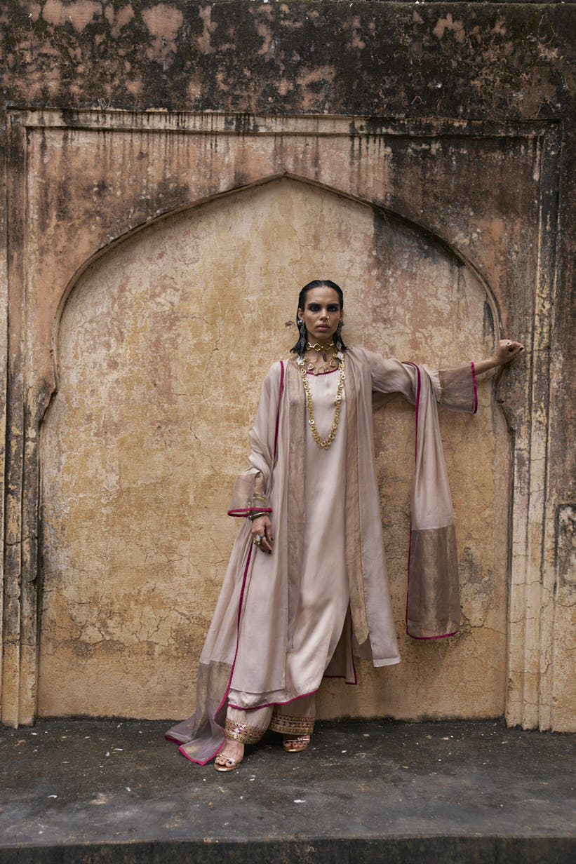 Bottom: Dusty pink pure khaddi silk ijaar with gota work and hot pink applique work