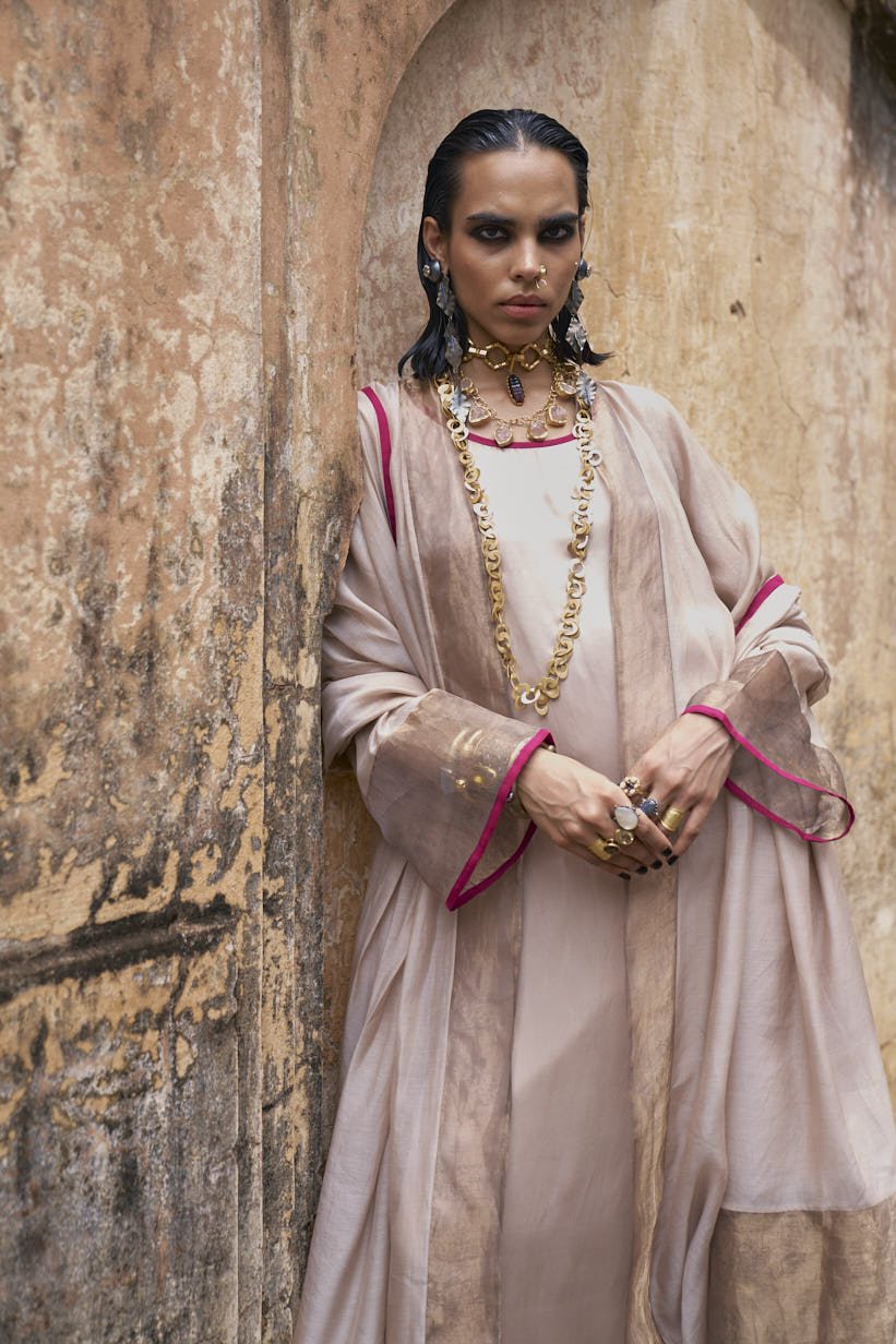 Dupatta: Dusty pink pure cotton silk dupatta with tissue silk on palloos and four side hot pink finishing