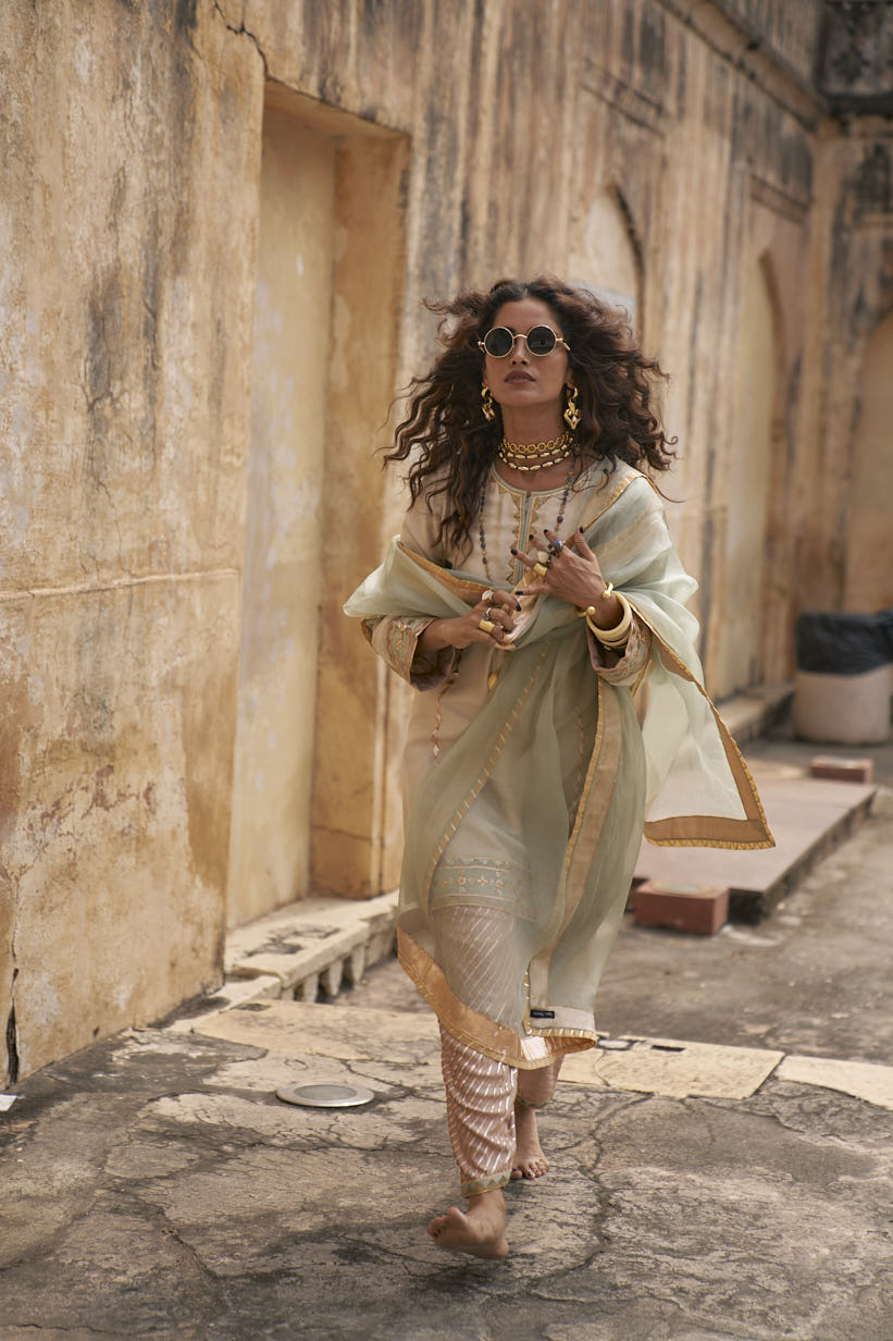 Dupatta: Mint green pure organza dupatta with four side gota finishing